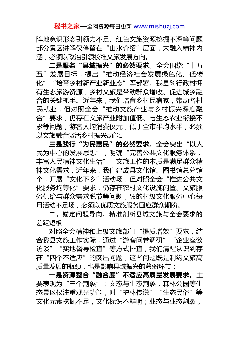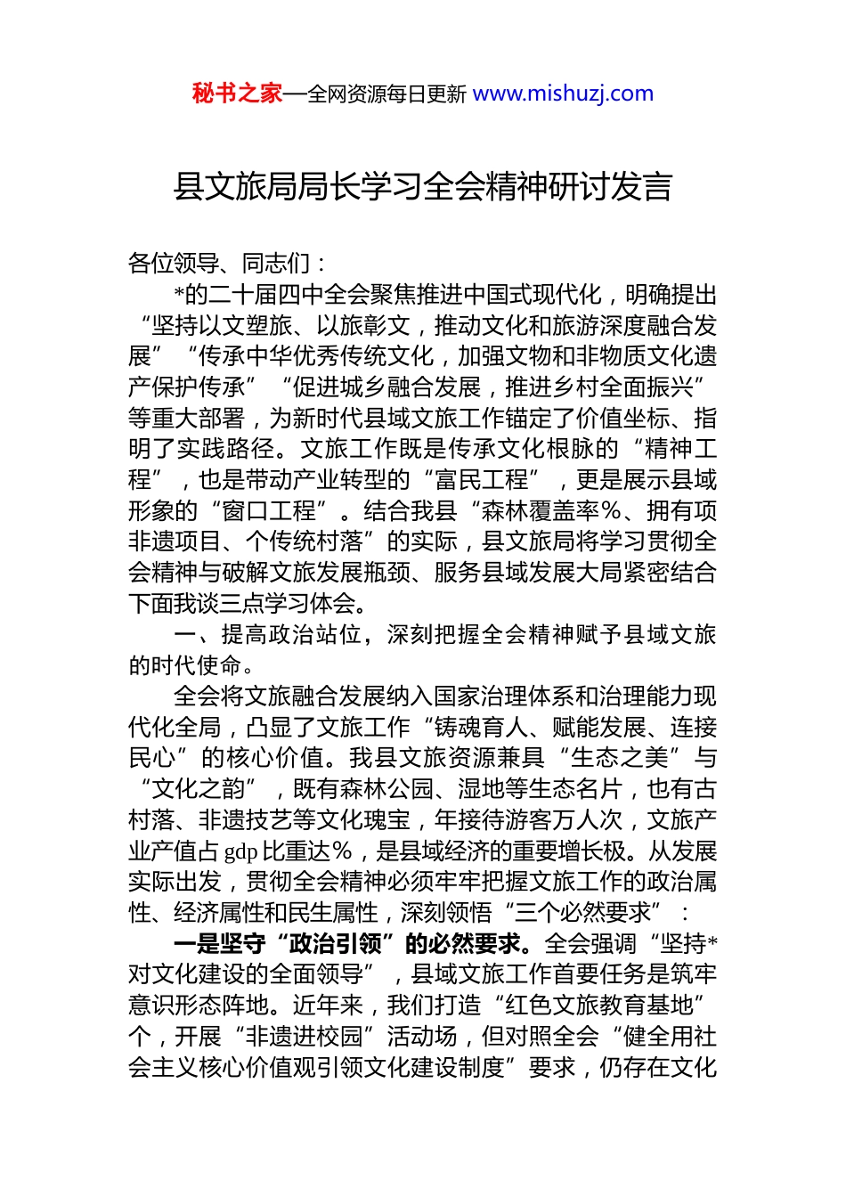 秘书之家—全网资源每日更新 www.mishuzj.com县文旅局局长学习全会精神研讨发言各位领导、同志们:*的二十届四中全会聚焦推进中国式现代化,明确提出“坚持以文塑旅、以旅彰文,推动文化和旅游深度融合发展”“传承中华优秀传统文化,加强文物和非物质文化遗产保护传承”“促进城乡融合发展,推进乡村全面振兴”等重大部署,为新时代县域文旅工作锚定了价值坐标、指明了实践路径。文旅工作既是传承文化根脉的“精神工程”,也是带动产业转型的“富民工程”,更是展示县域形象的“窗口工程”。结合我县“森林覆盖率%、拥有项非遗项目、个传统村落”的实际,县文旅局将学习贯彻全会精神与破解文旅发展瓶颈、服务县域发展大局紧密结合下面我谈三点学习体会。一、提高政治站位,深刻把握全会精神赋予县域文旅的时代使命。全会将文旅融合发展纳入国家治理体系和治理能力现代化全局,凸显了文旅工作“铸魂育人、赋能发展、连接民心”的核心价值。我县文旅资源兼具“生态之美”与“文化之韵”,既有森林公园、湿地等生态名片,也有古村落、非遗技艺等文化瑰宝,年接待游客万人次,文旅产业产值占 gdp 比重达%,是县域经济的重要增长极。从发展实际出发,贯彻全会精神必须牢牢把握文旅工作的政治属性、经济属性和民生属性,深刻领悟“三个必然要求”:一是坚守“政治引领”的必然要求。全会强调“坚持*对文化建设的全面领导”,县域文旅工作首要任务是筑牢意识形态阵地。近年来,我们打造“红色文旅教育基地”个,开展“非遗进校园”活动场,但对照全会“健全用社会主义核心价值观引领文化建设制度”要求,仍存在文化秘书之家—全网资源每日更新 www.mishuzj.com阵地意识形态引领力不足、红色文旅资源挖掘不深等问题部分景区讲解仅停留在“山水介绍”层面,未融入精神内涵,必须以政治引领校准文旅发展方向。二是服务“县域振兴”的必然要求。全会围绕“十五五”发展目标,提出“推动经济社会发展绿色化、低碳化”“培育乡村新产业新业态”等部署。我县%行政村拥有生态旅游资源,乡村文旅是带动群众增收、促进城乡融合的关键抓手。近年来,我们培育乡村民宿家,带动名村民就业,但对照全会“推动文旅产业与乡村振兴深度融合”要求,仍存在文旅产业附加值低、与生态农业衔接不紧等问题,游客人均消费仅元,低于全市平均水平,必须以文旅融合激活乡村振兴动能。三是践行“为民惠民”的必然要求。全会突出“以人民为中心的发展思想”,明确“完善公共文化服务体系,丰富人民精神文化生活”。文旅工作的本质是满足群众精神文化需求,近年来,我们建成县文化馆、图书馆总分馆个,开展“文化下乡”活动场,但对照全会“推进公共文化服务均等化”要求,仍存在农村文化设施闲置、文旅服务供给与群众需求脱节等问题,%的村级文化服务中心每月活动不足场,必须以优质文旅服务回应群众期盼。二、锚定问题导向,精准剖析县域文旅与全会要求的差距短板。对照全会精神和上级文旅部门“提质增效”要求,结合我县文旅工作实际,通过“游客问卷调研”“企业座谈访谈”“实地督导检查”等方式排查,我们清醒认识到存在“四个不适应”的突出问题,这些问题既是制约文旅高质量发展的瓶颈,也是影响县域振兴的薄弱环节:一是资源整合“融合度”不适应高质量发展要求。主要表现为“三个割裂”:文态与生态割裂,森林公园等生态景区仅注重观光功能,对“护林传说”“生态民俗”等文化元素挖掘不足,文化标识不鲜明;业态与业态割裂,秘书之家—全网资源每日更新 www.mishuzj.com文旅与农业、康养等产业融合浅表化,仅开发“采摘体验”“简单民宿”等初级产品,“生态研学”“康养旅居”等高端业态空白;景点与景点割裂,各景区缺乏统一规划,“各自为战”现象突出,未形成“一日游”“多日游”精品线路,游客停留时间平均不足天。二是品牌塑造“影响力”不适应市场竞争需求。呈现“三个不足”:ip 打造不足,虽有生态和文化资源,但未培育出“叫得响、记得住”的核心品牌,在全省乃至全国的知名度较低,去年省外游客占比仅%;宣传营销不足,仍以“线下推介会”“简单广告投放”为主,新媒体营销占比不足...