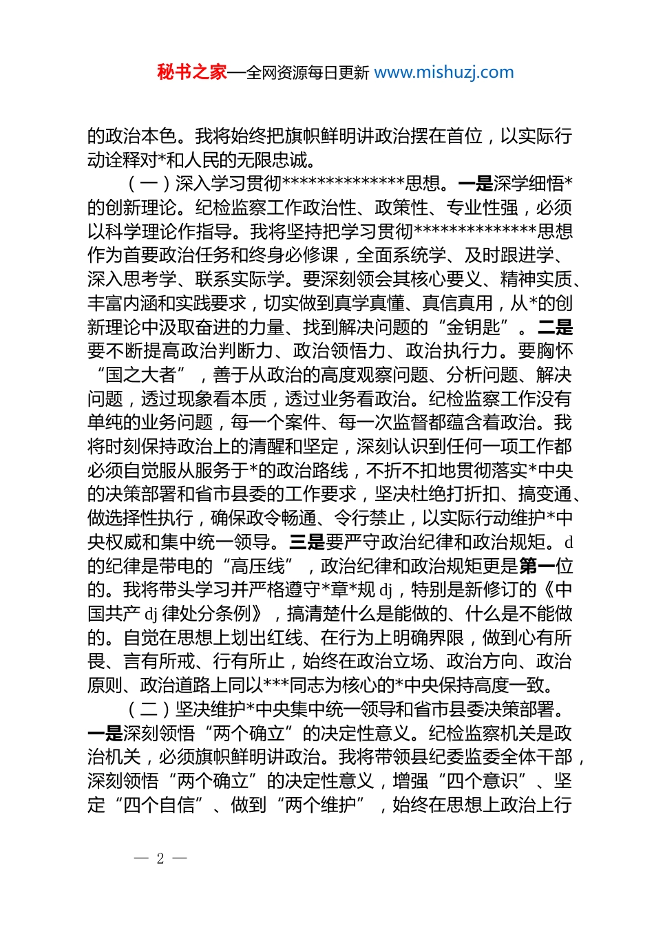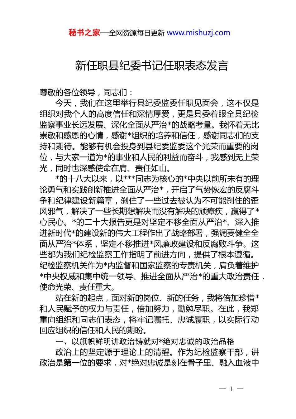 秘书之家—全网资源每日更新 www.mishuzj.com新任职县纪委书记任职表态发言尊敬的各位领导,同志们:今天,我们在这里举行县纪委监委任职见面会,这不仅是组织对我个人的高度信任和深情厚爱,更是县委着眼全县纪检监察事业长远发展、深化全面从严治*的战略考量。我怀着无比崇敬和感恩的心情,感谢*组织的培养和信任,感谢同志们的支持和期待。能够有机会投身到县纪委监委这个光荣而重要的岗位,与大家一道为*的事业和人民的利益而奋斗,我感到无上荣光,同时也深感使命在肩、责任如山。*的十八大以来,以***同志为核心的*中央以前所未有的理论勇气和实践创新推进全面从严治*,开启了气势恢宏的反腐斗争和纪律建设新篇章,刹住了一些过去被认为不可能刹住的歪风邪气,解决了一些长期想解决而没有解决的顽瘴疾,赢得了*心民心。*的二十大报告更是对坚定不移全面从严治*、深入推进新时代*的建设新的伟大工程作出了战略部署,强调要健全全面从严治*体系,坚定不移推进*风廉政建设和反腐败斗争。这些都为我们纪检监察工作指明了前进方向,提供了根本遵循。纪检监察机关作为*内监督和国家监察的专责机关,肩负着维护*中央权威和集中统一领导、推进全面从严治*的重大政治责任,使命光荣、责任重大。站在新的起点,面对新的岗位、新的任务,我将倍加珍惜*和人民赋予的权力与责任,倍加努力,勤勉尽职。在此,我郑重向组织和同志们表态,将牢记嘱托、忠诚履职,以实际行动回应组织的信任和人民的期盼。一、以旗帜鲜明讲政治铸就对*绝对忠诚的政治品格政治上的坚定源于理论上的清醒。作为纪检监察干部,讲政治是第一位的要求,对*绝对忠诚是刻在骨子里、融入血液中— 1 —秘书之家—全网资源每日更新 www.mishuzj.com的政治本色。我将始终把旗帜鲜明讲政治摆在首位,以实际行动诠释对*和人民的无限忠诚。(一)深入学习贯彻**************思想。一是深学细悟*的创新理论。纪检监察工作政治性、政策性、专业性强,必须以科学理论作指导。我将坚持把学习贯彻**************思想作为首要政治任务和终身必修课,全面系统学、及时跟进学、深入思考学、联系实际学。要深刻领会其核心要义、精神实质、丰富内涵和实践要求,切实做到真学真懂、真信真用,从*的创新理论中汲取奋进的力量、找到解决问题的“金钥匙”。二是要不断提高政治判断力、政治领悟力、政治执行力。要胸怀“国之大者”,善于从政治的高度观察问题、分析问题、解决问题,透过现象看本质,透过业务看政治。纪检监察工作没有单纯的业务问题,每一个案件、每一次监督都蕴含着政治。我将时刻保持政治上的清醒和坚定,深刻认识到任何一项工作都必须自觉服从服务于*的政治路线,不折不扣地贯彻落实*中央的决策部署和省市县委的工作要求,坚决杜绝打折扣、搞变通、做选择性执行,确保政令畅通、令行禁止,以实际行动维护*中央权威和集中统一领导。三是要严守政治纪律和政治规矩。d的纪律是带电的“高压线”,政治纪律和政治规矩更是第一位的。我将带头学习并严格遵守*章*规 dj,特别是新修订的《中国共产 dj 律处分条例》,搞清楚什么是能做的、什么是不能做的。自觉在思想上划出红线、在行为上明确界限,做到心有所畏、言有所戒、行有所止,始终在政治立场、政治方向、政治原则、政治道路上同以***同志为核心的*中央保持高度一致。(二)坚决维护*中央集中统一领导和省市县委决策部署。一是深刻领悟“两个确立”的决定性意义。纪检监察机关是政治机关,必须旗帜鲜明讲政治。我将带领县纪委监委全体干部,深刻领悟“两个确立”的决定性意义,增强“四个意识”、坚定“四个自信”、做到“两个维护”,始终在思想上政治上行— 2 —秘书之家—全网资源每日更新 www.mishuzj.com动上同*中央保持高度一致,把维护*中央集中统一领导作为最高政治原则和根本政治责任,落实到纪检监察工作的全过程各方面。二是要确保政令畅通、令行禁止。我们将围绕县委的中心工作和重大决策部署,加强政治监督,督促各级*组织和*员干部不折不扣地贯彻执行。对贯彻落实中的形式主义、官僚主义等问题,要坚决查处、严肃问责,确保县委各项工作部署落地生根...