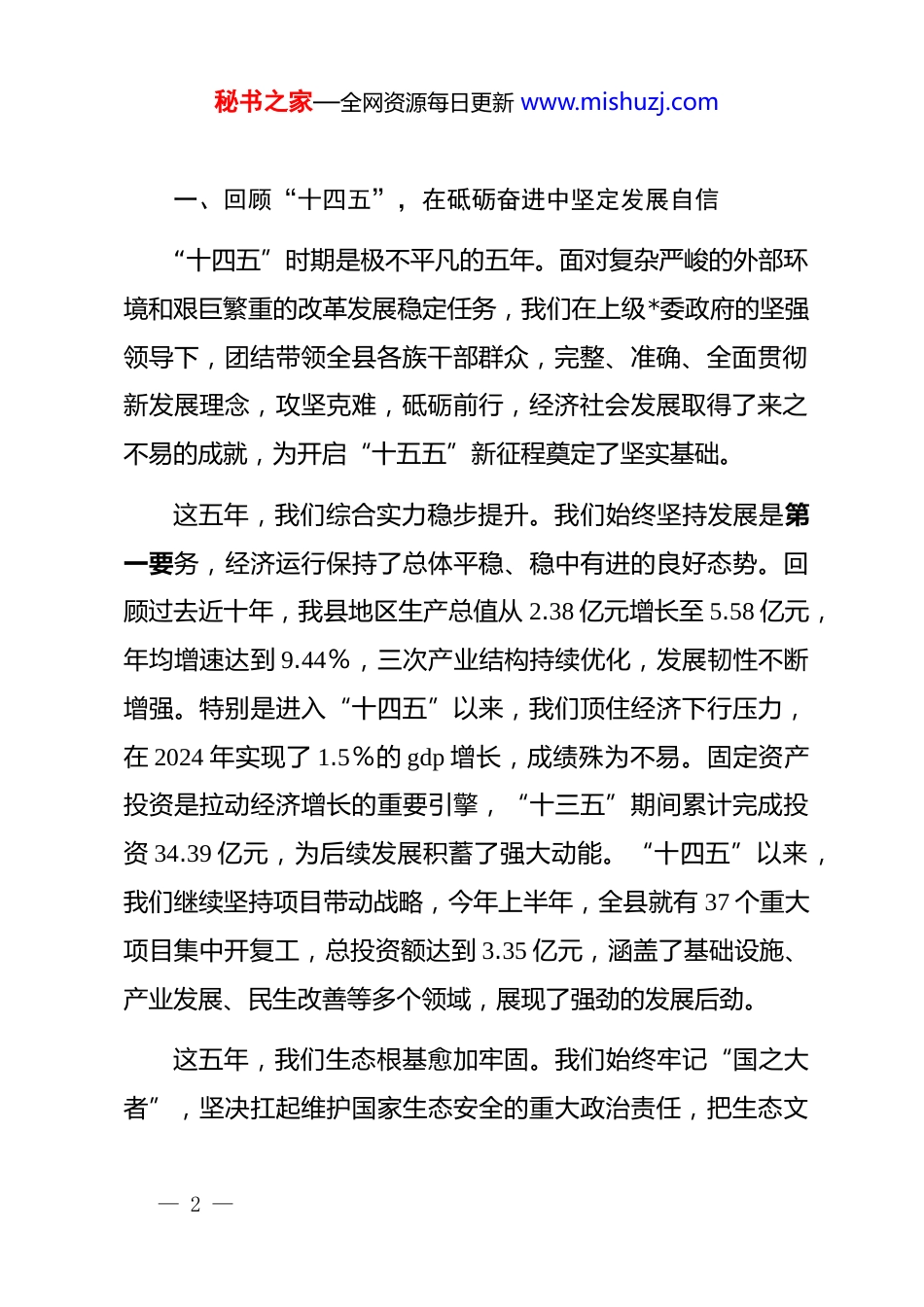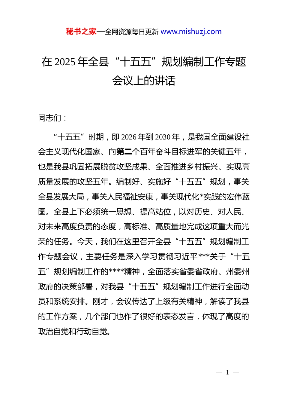 秘书之家—全网资源每日更新 www.mishuzj.com在 2025 年全县“十五五”规划编制工作专题会议上的讲话同志们:“十五五”时期,即 2026 年到 2030 年,是我国全面建设社会主义现代化国家、向第二个百年奋斗目标进军的关键五年,也是我县巩固拓展脱贫攻坚成果、全面推进乡村振兴、实现高质量发展的攻坚五年。编制好、实施好“十五五”规划,事关全县发展大局,事关人民福祉安康,事关现代化*实践的宏伟蓝图。全县上下必须统一思想、提高站位,以对历史、对人民、对未来高度负责的态度,高标准、高质量地完成这项重大而光荣的任务。今天,我们在这里召开全县“十五五”规划编制工作专题会议,主要任务是深入学习贯彻习近平***关于“十五五”规划编制工作的****精神,全面落实省委省政府、州委州政府的决策部署,对我县“十五五”规划编制工作进行全面动员和系统安排。刚才,会议传达了上级有关精神,解读了我县的工作方案,几个部门也作了很好的表态发言,体现了高度的政治自觉和行动自觉。— 1 —秘书之家—全网资源每日更新 www.mishuzj.com一、回顾“十四五”,在砥砺奋进中坚定发展自信“十四五”时期是极不平凡的五年。面对复杂严峻的外部环境和艰巨繁重的改革发展稳定任务,我们在上级*委政府的坚强领导下,团结带领全县各族干部群众,完整、准确、全面贯彻新发展理念,攻坚克难,砥砺前行,经济社会发展取得了来之不易的成就,为开启“十五五”新征程奠定了坚实基础。这五年,我们综合实力稳步提升。我们始终坚持发展是第一要务,经济运行保持了总体平稳、稳中有进的良好态势。回顾过去近十年,我县地区生产总值从 2.38 亿元增长至 5.58 亿元,年均增速达到 9.44%,三次产业结构持续优化,发展韧性不断增强。特别是进入“十四五”以来,我们顶住经济下行压力,在 2024 年实现了 1.5%的 gdp 增长,成绩殊为不易。固定资产投资是拉动经济增长的重要引擎,“十三五”期间累计完成投资 34.39 亿元,为后续发展积蓄了强大动能。“十四五”以来,我们继续坚持项目带动战略,今年上半年,全县就有 37 个重大项目集中开复工,总投资额达到 3.35 亿元,涵盖了基础设施、产业发展、民生改善等多个领域,展现了强劲的发展后劲。这五年,我们生态根基愈加牢固。我们始终牢记“国之大者”,坚决扛起维护国家生态安全的重大政治责任,把生态文— 2 —秘书之家—全网资源每日更新 www.mishuzj.com明建设摆在全局工作的突出位置。我们坚持山水林田湖草沙一体化保护和系统治理,自 2022 年以来,累计投入 1.03 亿元实施重要生态系统保护和修复重大工程。“十四五”期间,仅生态建设领域的投资就超过 2163 万元,完成了大规模的人工造林和封山育林任务。总投资 1.78 亿元的*河、*河流域水环境治理与生态恢复工程全面竣工,总投资 1.89 亿元的*河、*河流域水环境与生态综合治理工程顺利开工。这些项目的实施,使我县的草原综合植被盖度稳步提升至近 70%,生态环境质量持续向好,成功守护了这一方净土的蓝天、碧水、净土。这五年,我们产业特色更加鲜明。我们立足资源禀赋,坚持走生态优先、绿色发展的产业化道路,初步构建了具有高原特色的生态产业体系。特别是以“*牦牛”为代表的生态畜牧业,已经形成了集牦牛养殖、饲草种植、活畜交易、屠宰加工、奶制品生产和有机肥加工于一体的全产业链发展模式。截至 2022年底,全县牦牛存栏量达到 28 万头,农牧业总产值实现 2.38 亿元。我们成功引进了我县*生态农牧科技有限公司,其日加工20 吨鲜牦牛奶的能力,标志着我县畜产品精深加工迈上了新台阶。同时,我们建成了年加工能力 5 万吨的有机肥厂,探索出“饲草种植—牦牛养殖—废弃物处理—有机肥生产”的绿色循— 3 —秘书之家—全网资源每日更新 www.mishuzj.com环模式,实现了经济效益和生态效益的双赢。“*牦牛”成功获得国家农产品地理标志登记保护,品牌价值日益凸显。这五年,我们民生福祉持续增进。我们始终坚持以人民为中心的发展思想,财政支出的绝大部分都用于民生领域,用心用情用力解决群众急难愁盼问题。教育、医疗、就业、社保...