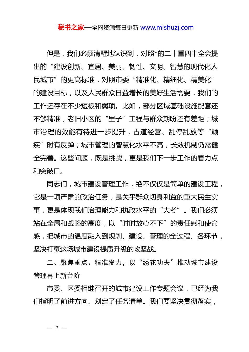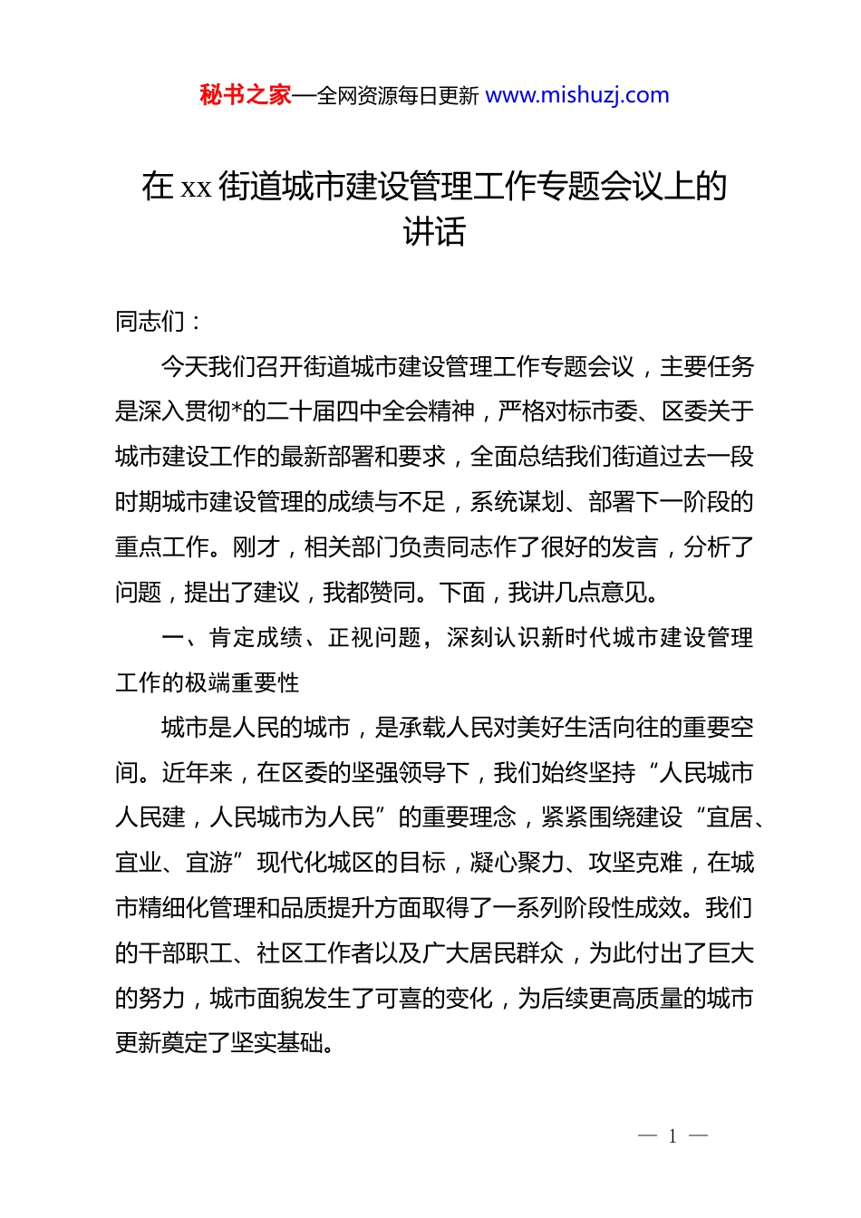 秘书之家—全网资源每日更新 www.mishuzj.com在 xx 街道城市建设管理工作专题会议上的讲话同志们:今天我们召开街道城市建设管理工作专题会议,主要任务是深入贯彻*的二十届四中全会精神,严格对标市委、区委关于城市建设工作的最新部署和要求,全面总结我们街道过去一段时期城市建设管理的成绩与不足,系统谋划、部署下一阶段的重点工作。刚才,相关部门负责同志作了很好的发言,分析了问题,提出了建议,我都赞同。下面,我讲几点意见。一、肯定成绩、正视问题,深刻认识新时代城市建设管理工作的极端重要性城市是人民的城市,是承载人民对美好生活向往的重要空间。近年来,在区委的坚强领导下,我们始终坚持“人民城市人民建,人民城市为人民”的重要理念,紧紧围绕建设“宜居、宜业、宜游”现代化城区的目标,凝心聚力、攻坚克难,在城市精细化管理和品质提升方面取得了一系列阶段性成效。我们的干部职工、社区工作者以及广大居民群众,为此付出了巨大的努力,城市面貌发生了可喜的变化,为后续更高质量的城市更新奠定了坚实基础。— 1 —秘书之家—全网资源每日更新 www.mishuzj.com但是,我们必须清醒地认识到,对照*的二十重四中全会提出的“建设创新、宜居、美丽、韧性、文明、智慧的现代化人民城市”的更高标准,对照市委“精准化、精细化、精美化”的建设目标,以及人民群众日益增长的美好生活需要,我们的工作还存在不少短板和弱项。比如,部分区域基础设施配套还不够精准,老旧小区的“里子”工程与群众期盼还有差距;城市治理的效能有待进一步提升,占道经营、乱停乱放等“顽疾”时有反弹;城市管理的智慧化水平不高,长效机制仍需健全完善。这些问题,既是挑战,更是我们下一步工作的着力点和突破口。同志们,城市建设管理工作,绝不仅仅是简单的建设工程,它是一项严肃的政治任务,是关乎群众切身利益的重大民生实事,更是体现我们治理能力和执政水平的“大考”。我们必须站在全局和战略的高度,以“时时放心不下”的责任感和使命感,把城市的温度融入到规划、建设、管理的全过程、各环节,坚决打赢这场城市建设提质升级的攻坚战。二、聚焦重点、精准发力,以“绣花功夫”推动城市建设管理再上新台阶市委、区委相继召开的城市建设工作专题会议,已经为我们指明了前进方向、划定了任务清单。我们要坚决贯彻落实,— 2 —秘书之家—全网资源每日更新 www.mishuzj.com结合街道实际,突出重点,统筹推进,确保各项部署不折不扣落到实处。(一)坚持问题导向,用脚步丈量民情,提升市容治理精度。城市管理的好坏,群众最有发言权。我们要深入践行“脚步丈量法”,街道班子成员、各科室、各社区负责人要带头沉到一线,用自己的脚步去发现问题,用自己的眼睛去审视不足。要严格按照区委“五个细”的要求,聚焦占道经营、环境卫生、广告牌匾等市容管理的重点难点问题,拿出“绣花”般的细心和耐心,一针一线地解决问题。针对占道经营现象,要进一步完善“定点值守与错时巡查”相结合的工作机制,加大对重点路段、重点时段的管控力度,疏堵结合,规范一批、取缔一批,探索设置便民疏导点,在保障民生的同时维护市容秩序。(二)深化城市更新,做实“里子”工程,增强群众获得感。城市更新,不能只做表面文章,更要下大力气解决群众最关心的“里子”问题。我们必须坚决杜绝“重面子、轻里子”的倾向。在老旧小区改造方面,要将工作重心从“有没有”转向“好不好”。据不完全统计,过去几年,我们街道已累计投入超过 1.2 亿元资金,完成了对辖区内 32 个老旧小区的改造,惠及居民约 9500 户。下一步,我们要在此基础上,将改造工作与民生需求更深度地绑定,同步推进燃气管道更新、电梯加装、— 3 —秘书之家—全网资源每日更新 www.mishuzj.com雨污分流、基础设施升级和“飞线入地”等工程。要特别关注背街小巷、城乡结合部等薄弱环节,因地制宜地开展微空间、微景观提质,补齐绿化、照明等短板,真正把钱花在刀刃上,让居民感受到“住有宜居”的实在变化。(三)破解交通难题,强化联动共治,构筑畅通有序微循环。交通是城市的血脉,“出行难”是当前群众反...