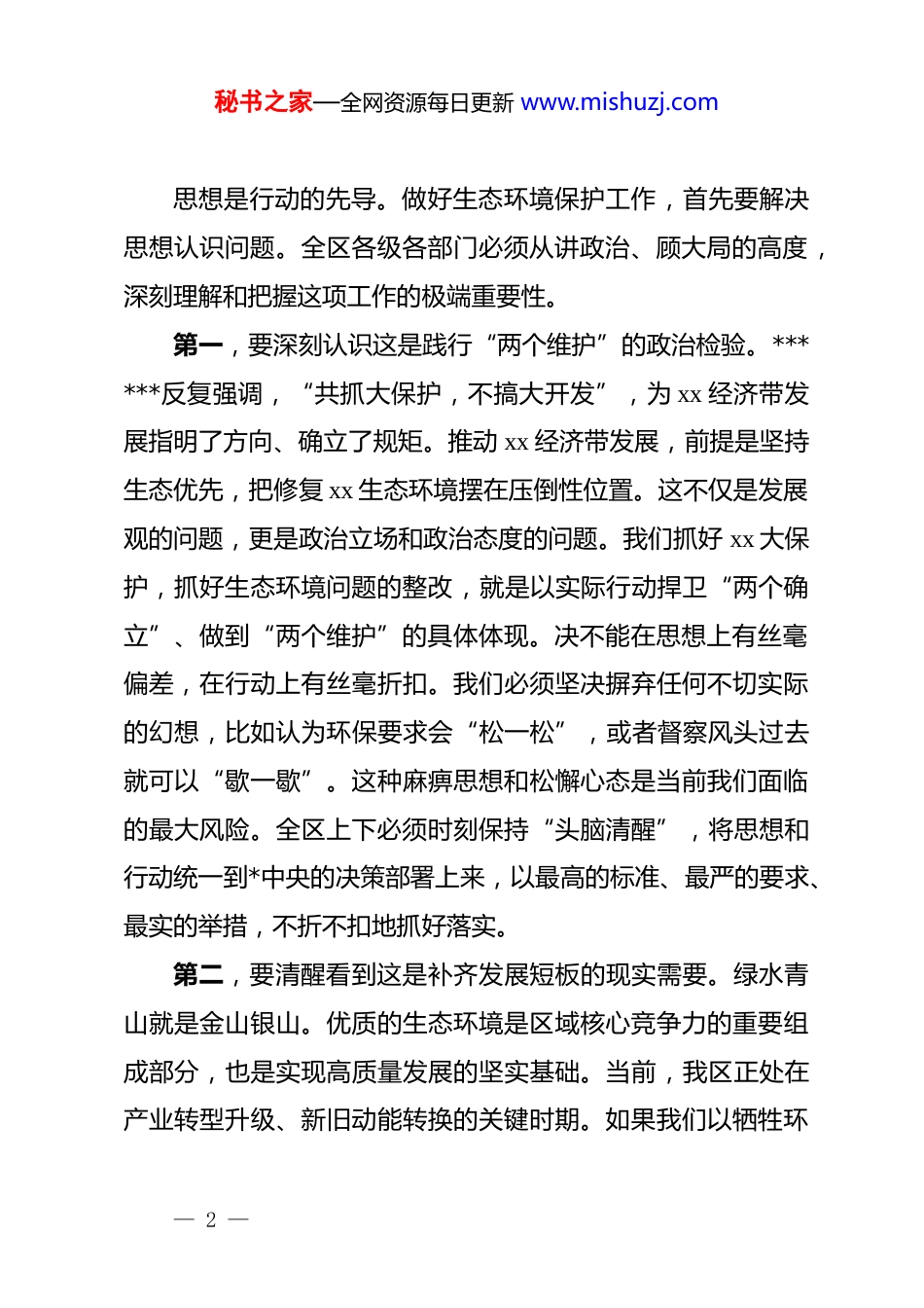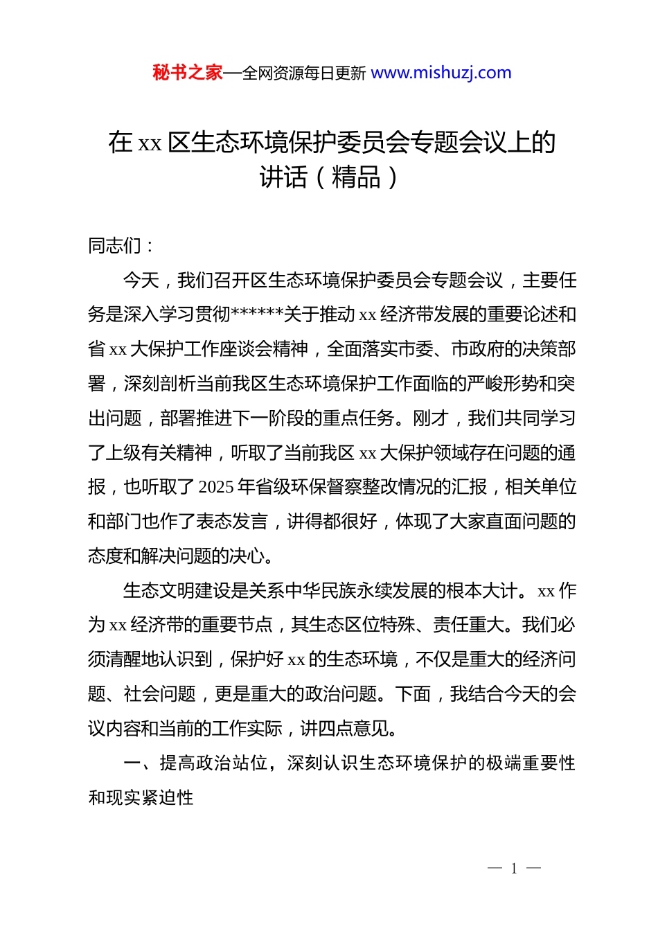 秘书之家—全网资源每日更新 www.mishuzj.com在 xx 区生态环境保护委员会专题会议上的讲话(精品)同志们:今天,我们召开区生态环境保护委员会专题会议,主要任务是深入学习贯彻******关于推动 xx 经济带发展的重要论述和省 xx 大保护工作座谈会精神,全面落实市委、市政府的决策部署,深刻剖析当前我区生态环境保护工作面临的严峻形势和突出问题,部署推进下一阶段的重点任务。刚才,我们共同学习了上级有关精神,听取了当前我区 xx 大保护领域存在问题的通报,也听取了 2025 年省级环保督察整改情况的汇报,相关单位和部门也作了表态发言,讲得都很好,体现了大家直面问题的态度和解决问题的决心。生态文明建设是关系中华民族永续发展的根本大计。xx 作为 xx 经济带的重要节点,其生态区位特殊、责任重大。我们必须清醒地认识到,保护好 xx 的生态环境,不仅是重大的经济问题、社会问题,更是重大的政治问题。下面,我结合今天的会议内容和当前的工作实际,讲四点意见。一、提高政治站位,深刻认识生态环境保护的极端重要性和现实紧迫性— 1 —秘书之家—全网资源每日更新 www.mishuzj.com思想是行动的先导。做好生态环境保护工作,首先要解决思想认识问题。全区各级各部门必须从讲政治、顾大局的高度,深刻理解和把握这项工作的极端重要性。第一,要深刻认识这是践行“两个维护”的政治检验。******反复强调,“共抓大保护,不搞大开发”,为 xx 经济带发展指明了方向、确立了规矩。推动 xx 经济带发展,前提是坚持生态优先,把修复 xx 生态环境摆在压倒性位置。这不仅是发展观的问题,更是政治立场和政治态度的问题。我们抓好 xx 大保护,抓好生态环境问题的整改,就是以实际行动捍卫“两个确立”、做到“两个维护”的具体体现。决不能在思想上有丝毫偏差,在行动上有丝毫折扣。我们必须坚决摒弃任何不切实际的幻想,比如认为环保要求会“松一松”,或者督察风头过去就可以“歇一歇”。这种麻痹思想和松懈心态是当前我们面临的最大风险。全区上下必须时刻保持“头脑清醒”,将思想和行动统一到*中央的决策部署上来,以最高的标准、最严的要求、最实的举措,不折不扣地抓好落实。第二,要清醒看到这是补齐发展短板的现实需要。绿水青山就是金山银山。优质的生态环境是区域核心竞争力的重要组成部分,也是实现高质量发展的坚实基础。当前,我区正处在产业转型升级、新旧动能转换的关键时期。如果我们以牺牲环— 2 —秘书之家—全网资源每日更新 www.mishuzj.com境为代价换取一时的经济增长,那不仅是不可持续的,更是得不偿失的。人民群众对优美生态环境的期盼日益强烈,好的生态本身就是最好的营商环境,能够吸引更多优质的企业、高端的人才落户 xx。反之,如果我们的环境问题突出,污水横流、空气污浊,不仅会影响群众的幸福感和获得感,也会严重制约我们的招商引资和长远发展。因此,抓环保就是抓发展,抓保护就是抓未来。必须把生态环境保护工作摆在更加突出的位置,作为推动我区经济社会高质量发展的内在要求和重要抓手。第三,要直面审视这是解决突出问题的紧迫任务。尽管近年来我们做了一些工作,取得了一些成效,但必须清醒地看到,我区生态环境保护工作依然面临着严峻的形势和艰巨的任务。从刚才通报的情况看,无论是 2025 年省级环保督察反馈的问题,还是群众反复投诉举报的信访件,都反映出我们的工作还存在不少短板和漏洞。根据相关数据分析,截至 2025 年 6 月,全区环保督察整改任务完成率约为 81.25%,这意味着仍有近五分之一的问题尚未按期完成整改,这些都是难啃的“硬骨头”。尤其是在 xx 大保护领域,一些深层次、结构性问题尚未得到根本解决。例如,部分河流水质不稳定,在特定时期存在氨氮、总磷等指标超标的风险;一些老旧工业区的“散乱污”企业整治不够彻底,存在死灰复燃的现象;农业面源污染问题日益凸显,— 3 —秘书之家—全网资源每日更新 www.mishuzj.com化肥农药的过量使用对土壤和水体造成了持续压力;部分区域生活污水管网覆盖不全,存在雨污混流、污水直排等问题。这些问题,既有历史遗留的沉疴...