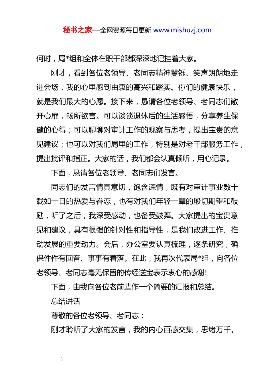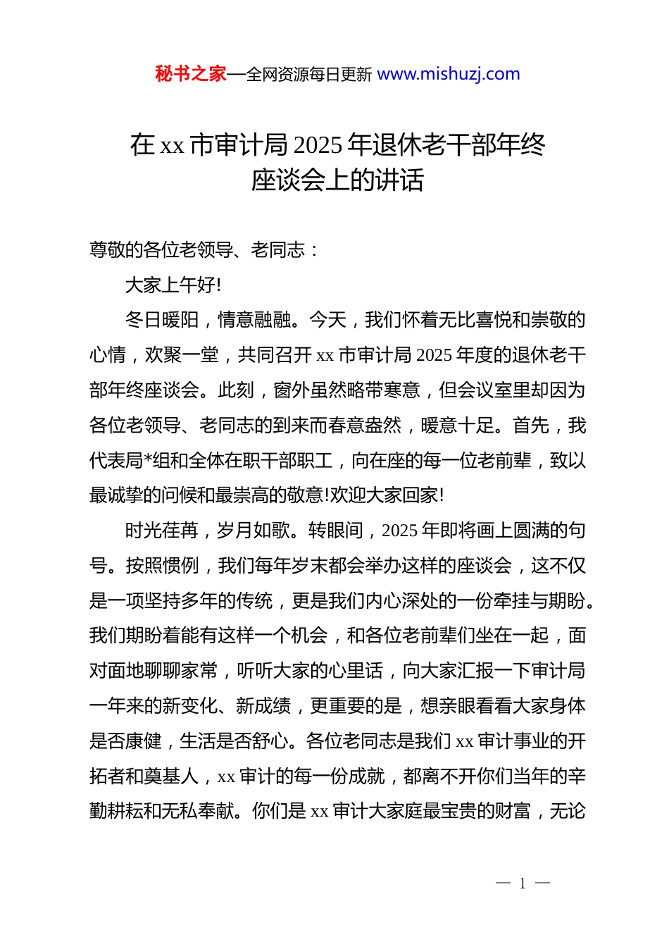秘书之家—全网资源每日更新 www.mishuzj.com在 xx 市审计局 2025 年退休老干部年终座谈会上的讲话尊敬的各位老领导、老同志:大家上午好!冬日暖阳,情意融融。今天,我们怀着无比喜悦和崇敬的心情,欢聚一堂,共同召开 xx 市审计局 2025 年度的退休老干部年终座谈会。此刻,窗外虽然略带寒意,但会议室里却因为各位老领导、老同志的到来而春意盎然,暖意十足。首先,我代表局*组和全体在职干部职工,向在座的每一位老前辈,致以最诚挚的问候和最崇高的敬意!欢迎大家回家!时光荏苒,岁月如歌。转眼间,2025 年即将画上圆满的句号。按照惯例,我们每年岁末都会举办这样的座谈会,这不仅是一项坚持多年的传统,更是我们内心深处的一份牵挂与期盼。我们期盼着能有这样一个机会,和各位老前辈们坐在一起,面对面地聊聊家常,听听大家的心里话,向大家汇报一下审计局一年来的新变化、新成绩,更重要的是,想亲眼看看大家身体是否康健,生活是否舒心。各位老同志是我们 xx 审计事业的开拓者和奠基人,xx 审计的每一份成就,都离不开你们当年的辛勤耕耘和无私奉献。你们是 xx 审计大家庭最宝贵的财富,无论— 1 —秘书之家—全网资源每日更新 www.mishuzj.com何时,局*组和全体在职干部都深深地记挂着大家。刚才,看到各位老领导、老同志精神矍铄、笑声朗朗地走进会场,我的心里感到由衷的高兴和踏实。你们的健康快乐,就是我们最大的心愿。接下来,恳请各位老领导、老同志们敞开心扉,畅所欲言。可以谈谈退休后的生活感悟,分享养生保健的心得;可以聊聊对审计工作的观察与思考,提出宝贵的意见建议;也可以对我们局里的工作,特别是对老干部服务工作,提出批评和指正。大家的话,我们都会认真倾听,用心记录。下面,恳请各位老领导、老同志们发言。同志们的发言情真意切,饱含深情,既有对审计事业数十载如一日的热爱与眷恋,也有对我们年轻一辈的殷切期望和鼓励,听了之后,我深受感动,也备受鼓舞。大家提出的宝贵意见和建议,具有很强的针对性和指导性,是我们改进工作、推动发展的重要动力。会后,办公室要认真梳理,逐条研究,确保件件有回音、事事有着落。在此,我再次代表局*组,向各位老领导、老同志毫无保留的传经送宝表示衷心的感谢!下面,由我向各位老前辈作一个简要的汇报和总结。总结讲话尊敬的各位老领导、老同志:刚才聆听了大家的发言,我的内心百感交集,思绪万千。— 2 —秘书之家—全网资源每日更新 www.mishuzj.com每一位老前辈的职业生涯,都是一部生动的奋斗史,都深刻地烙印在 xx 审计事业的发展历程中。你们在各自的岗位上,用几十年的光阴,诠释了什么是忠诚、什么是担当、什么是奉献。xx 审计能有今天的局面,离不开一代代审计人的接续奋斗,而你们,正是这支光荣队伍的先行者和主力军。你们身上那种“特别能吃苦、特别能战斗、特别能奉献”的审计精神,早已融入了 xx 审计的血脉,成为我们砥砺前行的不竭动力。一、回首 2025,我们在传承中奋进中开启审计新篇章借此机会,我向各位老前辈汇报一下 2025 年 xx 市审计局的主要工作情况。这一年,我们始终牢记经济监督的职责使命,在市委、市政府的坚强领导和上级审计机关的有力指导下,紧紧围绕全市经济社会发展大局,依法全面履行审计监督职责,各项工作都取得了新的进展和成效。一是聚焦主责主业,审计监督质效持续提升。我们紧扣高质量发展这个首要任务,圆满完成了对市级财政管理、部门预算执行、重大政策落实、政府投资项目等领域的审计任务。特别是在防范化解重大风险、保障和改善民生、促进权力规范运行等方面,我们提交的一批审计报告和专项调查报告,得到了市委、市政府主要领导的高度重视和****。例如,在对某项民生资金的审计中,我们不仅揭示了资金使用中的不规范问题,— 3 —秘书之家—全网资源每日更新 www.mishuzj.com更通过深入分析,提出了优化资金分配和监管的长效机制建议,推动了相关政策的完善,确保了每一分“民生钱”都用在刀刃上。这些成绩的取得,正是我们传承了老同志们求真务实、精益求精的优良作风,才能在复杂的经济活动中看得深、查得透、说...