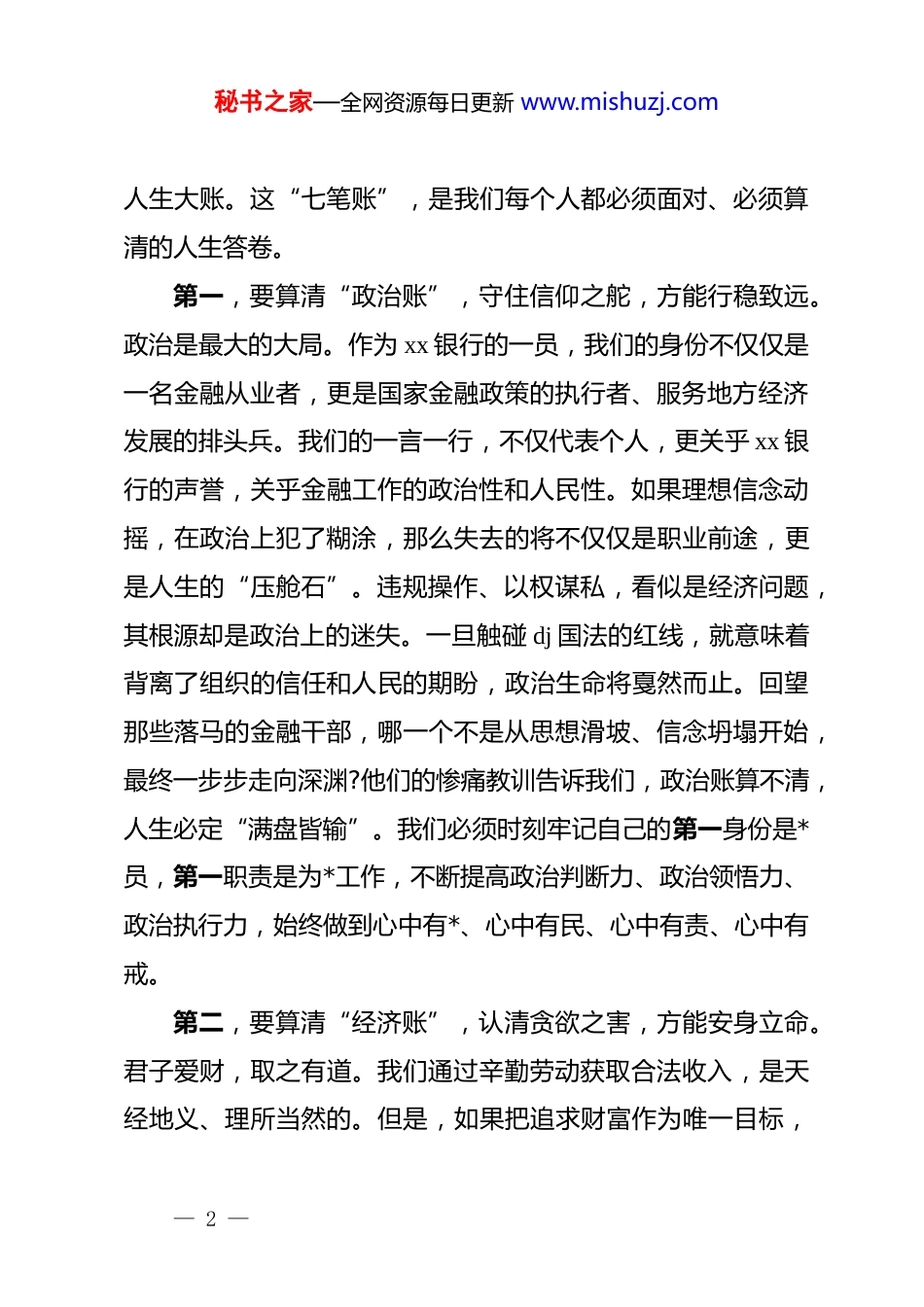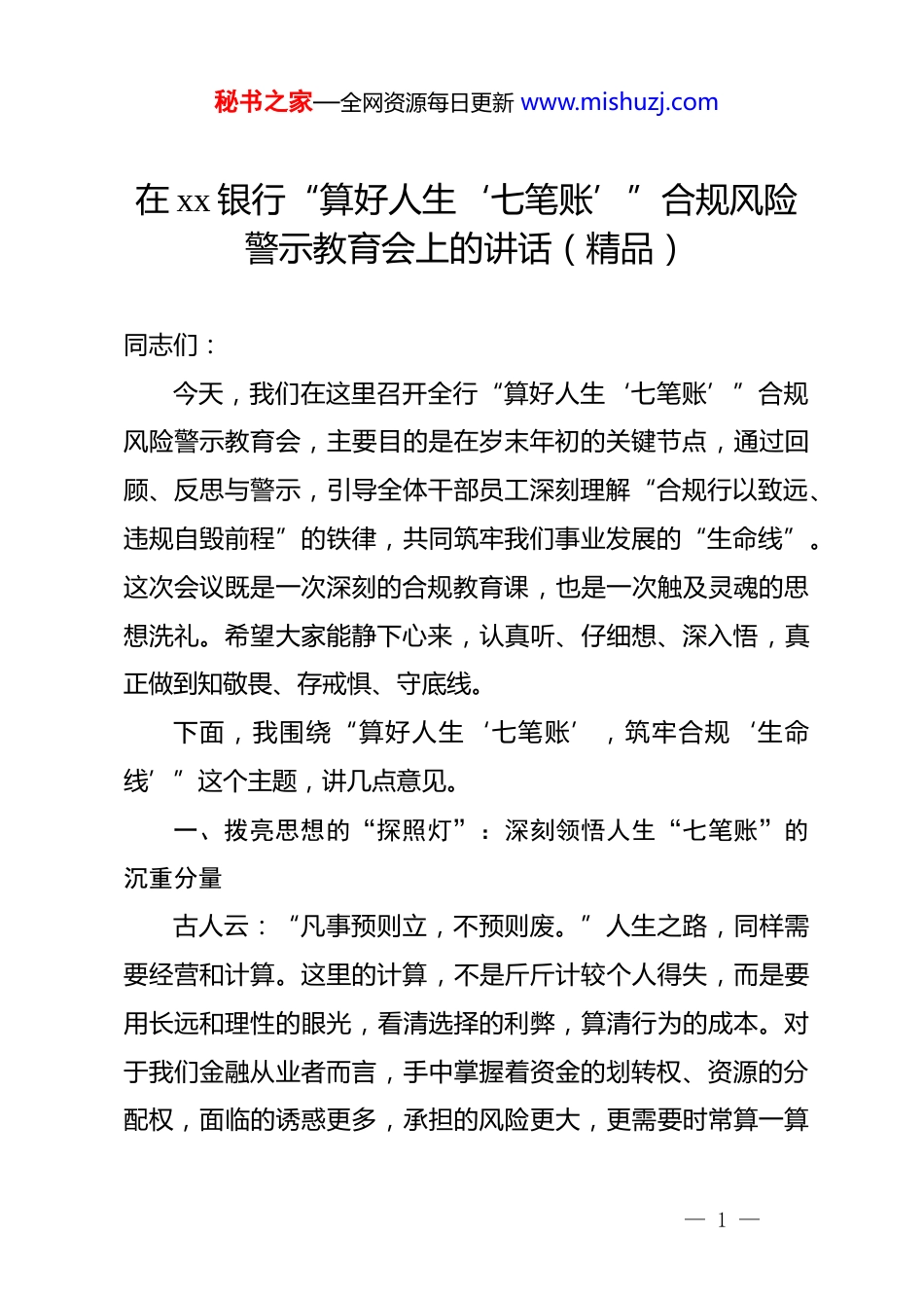 秘书之家—全网资源每日更新 www.mishuzj.com在 xx 银行“算好人生‘七笔账’”合规风险警示教育会上的讲话(精品)同志们:今天,我们在这里召开全行“算好人生‘七笔账’”合规风险警示教育会,主要目的是在岁末年初的关键节点,通过回顾、反思与警示,引导全体干部员工深刻理解“合规行以致远、违规自毁前程”的铁律,共同筑牢我们事业发展的“生命线”。这次会议既是一次深刻的合规教育课,也是一次触及灵魂的思想洗礼。希望大家能静下心来,认真听、仔细想、深入悟,真正做到知敬畏、存戒惧、守底线。下面,我围绕“算好人生‘七笔账’,筑牢合规‘生命线’”这个主题,讲几点意见。一、拨亮思想的“探照灯”:深刻领悟人生“七笔账”的沉重分量古人云:“凡事预则立,不预则废。”人生之路,同样需要经营和计算。这里的计算,不是斤斤计较个人得失,而是要用长远和理性的眼光,看清选择的利弊,算清行为的成本。对于我们金融从业者而言,手中掌握着资金的划转权、资源的分配权,面临的诱惑更多,承担的风险更大,更需要时常算一算— 1 —秘书之家—全网资源每日更新 www.mishuzj.com人生大账。这“七笔账”,是我们每个人都必须面对、必须算清的人生答卷。第一,要算清“政治账”,守住信仰之舵,方能行稳致远。政治是最大的大局。作为 xx 银行的一员,我们的身份不仅仅是一名金融从业者,更是国家金融政策的执行者、服务地方经济发展的排头兵。我们的一言一行,不仅代表个人,更关乎 xx 银行的声誉,关乎金融工作的政治性和人民性。如果理想信念动摇,在政治上犯了糊涂,那么失去的将不仅仅是职业前途,更是人生的“压舱石”。违规操作、以权谋私,看似是经济问题,其根源却是政治上的迷失。一旦触碰 dj 国法的红线,就意味着背离了组织的信任和人民的期盼,政治生命将戛然而止。回望那些落马的金融干部,哪一个不是从思想滑坡、信念坍塌开始,最终一步步走向深渊?他们的惨痛教训告诉我们,政治账算不清,人生必定“满盘皆输”。我们必须时刻牢记自己的第一身份是*员,第一职责是为*工作,不断提高政治判断力、政治领悟力、政治执行力,始终做到心中有*、心中有民、心中有责、心中有戒。第二,要算清“经济账”,认清贪欲之害,方能安身立命。君子爱财,取之有道。我们通过辛勤劳动获取合法收入,是天经地义、理所当然的。但是,如果把追求财富作为唯一目标,— 2 —秘书之家—全网资源每日更新 www.mishuzj.com甚至不惜逾越法纪的边界,那么这笔“经济账”迟早会变成一本记录罪恶的“坏账”。警示片中的案例触目惊心,那些曾经的业务骨干、青年才俊,为了一时的贪念,利用职务之便违规放贷、收受贿赂,最终不仅将不义之财悉数上缴,还赔上了自己多年的积蓄,甚至让整个家庭背上沉重的债务,落得个倾家荡产的悲惨下场。一笔贿赂,可能看似“解决”了眼前的财务窘境,但它附带的“利息”却是法律的严惩和终身的悔恨。我们必须清醒地认识到,组织的培养、岗位的历练、合规的薪酬,才是我们安身立命、实现价值的根本。任何妄图通过“捷径”获取不法利益的想法,都是在为自己的人生埋下定时炸弹。我们一定要树立正确的财富观,珍惜当下的工作岗位,用干净的双手创造属于自己的阳光财富。第三,要算清“名誉账”,珍惜立身之本,方能赢得尊重。人过留名,雁过留声。一个人的名誉,是其在社会上立足的无形资产,是比金钱更宝贵的财富。这份声誉,来源于日积月累的品行操守,来源于同事领导的认可,来源于客户社会的信赖。在我们金融行业,信誉更是生存和发展的基石。一个员工如果出现了违规行为,损害的不仅仅是他个人的名节,更是对 xx 银行数十年如一日辛苦建立起来的品牌信誉的严重冲击。一个污点,就可能让多年的努力付诸东流。那些因违纪违法而身败名— 3 —秘书之家—全网资源每日更新 www.mishuzj.com裂的人,不仅自己终生抬不起头,也让家人蒙羞,被周围人指指点点。他们曾经的荣誉、地位、掌声,都在一念之差中化为泡影,变成了无法抹去的耻辱烙印。我们每一位员工都要像爱护自己的眼睛一样爱护自己的名誉,像守护自己的生命一样守护 xx 银行的声...