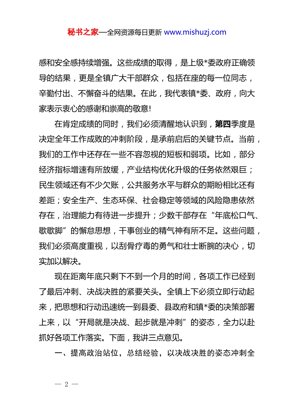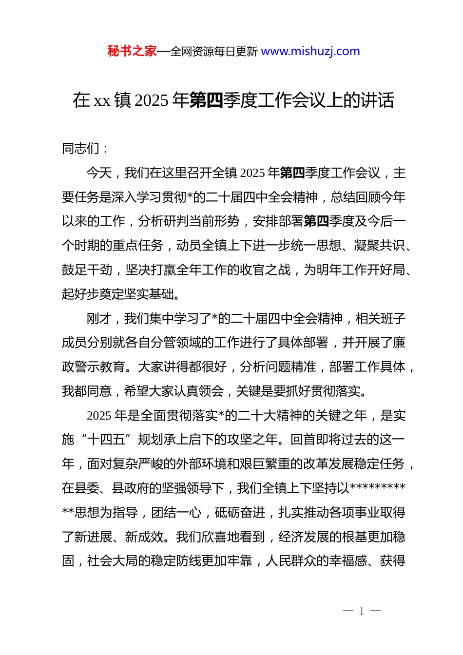 秘书之家—全网资源每日更新 www.mishuzj.com在 xx 镇 2025 年第四季度工作会议上的讲话同志们:今天,我们在这里召开全镇 2025 年第四季度工作会议,主要任务是深入学习贯彻*的二十届四中全会精神,总结回顾今年以来的工作,分析研判当前形势,安排部署第四季度及今后一个时期的重点任务,动员全镇上下进一步统一思想、凝聚共识、鼓足干劲,坚决打赢全年工作的收官之战,为明年工作开好局、起好步奠定坚实基础。刚才,我们集中学习了*的二十届四中全会精神,相关班子成员分别就各自分管领域的工作进行了具体部署,并开展了廉政警示教育。大家讲得都很好,分析问题精准,部署工作具体,我都同意,希望大家认真领会,关键是要抓好贯彻落实。2025 年是全面贯彻落实*的二十大精神的关键之年,是实施“十四五”规划承上启下的攻坚之年。回首即将过去的这一年,面对复杂严峻的外部环境和艰巨繁重的改革发展稳定任务,在县委、县政府的坚强领导下,我们全镇上下坚持以***********思想为指导,团结一心,砥砺奋进,扎实推动各项事业取得了新进展、新成效。我们欣喜地看到,经济发展的根基更加稳固,社会大局的稳定防线更加牢靠,人民群众的幸福感、获得— 1 —秘书之家—全网资源每日更新 www.mishuzj.com感和安全感持续增强。这些成绩的取得,是上级*委政府正确领导的结果,更是全镇广大干部群众,包括在座的每一位同志,辛勤付出、不懈奋斗的结果。在此,我代表镇*委、政府,向大家表示衷心的感谢和崇高的敬意!在肯定成绩的同时,我们必须清醒地认识到,第四季度是决定全年工作成败的冲刺阶段,是承前启后的关键节点。当前,我们的工作中还存在一些不容忽视的短板和弱项。比如,部分经济指标增速有所放缓,产业结构优化升级的任务依然艰巨;民生领域还有不少欠账,公共服务水平与群众的期盼相比还有差距;安全生产、生态环保、社会稳定等领域的风险隐患依然存在,治理能力有待进一步提升;少数干部存在“年底松口气、歇歇脚”的懈怠思想,干事创业的精气神有所不足。这些问题,我们必须高度重视,以刮骨疗毒的勇气和壮士断腕的决心,切实加以解决。现在距离年底只剩下不到一个月的时间,各项工作已经到了最后冲刺、决战决胜的紧要关头。全镇上下必须立即行动起来,把思想和行动迅速统一到县委、县政府和镇*委的决策部署上来,以“开局就是决战、起步就是冲刺”的姿态,全力以赴抓好各项工作落实。下面,我讲三点意见。一、提高政治站位,总结经验,以决战决胜的姿态冲刺全— 2 —秘书之家—全网资源每日更新 www.mishuzj.com年目标完成全年目标任务,不仅是一项经济任务,更是一项严肃的政治任务。我们要站在践行“两个维护”的政治高度,深刻认识做好当前工作的极端重要性和紧迫性,切实把思想和行动统一到*中央决策部署和省委、市委、县委的工作要求上来,确保政令畅通、令行禁止。第一,要深化思想认识,筑牢收官冲刺的行动自觉。“行百里者半九十”。越是到最后关头,越不能有丝毫松懈。全镇各级干部要坚决克服“船到码头车到站”的松劲心态和“任务差不多就行了”的消极思想。要清醒地认识到,第四季度的工作成效,直接关系到我们全年的考核结果,关系到我镇在全县发展大局中的位次,更关系到我们向全镇人民的庄严承诺能否兑现。我们必须牢固树立“一盘棋”思想,各部门、各村(社区)要主动担当、积极作为,加强沟通、密切协作,形成上下联动、齐抓共管的强大合力。要把智慧和力量凝聚到完成各项目标任务上来,把全部精力投入到抓落实、求实效中去,以“功成不必在我”的精神境界和“功成必定有我”的历史担当,确保各项工作善始善终、善作善成。第二,要系统总结经验,巩固来之不易的发展成果。今年以来,我们立足 xx 镇独特的资源禀赋和坚实的产业基础,深入— 3 —秘书之家—全网资源每日更新 www.mishuzj.com实施“dj 引领·乡村振兴 211 行动”,取得了一系列令人鼓舞的成果。我们要认真总结和巩固这些成果,将其转化为推动高质量发展的持久动力。比如,在产业发展方面,我们依托生态优势,大力发展特色农业和文旅产业,初步形成了“一村一品”的发展...
