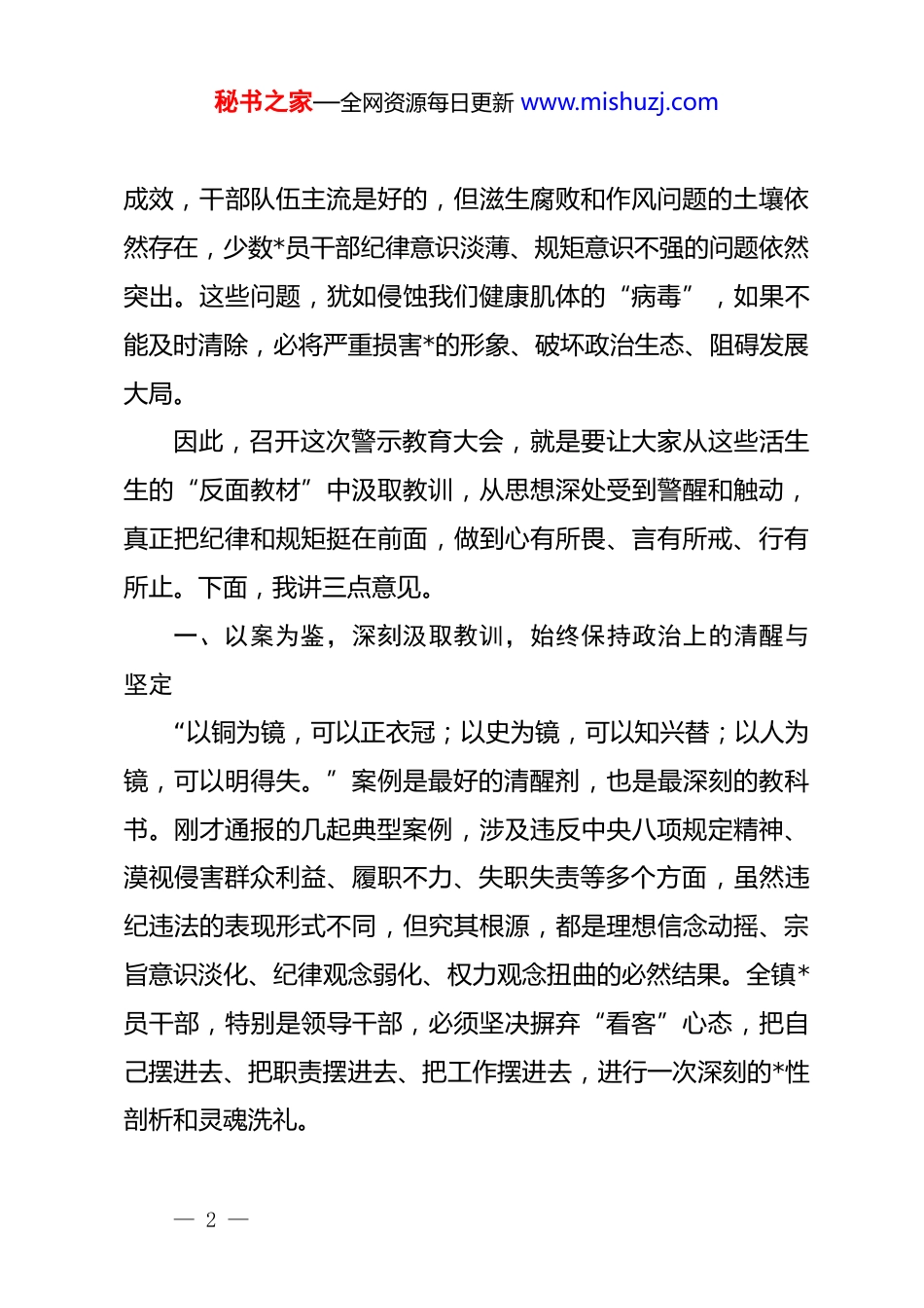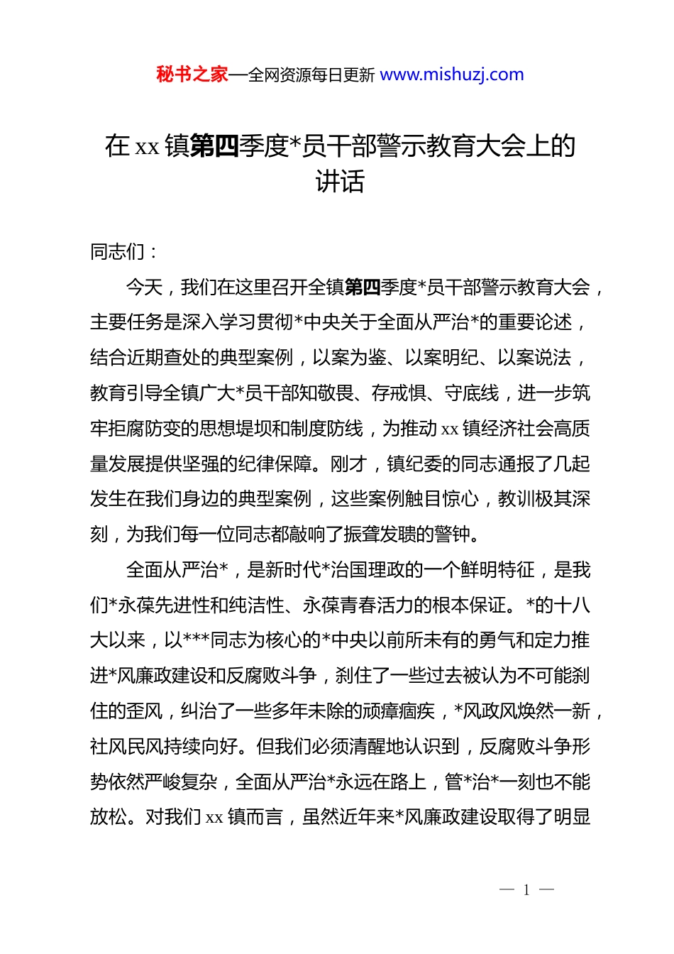秘书之家—全网资源每日更新 www.mishuzj.com在 xx 镇第四季度*员干部警示教育大会上的讲话同志们:今天,我们在这里召开全镇第四季度*员干部警示教育大会,主要任务是深入学习贯彻*中央关于全面从严治*的重要论述,结合近期查处的典型案例,以案为鉴、以案明纪、以案说法,教育引导全镇广大*员干部知敬畏、存戒惧、守底线,进一步筑牢拒腐防变的思想堤坝和制度防线,为推动 xx 镇经济社会高质量发展提供坚强的纪律保障。刚才,镇纪委的同志通报了几起发生在我们身边的典型案例,这些案例触目惊心,教训极其深刻,为我们每一位同志都敲响了振聋发聩的警钟。全面从严治*,是新时代*治国理政的一个鲜明特征,是我们*永葆先进性和纯洁性、永葆青春活力的根本保证。*的十八大以来,以***同志为核心的*中央以前所未有的勇气和定力推进*风廉政建设和反腐败斗争,刹住了一些过去被认为不可能刹住的歪风,纠治了一些多年未除的顽瘴痼疾,*风政风焕然一新,社风民风持续向好。但我们必须清醒地认识到,反腐败斗争形势依然严峻复杂,全面从严治*永远在路上,管*治*一刻也不能放松。对我们 xx 镇而言,虽然近年来*风廉政建设取得了明显— 1 —秘书之家—全网资源每日更新 www.mishuzj.com成效,干部队伍主流是好的,但滋生腐败和作风问题的土壤依然存在,少数*员干部纪律意识淡薄、规矩意识不强的问题依然突出。这些问题,犹如侵蚀我们健康肌体的“病毒”,如果不能及时清除,必将严重损害*的形象、破坏政治生态、阻碍发展大局。因此,召开这次警示教育大会,就是要让大家从这些活生生的“反面教材”中汲取教训,从思想深处受到警醒和触动,真正把纪律和规矩挺在前面,做到心有所畏、言有所戒、行有所止。下面,我讲三点意见。一、以案为鉴,深刻汲取教训,始终保持政治上的清醒与坚定“以铜为镜,可以正衣冠;以史为镜,可以知兴替;以人为镜,可以明得失。”案例是最好的清醒剂,也是最深刻的教科书。刚才通报的几起典型案例,涉及违反中央八项规定精神、漠视侵害群众利益、履职不力、失职失责等多个方面,虽然违纪违法的表现形式不同,但究其根源,都是理想信念动摇、宗旨意识淡化、纪律观念弱化、权力观念扭曲的必然结果。全镇*员干部,特别是领导干部,必须坚决摒弃“看客”心态,把自己摆进去、把职责摆进去、把工作摆进去,进行一次深刻的*性剖析和灵魂洗礼。— 2 —秘书之家—全网资源每日更新 www.mishuzj.com第一,必须坚定理想信念,筑牢思想“压舱石”。理想信念是共产*人精神上的“钙”,没有理想信念,或者理想信念不坚定,精神上就会“缺钙”,就会得“软骨病”。从通报的案例来看,涉案人员无一不是从思想滑坡、信念动摇开始的。他们忘记了入*时的铮铮誓言,忘记了作为一名*员干部的初心和使命,在各种诱惑面前败下阵来,最终滑向了违纪违法的深渊。比如,一些干部沉迷于吃喝享乐,认为这是“人之常情”,结果在推杯换盏中迷失了自我,模糊了公与私的界限;一些干部把手中的权力视为谋取私利的工具,不是想着如何为民办事,而是琢磨着如何“靠山吃山”,雁过拔毛,最终损害的是群众的切身利益,啃食的是*的执政根基。这些沉痛的教训告诉我们,思想的堤坝一旦决口,腐败的洪水便会一泻千里。全镇*员干部要始终把加强理论学习、坚定理想信念作为终身课题,持续深入学习**************思想,不断提高政治判断力、政治领悟力、政治执行力。要经常性地重温入*誓词,对照*章*规 dj 净化思想、检视言行,自觉拧紧世界观、人生观、价值观这个“总开关”,真正做到在*爱*、在*言*、在*忧*、在*为*。第二,必须恪守为民初心,站稳人民“硬立场”。江山就是人民,人民就是江山。我们*的根基在人民、血脉在人民、力量在人民。作为基层干部,我们直接面对群众,我们的一言一— 3 —秘书之家—全网资源每日更新 www.mishuzj.com行,直接关系到*和政府在人民群众心中的形象。案例中,有的干部对群众的急难愁盼问题漠不关心、推诿扯皮,有的在惠民政策落实中优亲厚友、吃拿卡要,这些行为严重背离了我们*的为民宗旨,寒了群众的心。例如,据统计,去年以来,全市镇纪委共收...
