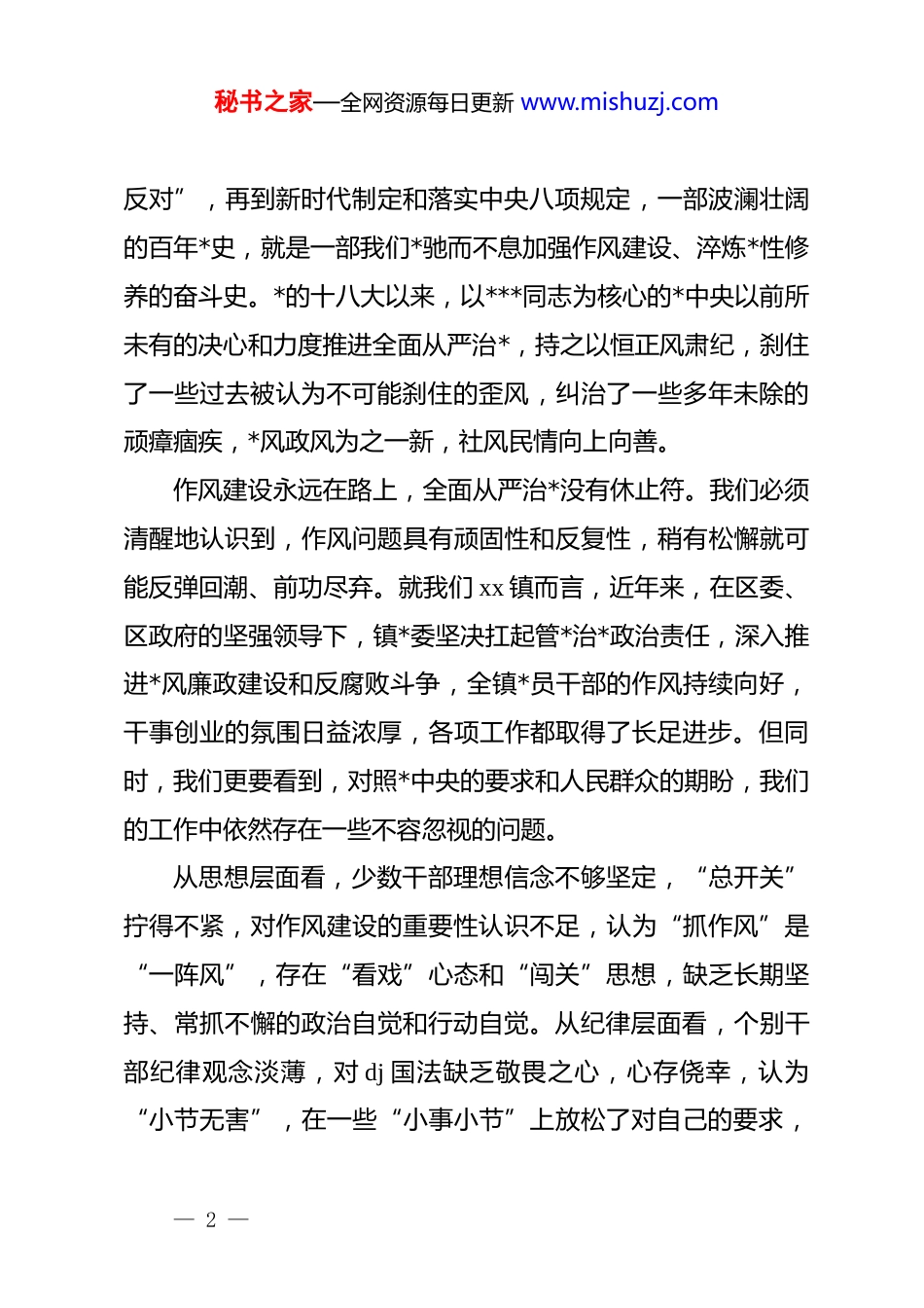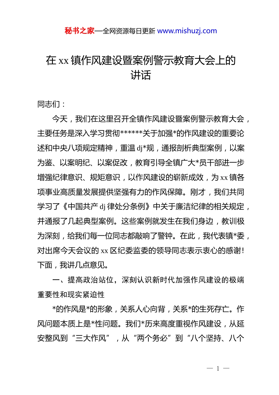秘书之家—全网资源每日更新 www.mishuzj.com在 xx 镇作风建设暨案例警示教育大会上的讲话同志们:今天,我们在这里召开全镇作风建设暨案例警示教育大会,主要任务是深入学习贯彻******关于加强*的作风建设的重要论述和中央八项规定精神,重温 dj*规,通报剖析典型案例,以案为鉴、以案明纪、以案促改,教育引导全镇广大*员干部进一步增强纪律意识、规矩意识,以作风建设的崭新成效,为 xx 镇各项事业高质量发展提供坚强有力的作风保障。刚才,我们共同学习了《中国共产 dj 律处分条例》中关于廉洁纪律的相关规定,并通报了几起典型案例。这些案例就发生在我们身边,教训极为深刻,给我们每一位同志都敲响了警钟。在此,我代表镇*委,对出席今天会议的 xx 区纪委监委的领导同志表示衷心的感谢!下面,我讲几点意见。一、提高政治站位,深刻认识新时代加强作风建设的极端重要性和现实紧迫性*的作风是*的形象,关系人心向背,关系*的生死存亡。作风问题本质上是*性问题。我们*历来高度重视作风建设,从延安整风到“三大作风”,从“两个务必”到“八个坚持、八个— 1 —秘书之家—全网资源每日更新 www.mishuzj.com反对”,再到新时代制定和落实中央八项规定,一部波澜壮阔的百年*史,就是一部我们*驰而不息加强作风建设、淬炼*性修养的奋斗史。*的十八大以来,以***同志为核心的*中央以前所未有的决心和力度推进全面从严治*,持之以恒正风肃纪,刹住了一些过去被认为不可能刹住的歪风,纠治了一些多年未除的顽瘴痼疾,*风政风为之一新,社风民情向上向善。作风建设永远在路上,全面从严治*没有休止符。我们必须清醒地认识到,作风问题具有顽固性和反复性,稍有松懈就可能反弹回潮、前功尽弃。就我们 xx 镇而言,近年来,在区委、区政府的坚强领导下,镇*委坚决扛起管*治*政治责任,深入推进*风廉政建设和反腐败斗争,全镇*员干部的作风持续向好,干事创业的氛围日益浓厚,各项工作都取得了长足进步。但同时,我们更要看到,对照*中央的要求和人民群众的期盼,我们的工作中依然存在一些不容忽视的问题。从思想层面看,少数干部理想信念不够坚定,“总开关”拧得不紧,对作风建设的重要性认识不足,认为“抓作风”是“一阵风”,存在“看戏”心态和“闯关”思想,缺乏长期坚持、常抓不懈的政治自觉和行动自觉。从纪律层面看,个别干部纪律观念淡薄,对 dj 国法缺乏敬畏之心,心存侥幸,认为“小节无害”,在一些“小事小节”上放松了对自己的要求,— 2 —秘书之家—全网资源每日更新 www.mishuzj.com甚至游走在违纪违规的边缘。从工作层面看,形式主义、官僚主义问题依然不同程度存在。“文山会海”现象有所抬头,一些工作满足于开了会、发了文,但在抓落实、求实效上下的功夫不够;有的干部服务群众意识不强,对待群众诉求“庸懒散拖、推诿扯皮”,门好进了、脸好看了,但事情依然难办;有的干部担当精神不足,面对改革发展的硬任务、硬骨头,习惯于当“二传手”、“甩手掌柜”,缺乏攻坚克难的勇气和魄力。从生活层面看,一些隐形变异的“四风”问题禁而未绝,比如“不吃公款吃老板”,违规接受管理服务对象的宴请,参与可能影响公正执行公务的娱乐活动等。这些问题虽然只是发生在少数人身上,但其危害极大,不仅败坏了*的形象,损害了*群干群关系,更侵蚀了我镇改革发展稳定的大局。全镇上下必须对此保持高度警惕,以刮骨疗毒的勇气、抓铁有痕的劲头,坚决把作风建设一抓到底。二、以案为镜鉴,深刻汲取反面典型的沉痛教训,筑牢拒腐防变的思想防线刚才通报的几起典型案例,既有违反中央八项规定精神的,也有履职不力、失职失责的,他们都曾是我们身边的同事,有的还曾是单位的骨干和负责人。他们从一名受*培养多年的干部沦为阶下囚,滑向腐败堕落的深渊,其教训是惨痛的,原因也— 3 —秘书之家—全网资源每日更新 www.mishuzj.com是多方面的,但根子还是出在思想上。每一位*员干部都要把自己摆进去、把职责摆进去、把工作摆进去,深刻反思,引以为戒。一要从案例中汲取“理想信念沦丧”的教训,永葆对*忠诚的政治本色。纵观所有违纪违法的案例,无一不是...