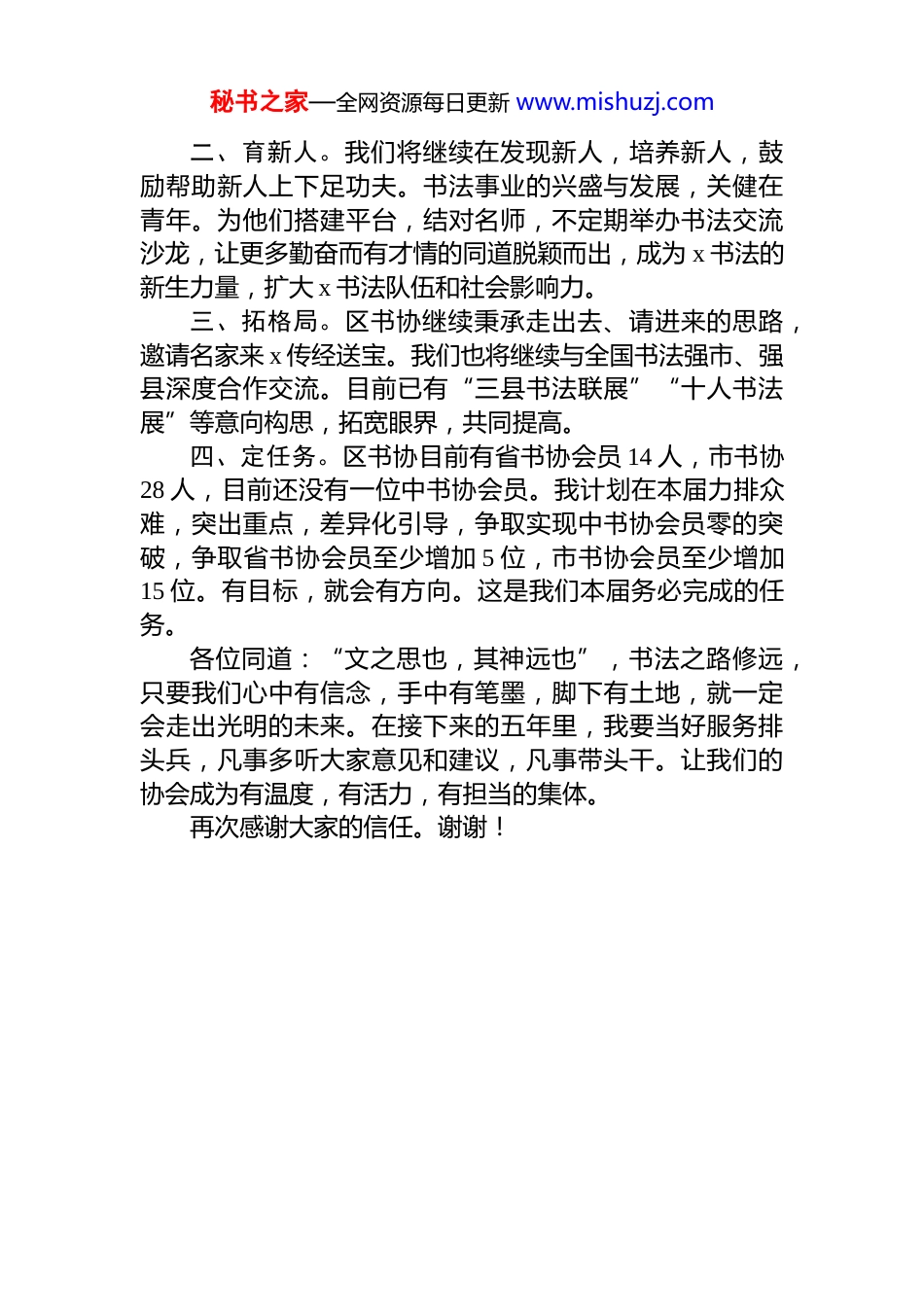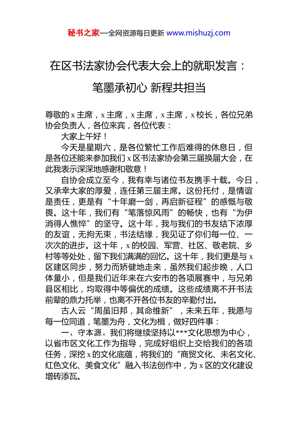 秘书之家—全网资源每日更新 www.mishuzj.com在区书法家协会代表大会上的就职发言:笔墨承初心 新程共担当尊敬的 x 主席,x 主席,x 主席,x 主席,x 校长,各位兄弟协会负责人,各位来宾,各位代表:大家上午好!今天是星期六,是各位繁忙工作后难得的休息日,但是各位还能来参加我们 x 区书法家协会第三届换届大会,在此我表示深深地感谢和敬意!自协会成立至今,我有幸与诸位书友携手十载。今日,又承幸大家的厚爱,连任第三届主席。这份托付,是情谊是责任,更是有“十年磨一剑,再启新征程”的感慨与敬畏。这十年,我们有“笔落惊风雨”的畅快,也有“为伊消得人憔悴”的坚守。这十年,我与我们的书友结下浓厚的友谊,无拘无束,书法结缘,我见证了你们每一位、一次次的进步。这十年,x 的校园、军营、社区、敬老院、乡村等等处处,留下我们满满的回忆。这十年,我们更是与 x区建区同步,努力而矫健地走来,虽然我们起步晚,人口体量小,但是我们近年来在六安市的各项展赛中,与兄弟县区相比,均取得中等偏优的成绩。这些成绩离不开书法前辈的鼎力托举,也离不开各位书友的辛勤付出。古人云“周虽旧邦,其命维新”,未来五年,我愿与每一位同道,笔墨为舟,文化为楫,做好四件事:一、守本源。我们将继续坚持以***文化思想为中心,以省市区文化工作为指导,完成好组织上交给我们的各项任务,深挖 x 的文化底蕴,将我们的“商贸文化、未名文化、红色文化、美食文化”融入书法创作中,为 x 区的文化建设增砖添瓦。秘书之家—全网资源每日更新 www.mishuzj.com二、育新人。我们将继续在发现新人,培养新人,鼓励帮助新人上下足功夫。书法事业的兴盛与发展,关健在青年。为他们搭建平台,结对名师,不定期举办书法交流沙龙,让更多勤奋而有才情的同道脱颖而出,成为 x 书法的新生力量,扩大 x 书法队伍和社会影响力。三、拓格局。区书协继续秉承走出去、请进来的思路,邀请名家来 x 传经送宝。我们也将继续与全国书法强市、强县深度合作交流。目前已有“三县书法联展”“十人书法展”等意向构思,拓宽眼界,共同提高。四、定任务。区书协目前有省书协会员 14 人,市书协28 人,目前还没有一位中书协会员。我计划在本届力排众难,突出重点,差异化引导,争取实现中书协会员零的突破,争取省书协会员至少增加 5 位,市书协会员至少增加15 位。有目标,就会有方向。这是我们本届务必完成的任务。各位同道:“文之思也,其神远也”,书法之路修远,只要我们心中有信念,手中有笔墨,脚下有土地,就一定会走出光明的未来。在接下来的五年里,我要当好服务排头兵,凡事多听大家意见和建议,凡事带头干。让我们的协会成为有温度,有活力,有担当的集体。再次感谢大家的信任。谢谢!