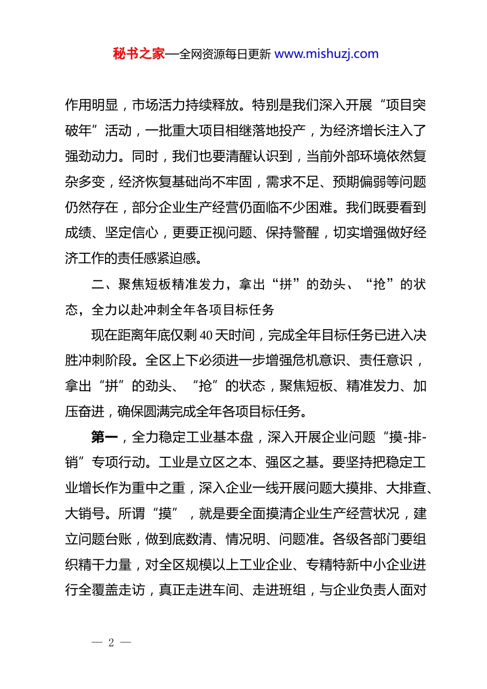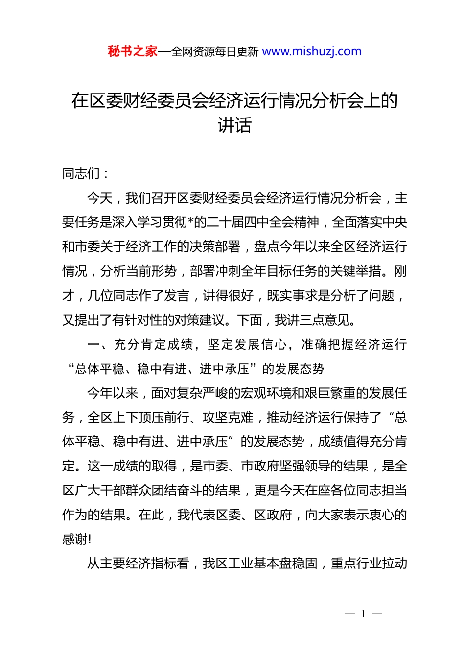 秘书之家—全网资源每日更新 www.mishuzj.com在区委财经委员会经济运行情况分析会上的讲话同志们:今天,我们召开区委财经委员会经济运行情况分析会,主要任务是深入学习贯彻*的二十届四中全会精神,全面落实中央和市委关于经济工作的决策部署,盘点今年以来全区经济运行情况,分析当前形势,部署冲刺全年目标任务的关键举措。刚才,几位同志作了发言,讲得很好,既实事求是分析了问题,又提出了有针对性的对策建议。下面,我讲三点意见。一、充分肯定成绩,坚定发展信心,准确把握经济运行“总体平稳、稳中有进、进中承压”的发展态势今年以来,面对复杂严峻的宏观环境和艰巨繁重的发展任务,全区上下顶压前行、攻坚克难,推动经济运行保持了“总体平稳、稳中有进、进中承压”的发展态势,成绩值得充分肯定。这一成绩的取得,是市委、市政府坚强领导的结果,是全区广大干部群众团结奋斗的结果,更是今天在座各位同志担当作为的结果。在此,我代表区委、区政府,向大家表示衷心的感谢!从主要经济指标看,我区工业基本盘稳固,重点行业拉动— 1 —秘书之家—全网资源每日更新 www.mishuzj.com作用明显,市场活力持续释放。特别是我们深入开展“项目突破年”活动,一批重大项目相继落地投产,为经济增长注入了强劲动力。同时,我们也要清醒认识到,当前外部环境依然复杂多变,经济恢复基础尚不牢固,需求不足、预期偏弱等问题仍然存在,部分企业生产经营仍面临不少困难。我们既要看到成绩、坚定信心,更要正视问题、保持警醒,切实增强做好经济工作的责任感紧迫感。二、聚焦短板精准发力,拿出“拼”的劲头、“抢”的状态,全力以赴冲刺全年各项目标任务现在距离年底仅剩 40 天时间,完成全年目标任务已进入决胜冲刺阶段。全区上下必须进一步增强危机意识、责任意识,拿出“拼”的劲头、“抢”的状态,聚焦短板、精准发力、加压奋进,确保圆满完成全年各项目标任务。第一,全力稳定工业基本盘,深入开展企业问题“摸-排-销”专项行动。工业是立区之本、强区之基。要坚持把稳定工业增长作为重中之重,深入企业一线开展问题大摸排、大排查、大销号。所谓“摸”,就是要全面摸清企业生产经营状况,建立问题台账,做到底数清、情况明、问题准。各级各部门要组织精干力量,对全区规模以上工业企业、专精特新中小企业进行全覆盖走访,真正走进车间、走进班组,与企业负责人面对— 2 —秘书之家—全网资源每日更新 www.mishuzj.com面交流,了解企业诉求,掌握第一手资料。所谓“排”,就是要对摸排出的问题进行分类梳理、精准研判,分清轻重缓急,明确责任主体。要聚焦企业反映的融资、用工、用地、能源、物流等共性问题和个性诉求,建立问题清单、责任清单、时限清单,确保事事有人管、件件有着落。所谓“销”,就是要建立问题销号制度,实行闭环管理,限时办结、挂单销号。能够当场解决的,要当场解决;需要协调解决的,要明确时间节点,限期解决;需要上级支持的,要积极对上争取。要把问题解决率、企业满意率作为检验工作成效的重要标准,确保企业反映的问题在最短时间内得到实质性解决,为企业稳产满产创造良好条件。第二,巩固放大关键行业拉动效应,推动批零住餐业、建筑业、房地产业提质增效。批零住餐业是消费市场的主力军,建筑业是固定资产投资的重要载体,房地产业是稳经济的重要抓手。这三个行业对我区经济增长的贡献率超过 40%,必须下大力气抓好。在批零住餐业方面,要大力实施消费扩容提质行动。重点抓好三个方面:一是培育壮大市场主体。要加大“个转企、小升规”工作力度,推动一批成长性好、发展潜力大的个体工商户转型升级为企业,支持中小商贸企业做大做强,确保全年新— 3 —秘书之家—全网资源每日更新 www.mishuzj.com增限额以上批零住餐企业 xx 家以上。二是打造消费新场景。要加快 xx 商业综合体、xx 特色街区建设,推出一批沉浸式、体验式消费场景,大力发展首店经济、夜间经济、直播电商等新业态。三是开展促消费活动。要抓住岁末年初消费旺季,举办系列促消费活动,发放消费券,营造浓厚消费氛围,充分挖掘消费潜力。在建筑业方面,要巩固传...