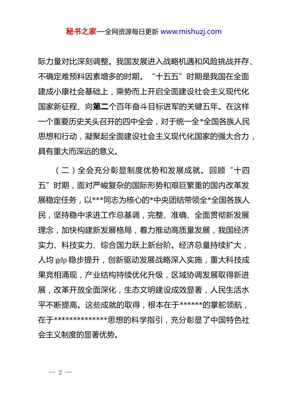 秘书之家—全网资源每日更新 www.mishuzj.com在全区学习贯彻*的全会精神宣讲报告会上的讲话同志们:*的二十届四中全会是在我们即将进入基本实现社会主义现代化夯实基础、全面发力的关键时期召开的一次十分重要的会议。******在全会上发表的重要讲话,高屋建瓴、思想深邃、内涵丰富,具有很强的政治性、思想性、战略性、指导性,为我们做好当前和今后一个时期的工作指明了前进方向、提供了根本遵循。今天,我围绕学习贯彻*的二十届四中全会精神,结合我区实际,与大家作一次深入交流。一、深刻认识*的二十届四中全会的重大意义*的二十届四中全会审议通过的《中共中央关于制定国民经济和社会发展第十五个五年规划和二〇三五年远景目标的建议》,擘画了我国未来发展的宏伟蓝图,是指导我们做好“十五五”时期各项工作的纲领性文件。(一)全会召开恰逢关键历史节点。当前,世界百年未有之大变局加速演进,新一轮科技革命和产业变革深入发展,国— 1 —秘书之家—全网资源每日更新 www.mishuzj.com际力量对比深刻调整。我国发展进入战略机遇和风险挑战并存、不确定难预料因素增多的时期。“十五五”时期是我国在全面建成小康社会基础上,乘势而上开启全面建设社会主义现代化国家新征程、向第二个百年奋斗目标进军的关键五年。在这样一个重要历史关头召开的四中全会,对于统一全*全国各族人民思想和行动,凝聚起全面建设社会主义现代化国家的强大合力,具有重大而深远的意义。(二)全会充分彰显制度优势和发展成就。回顾“十四五”时期,面对严峻复杂的国际形势和艰巨繁重的国内改革发展稳定任务,以***同志为核心的*中央团结带领全*全国各族人民,坚持稳中求进工作总基调,完整、准确、全面贯彻新发展理念,加快构建新发展格局,着力推动高质量发展,我国经济实力、科技实力、综合国力跃上新台阶。经济总量持续扩大,人均 gdp 稳步提升,创新驱动发展战略深入实施,重大科技成果竞相涌现,产业结构持续优化升级,区域协调发展取得新进展,改革开放全面深化,生态文明建设成效显著,人民生活水平不断提高。这些成就的取得,根本在于******的掌舵领航,在于**************思想的科学指引,充分彰显了中国特色社会主义制度的显著优势。— 2 —秘书之家—全网资源每日更新 www.mishuzj.com(三)全会为未来发展指明方向路径。全会通过的《建议》明确了“十五五”时期经济社会发展的指导思想、遵循原则、主要目标和重大举措,提出要坚持以中国式现代化全面推进强国建设、民族复兴伟业为统领,统筹推进“五位一体”总体布局,协调推进“四个全面”战略布局。全会强调要坚持*的全面领导,坚持以人民为中心,坚持深化改革开放,坚持发扬斗争精神,为我们做好各项工作提供了行动指南。全会的召开,必将进一步凝聚共识、坚定信心,激励全*全国各族人民在新征程上创造新的历史伟业。二、准确把握“十五五”时期经济社会发展的核心要义全会《建议》为“十五五”时期经济社会发展作出了全面部署,我们要深刻理解、准确把握其核心要义和实践要求。(一)牢牢把握“十五五”时期的重要地位。“十五五”时期处于“两个一百年”奋斗目标的历史交汇期,是在全面建成小康社会基础上开启全面建设社会主义现代化国家新征程的重要五年,是向第二个百年奋斗目标进军的关键阶段。这一时期,既是巩固拓展全面建成小康社会成果的重要窗口期,也是推动经济社会发展实现质的有效提升和量的合理增长的攻坚期,更是为基本实现社会主义现代化夯实基础的关键期。我们必须— 3 —秘书之家—全网资源每日更新 www.mishuzj.com胸怀“两个大局”,增强机遇意识和风险意识,准确识变、科学应变、主动求变,善于在危机中育先机、于变局中开新局,抓住机遇、应对挑战,趋利避害、奋勇前进。(二)深刻理解“十五五”时期的指导方针。全会明确提出,“十五五”时期经济社会发展要高举中国特色社会主义伟大旗帜,全面贯彻*的二十大和二十届二中、三中、四中全会精神,坚持以马克思列宁主义、***思想、***理论、“三个代表”重要思想、科学发展观、**************思想为指导。这一指导方针,明确了我们前进的方向和遵...