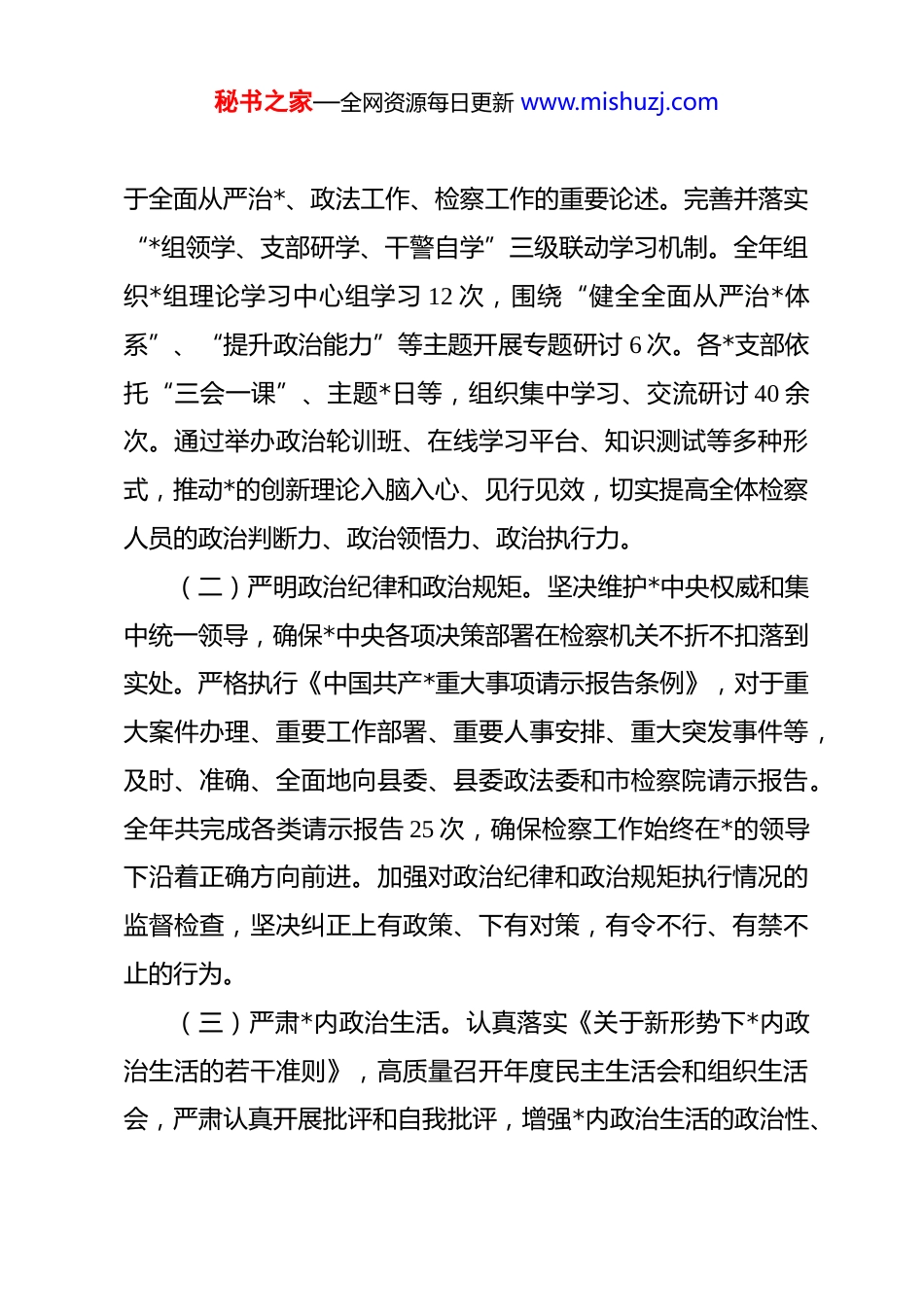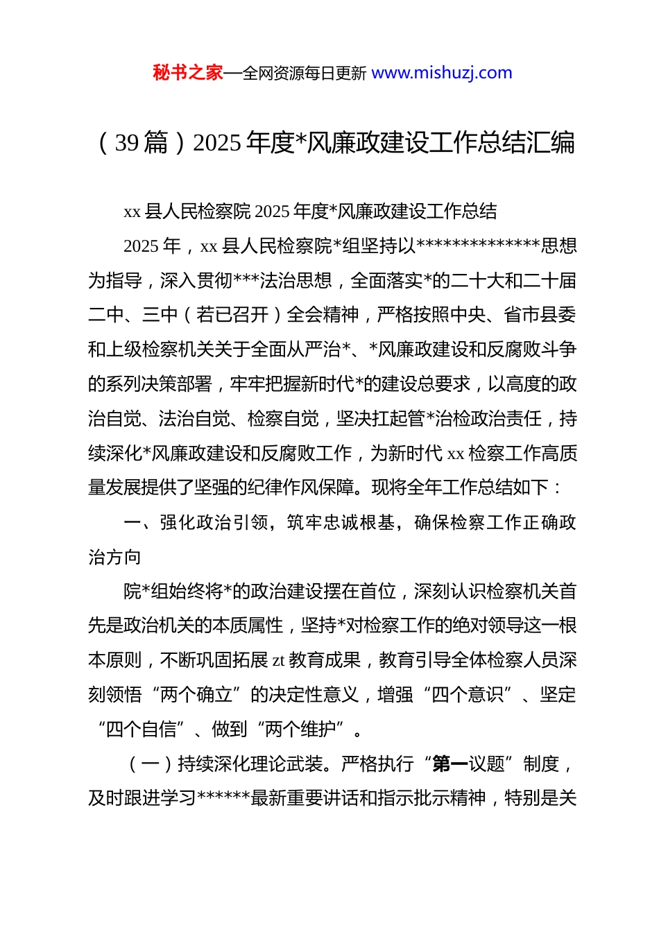 秘书之家—全网资源每日更新 www.mishuzj.com(39 篇)2025 年度*风廉政建设工作总结汇编xx 县人民检察院 2025 年度*风廉政建设工作总结2025 年,xx 县人民检察院*组坚持以**************思想为指导,深入贯彻***法治思想,全面落实*的二十大和二十届二中、三中(若已召开)全会精神,严格按照中央、省市县委和上级检察机关关于全面从严治*、*风廉政建设和反腐败斗争的系列决策部署,牢牢把握新时代*的建设总要求,以高度的政治自觉、法治自觉、检察自觉,坚决扛起管*治检政治责任,持续深化*风廉政建设和反腐败工作,为新时代 xx 检察工作高质量发展提供了坚强的纪律作风保障。现将全年工作总结如下:一、强化政治引领,筑牢忠诚根基,确保检察工作正确政治方向院*组始终将*的政治建设摆在首位,深刻认识检察机关首先是政治机关的本质属性,坚持*对检察工作的绝对领导这一根本原则,不断巩固拓展 zt 教育成果,教育引导全体检察人员深刻领悟“两个确立”的决定性意义,增强“四个意识”、坚定“四个自信”、做到“两个维护”。(一)持续深化理论武装。严格执行“第一议题”制度,及时跟进学习******最新重要讲话和指示批示精神,特别是关秘书之家—全网资源每日更新 www.mishuzj.com于全面从严治*、政法工作、检察工作的重要论述。完善并落实“*组领学、支部研学、干警自学”三级联动学习机制。全年组织*组理论学习中心组学习 12 次,围绕“健全全面从严治*体系”、“提升政治能力”等主题开展专题研讨 6 次。各*支部依托“三会一课”、主题*日等,组织集中学习、交流研讨 40 余次。通过举办政治轮训班、在线学习平台、知识测试等多种形式,推动*的创新理论入脑入心、见行见效,切实提高全体检察人员的政治判断力、政治领悟力、政治执行力。(二)严明政治纪律和政治规矩。坚决维护*中央权威和集中统一领导,确保*中央各项决策部署在检察机关不折不扣落到实处。严格执行《中国共产*重大事项请示报告条例》,对于重大案件办理、重要工作部署、重要人事安排、重大突发事件等,及时、准确、全面地向县委、县委政法委和市检察院请示报告。全年共完成各类请示报告 25 次,确保检察工作始终在*的领导下沿着正确方向前进。加强对政治纪律和政治规矩执行情况的监督检查,坚决纠正上有政策、下有对策,有令不行、有禁不止的行为。(三)严肃*内政治生活。认真落实《关于新形势下*内政治生活的若干准则》,高质量召开年度民主生活会和组织生活会,严肃认真开展批评和自我批评,增强*内政治生活的政治性、秘书之家—全网资源每日更新 www.mishuzj.com时代性、原则性、战斗性。严格落实民主集中制,完善*组议事规则和决策程序,“三重一大”事项均经集体讨论决定,不断提高科学决策、民主决策、依法决策水平。二、压实主体责任,健全制度体系,推动管*治检走向严紧硬院*组切实履行全面从严治*主体责任,坚持真管真严、敢管敢严、长管长严,着力构建主体明晰、有机协同、层层传导、问责有力的责任落实机制。(一)健全责任体系。制定并动态更新《xx 县人民检察院*组及其成员落实全面从严治*主体责任清单》,细化*组、*组书记、班子成员、部门负责人在*风廉政建设中的具体责任。*组书记认真履行第一责任人职责,对重要工作亲自部署、重大问题亲自过问、重点环节亲自协调、重要案件亲自督办。班子成员严格落实“一岗双责”,抓好分管领域的*风廉政建设工作。建立并深化“四责协同”机制,推动*组主体责任、书记第一责任人责任、班子成员“一岗双责”、纪检监察机构监督责任贯通联动、一体落实,形成齐抓共管的工作格局。(二)层层传导压力。组织召开全院*风廉政建设工作会议,部署年度任务,明确工作要求。*组书记、检察长与班子成员、各部门负责人,班子成员与分管部门干警,层层开展廉政谈话秘书之家—全网资源每日更新 www.mishuzj.com和履职约谈,全年累计开展各类谈话提醒 150 余人次。组织全院在编干警及辅助人员重新签订并严格执行《检察人员廉洁从检承诺书》42 份,实现责任承诺全覆盖。将*风廉政建设纳入年度绩效考核重要内容,完善考核评价指标体系,强化...