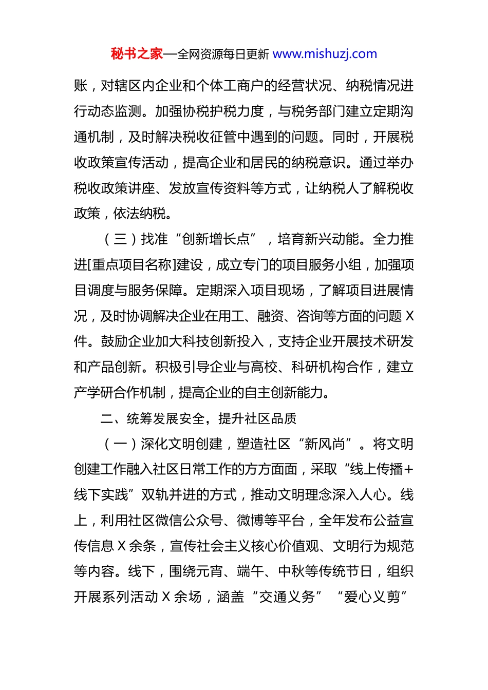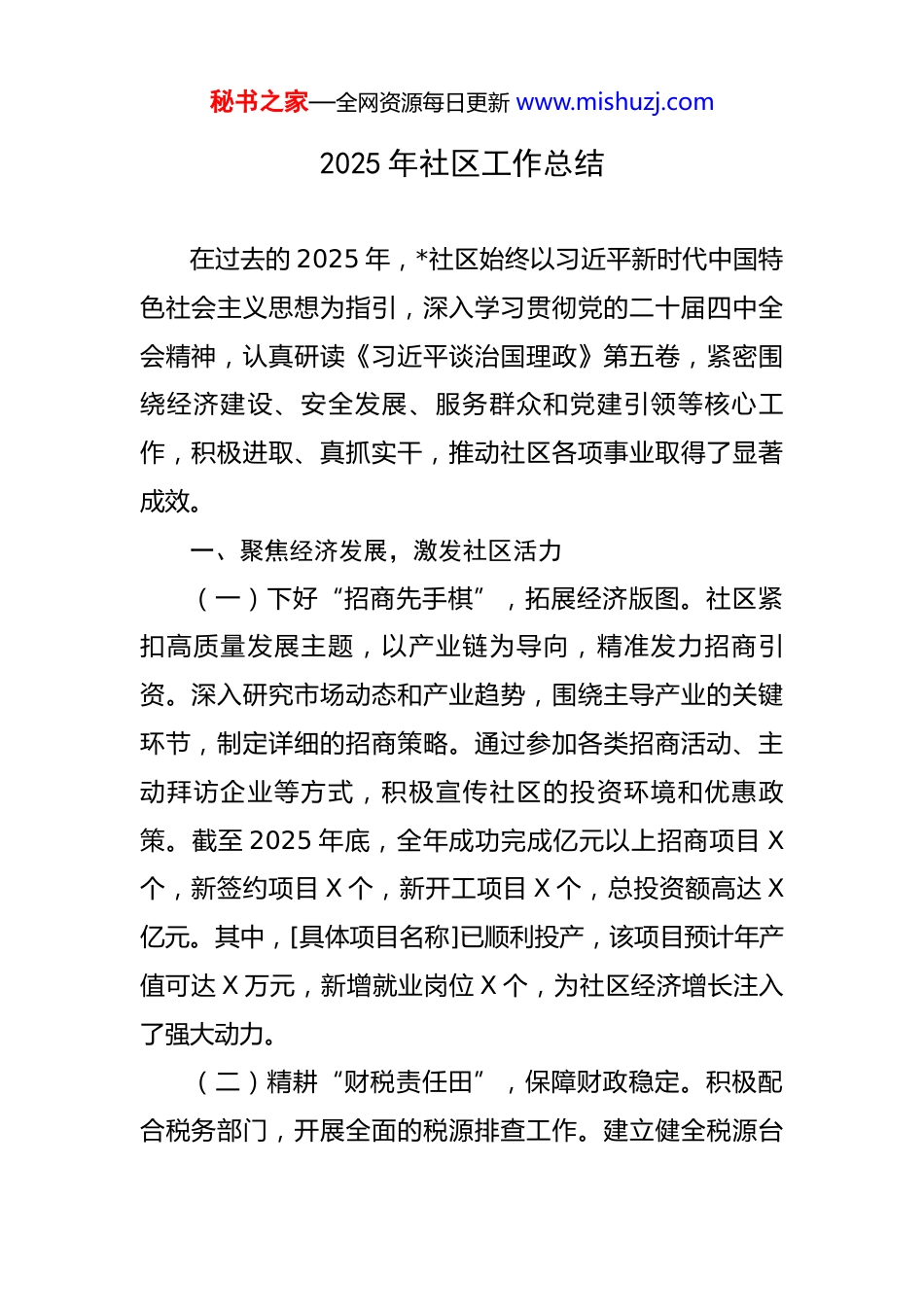 秘书之家—全网资源每日更新 www.mishuzj.com2025 年社区工作总结 在过去的 2025 年,*社区始终以习近平新时代中国特色社会主义思想为指引,深入学习贯彻党的二十届四中全会精神,认真研读《习近平谈治国理政》第五卷,紧密围绕经济建设、安全发展、服务群众和党建引领等核心工作,积极进取、真抓实干,推动社区各项事业取得了显著成效。一、聚焦经济发展,激发社区活力(一)下好“招商先手棋”,拓展经济版图。社区紧扣高质量发展主题,以产业链为导向,精准发力招商引资。深入研究市场动态和产业趋势,围绕主导产业的关键环节,制定详细的招商策略。通过参加各类招商活动、主动拜访企业等方式,积极宣传社区的投资环境和优惠政策。截至 2025 年底,全年成功完成亿元以上招商项目 X个,新签约项目 X 个,新开工项目 X 个,总投资额高达 X亿元。其中,[具体项目名称]已顺利投产,该项目预计年产值可达 X 万元,新增就业岗位 X 个,为社区经济增长注入了强大动力。(二)精耕“财税责任田”,保障财政稳定。积极配合税务部门,开展全面的税源排查工作。建立健全税源台秘书之家—全网资源每日更新 www.mishuzj.com账,对辖区内企业和个体工商户的经营状况、纳税情况进行动态监测。加强协税护税力度,与税务部门建立定期沟通机制,及时解决税收征管中遇到的问题。同时,开展税收政策宣传活动,提高企业和居民的纳税意识。通过举办税收政策讲座、发放宣传资料等方式,让纳税人了解税收政策,依法纳税。(三)找准“创新增长点”,培育新兴动能。全力推进[重点项目名称]建设,成立专门的项目服务小组,加强项目调度与服务保障。定期深入项目现场,了解项目进展情况,及时协调解决企业在用工、融资、咨询等方面的问题 X件。鼓励企业加大科技创新投入,支持企业开展技术研发和产品创新。积极引导企业与高校、科研机构合作,建立产学研合作机制,提高企业的自主创新能力。二、统筹发展安全,提升社区品质(一)深化文明创建,塑造社区“新风尚”。将文明创建工作融入社区日常工作的方方面面,采取“线上传播+线下实践”双轨并进的方式,推动文明理念深入人心。线上,利用社区微信公众号、微博等平台,全年发布公益宣传信息 X 余条,宣传社会主义核心价值观、文明行为规范等内容。线下,围绕元宵、端午、中秋等传统节日,组织开展系列活动 X 余场,涵盖“交通义务”“爱心义剪”秘书之家—全网资源每日更新 www.mishuzj.com“健康义诊”等内容,累计动员志愿者 X 人次。通过这些活动,弘扬了社会新风尚,树立了社区良好形象。同时,深入学习党的二十届四中全会精神,将全会精神融入文明创建活动中,引导居民树立正确的价值观和行为准则。(二)加强环境整治,刷新社区“新颜值”。持续巩固小区环境整治成效,建立健全常态化巡查与长效管理机制。加大对环境卫生、乱搭乱建、占道经营等问题的整治力度。组织社区志愿者和工作人员定期开展环境卫生清扫活动,清理小区内的垃圾、杂物和卫生死角。加强对小区绿化的养护管理,提高绿化覆盖率。同时,加强对物业管理公司的监督考核,督促其提高服务质量,为居民创造一个干净、整洁、舒适的居住环境。(三)严守安全底线,筑牢管理“新防线”。修订完善 X 项应急预案方案,提高应对突发事件的能力。开展消防安全“敲门行动”,对辖区内的居民楼、商铺、企业等进行全面的消防安全检查。加强消防安全宣传力度,通过举办消防安全知识讲座、发放宣传资料、组织消防演练等方式,提高居民的消防安全意识和自防自救能力。同时,加强对食品安全、生产安全等领域的监管,确保社区居民的生命财产安全。在工作中,深入贯彻落实中央八项规定精神,坚决杜绝形式主义、官僚主义,以务实的作风做好秘书之家—全网资源每日更新 www.mishuzj.com安全管理工作。三、聚焦服务群众,增强社区效能(一)织密“就业保障网”,促进居民就业。坚持线上搭台与线下送岗双向发力,以“云端招聘会”与“家门口专聘”相结合的方式,全力拓宽就业渠道。线上,举办“云端招聘会”,利用网络平台发布企业招聘信息,为求职者和用人单位搭建沟通桥梁。线...