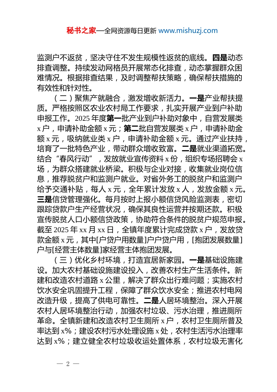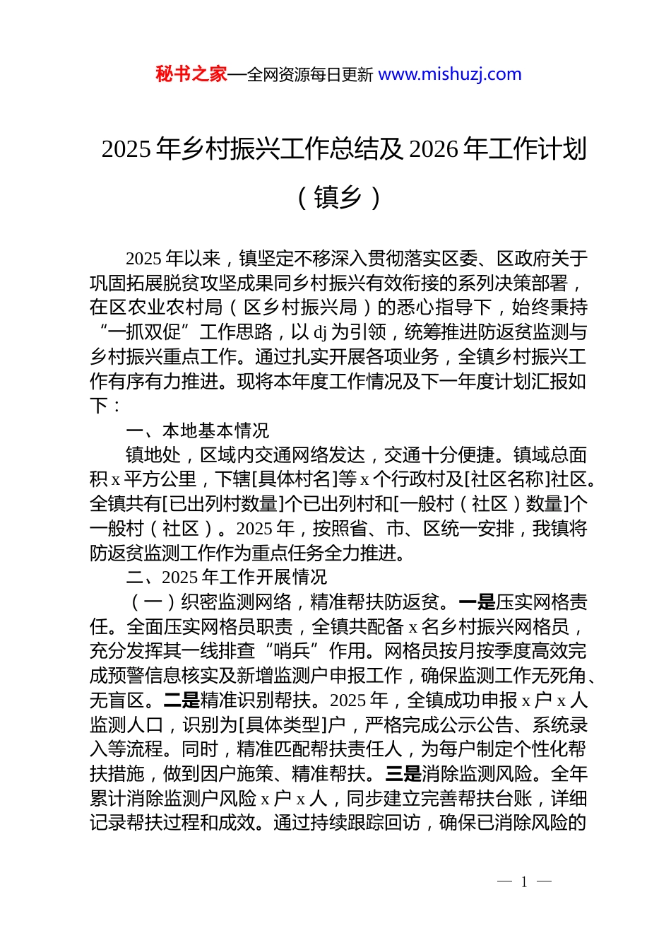 秘书之家—全网资源每日更新 www.mishuzj.com2025 年乡村振兴工作总结及 2026 年工作计划(镇乡)2025 年以来,镇坚定不移深入贯彻落实区委、区政府关于巩固拓展脱贫攻坚成果同乡村振兴有效衔接的系列决策部署,在区农业农村局(区乡村振兴局)的悉心指导下,始终秉持“一抓双促”工作思路,以 dj 为引领,统筹推进防返贫监测与乡村振兴重点工作。通过扎实开展各项业务,全镇乡村振兴工作有序有力推进。现将本年度工作情况及下一年度计划汇报如下:一、本地基本情况镇地处,区域内交通网络发达,交通十分便捷。镇域总面积 x 平方公里,下辖[具体村名]等 x 个行政村及[社区名称]社区。全镇共有[已出列村数量]个已出列村和[一般村(社区)数量]个一般村(社区)。2025 年,按照省、市、区统一安排,我镇将防返贫监测工作作为重点任务全力推进。二、2025 年工作开展情况(一)织密监测网络,精准帮扶防返贫。一是压实网格责任。全面压实网格员职责,全镇共配备 x 名乡村振兴网格员,充分发挥其一线排查“哨兵”作用。网格员按月按季度高效完成预警信息核实及新增监测户申报工作,确保监测工作无死角、无盲区。二是精准识别帮扶。2025 年,全镇成功申报 x 户 x 人监测人口,识别为[具体类型]户,严格完成公示公告、系统录入等流程。同时,精准匹配帮扶责任人,为每户制定个性化帮扶措施,做到因户施策、精准帮扶。三是消除监测风险。全年累计消除监测户风险 x 户 x 人,同步建立完善帮扶台账,详细记录帮扶过程和成效。通过持续跟踪回访,确保已消除风险的— 1 —秘书之家—全网资源每日更新 www.mishuzj.com监测户不返贫,坚决守住不发生规模性返贫的底线。四是动态排查调整。持续发动网格员开展常态化排查,动态掌握群众困难情况。根据排查结果,及时调整帮扶策略,确保帮扶措施的有效性和针对性。(二)聚焦产就融合,激发增收新活力。一是产业帮扶提质。严格按照区农业农村局工作要求,扎实开展产业到户补助申报工作。2025 年度第一批产业到户补助对象中,自营发展类x 户,申请补助金额 x 元;第二批自营发展类 x 户,申请补助金额 x 元,吸纳就业类 x 户,申请补助金额 x 元。通过产业扶持,培育了一批特色产业,带动群众增收致富。二是就业渠道拓宽。结合“春风行动”,发放就业宣传资料 x 份,组织专场招聘会 x场,为群众搭建就业桥梁。积极与企业对接,收集就业岗位信息,推荐脱贫户和监测户就业。对省外务工的脱贫户和监测户给予交通补贴,每人 x 元,全年累计发放 x 人,发放金额 x 元。三是信贷管理强化。每月按时上报小额信贷风险监测表,密切跟踪贷款户生产经营状况,确保其良性运营并按期还款。积极宣传脱贫人口小额信贷政策,协助符合条件的脱贫户规范申报。截至 2025 年 xx 月 xx 日,全镇年度累计完成贷款 x 户,发放贷款金额 x 元,其中[户贷户用数量]户户贷户用,[抱团发展数量]户与[经营主体数量]家经营主体抱团发展。(三)优化乡村环境,打造宜居新家园。一是基础设施建设。加大农村基础设施建设投入,改善农村生产生活条件。新建和改造农村道路 x 公里,解决了群众出行难问题;实施农村饮水安全巩固提升工程,保障了群众饮水安全;推进农村电网改造升级,提高了供电可靠性。二是人居环境整治。深入开展农村人居环境整治行动,加强农村垃圾、污水治理,推进厕所革命。全镇新建和改造农村卫生厕所 x 户,农村卫生厕所普及率达到 x%;建设农村污水处理设施 x 处,农村生活污水治理率达到 x%;建立健全农村垃圾收运处置体系,农村垃圾无害化— 2 —秘书之家—全网资源每日更新 www.mishuzj.com处理率达到 x%。三是生态环境保护。加强农村生态环境保护,推进山水林田湖草系统治理。开展植树造林活动,新增造林面积 x 亩;加强对农村饮用水水源地的保护,确保水质安全;加强对农业面源污染的治理,减少化肥、农药使用量。(四)强化文化建设,培育文明新风尚。一是文化设施完善。加大农村文化设施建设投入,完善农村公共文化服务体系。新建和改造农村文化活动室 x 个,建设农村文化广场 ...