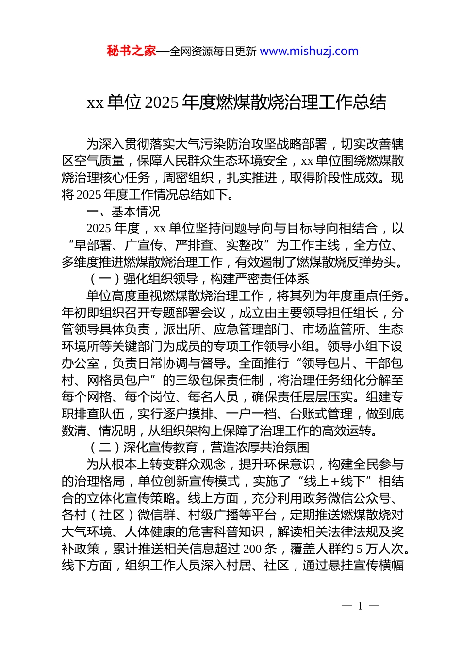 秘书之家—全网资源每日更新 www.mishuzj.comxx 单位 2025 年度燃煤散烧治理工作总结为深入贯彻落实大气污染防治攻坚战略部署,切实改善辖区空气质量,保障人民群众生态环境安全,xx 单位围绕燃煤散烧治理核心任务,周密组织,扎实推进,取得阶段性成效。现将 2025 年度工作情况总结如下。一、基本情况2025 年度,xx 单位坚持问题导向与目标导向相结合,以“早部署、广宣传、严排查、实整改”为工作主线,全方位、多维度推进燃煤散烧治理工作,有效遏制了燃煤散烧反弹势头。(一)强化组织领导,构建严密责任体系单位高度重视燃煤散烧治理工作,将其列为年度重点任务。年初即组织召开专题部署会议,成立由主要领导担任组长,分管领导具体负责,派出所、应急管理部门、市场监管所、生态环境所等关键部门为成员的专项工作领导小组。领导小组下设办公室,负责日常协调与督导。全面推行“领导包片、干部包村、网格员包户”的三级包保责任制,将治理任务细化分解至每个网格、每个岗位、每名人员,确保责任层层压实。组建专职排查队伍,实行逐户摸排、一户一档、台账式管理,做到底数清、情况明,从组织架构上保障了治理工作的高效运转。(二)深化宣传教育,营造浓厚共治氛围为从根本上转变群众观念,提升环保意识,构建全民参与的治理格局,单位创新宣传模式,实施了“线上+线下”相结合的立体化宣传策略。线上方面,充分利用政务微信公众号、各村(社区)微信群、村级广播等平台,定期推送燃煤散烧对大气环境、人体健康的危害科普知识,解读相关法律法规及奖补政策,累计推送相关信息超过 200 条,覆盖人群约 5 万人次。线下方面,组织工作人员深入村居、社区,通过悬挂宣传横幅— 1 —秘书之家—全网资源每日更新 www.mishuzj.com80 余条、发放《致居民的一封信》及环保知识宣传彩页 1.5 万份、设立现场咨询台等方式,面对面解答群众疑问。同时,公开并畅通 24 小时监督举报电话,鼓励群众举报违规销售、运输、使用燃煤行为,形成了“人人知晓、户户支持、共同监督”的良好社会氛围。(三)推行网格管理,实现源头精准管控依托既有社会治理网格化管理体系,将燃煤散烧治理工作全面融入网格日常。按照“划片包点、责任到人”的原则,将辖区划分为 xx 个一级网格、xx 个二级网格和 xx 个三级网格,配备专兼职网格员 xx 名。网格员聚焦辖区内农户、临街商铺、餐饮摊点、养殖场等重点对象,开展常态化、拉网式入户排查与巡查。重点检查是否储存、使用散煤,清洁取暖设备是否正常运行等。对排查中发现的隐患问题,现场记录、即时上报、限期整改、跟踪销号,确保整治工作无盲区、无死角,坚决杜绝燃煤散烧现象。(四)聚焦关键环节,提升联合执法效能坚持源头严防、过程严管、后果严惩。联合市场监管、交通公安等部门,定期开展联合执法行动,对辖区交界处、主要交通要道等重点区域进行布控,严厉打击非法运输、销售散煤行为。全年开展联合执法行动 15 次,查处非法运输车辆 3 台次,取缔非法散煤销售点 2 处。对在排查中发现的仍使用散煤的居民,坚持以教育引导为主,督促其限期整改;对于屡教不改或性质严重的商户,依法依规进行处理,形成了有力震慑。二、存在问题在总结成绩的同时,也清醒地认识到,燃煤散烧治理是一项长期性、复杂性、艰巨性的系统工程,当前工作中仍面临诸多深层次的矛盾和问题。(一)群众思想认识存在温差,传统习惯转变缓慢部分群众,尤其是中老年群体,对燃煤散烧的环境危害性— 2 —秘书之家—全网资源每日更新 www.mishuzj.com认识不足,存在“祖祖辈辈都这么烧,未见有大碍”的惯性思维。尽管宣传工作持续开展,但思想上的“疙瘩”仍未完全解开。同时,清洁取暖成本相对散煤取暖更高,虽然政府有一定补贴,但部分居民经济承受能力有限,存在“用不起、不愿用”的顾虑,导致政策落地“最后一公里”受阻,个别区域存在隐蔽性、间歇性“返烧”现象。(二)资源保障压力持续存在,经济激励效率有待提升燃煤散烧治理,特别是清洁能源替代改造,需要巨大的资金投入。当前主要依靠财政投入,市、区两级财政面临较大压力。补贴...