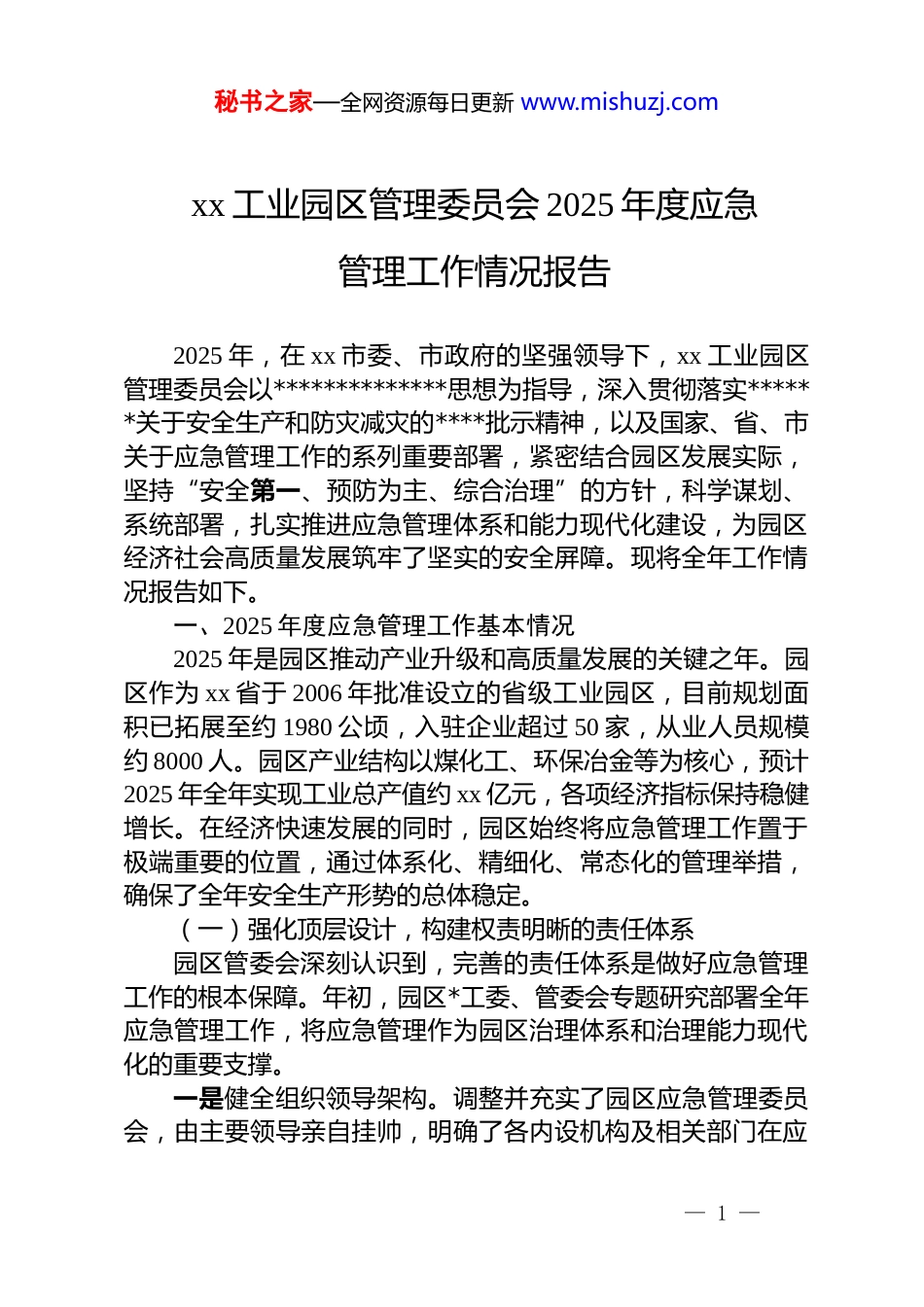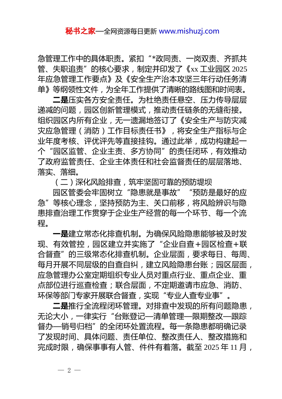 秘书之家—全网资源每日更新 www.mishuzj.comxx 工业园区管理委员会 2025 年度应急管理工作情况报告2025 年,在 xx 市委、市政府的坚强领导下,xx 工业园区管理委员会以**************思想为指导,深入贯彻落实******关于安全生产和防灾减灾的****批示精神,以及国家、省、市关于应急管理工作的系列重要部署,紧密结合园区发展实际,坚持“安全第一、预防为主、综合治理”的方针,科学谋划、系统部署,扎实推进应急管理体系和能力现代化建设,为园区经济社会高质量发展筑牢了坚实的安全屏障。现将全年工作情况报告如下。一、2025 年度应急管理工作基本情况2025 年是园区推动产业升级和高质量发展的关键之年。园区作为 xx 省于 2006 年批准设立的省级工业园区,目前规划面积已拓展至约 1980 公顷,入驻企业超过 50 家,从业人员规模约 8000 人。园区产业结构以煤化工、环保冶金等为核心,预计2025 年全年实现工业总产值约 xx 亿元,各项经济指标保持稳健增长。在经济快速发展的同时,园区始终将应急管理工作置于极端重要的位置,通过体系化、精细化、常态化的管理举措,确保了全年安全生产形势的总体稳定。(一)强化顶层设计,构建权责明晰的责任体系园区管委会深刻认识到,完善的责任体系是做好应急管理工作的根本保障。年初,园区*工委、管委会专题研究部署全年应急管理工作,将应急管理作为园区治理体系和治理能力现代化的重要支撑。一是健全组织领导架构。调整并充实了园区应急管理委员会,由主要领导亲自挂帅,明确了各内设机构及相关部门在应— 1 —秘书之家—全网资源每日更新 www.mishuzj.com急管理工作中的具体职责。紧扣“*政同责、一岗双责、齐抓共管、失职追责”的核心要求,制定并印发了《xx 工业园区 2025年应急管理工作要点》及《安全生产治本攻坚三年行动任务清单》等纲领性文件,为全年工作提供了清晰的路线图和时间表。二是压实各方安全责任。为杜绝责任悬空、压力传导层层递减的问题,园区创新管理模式,推动责任链条的无缝衔接。组织园区内所有企业,无一遗漏地签订了《安全生产与防灾减灾应急管理(消防)工作目标责任书》,将安全生产指标与企业年度考核、评优评先等直接挂钩。通过此举,成功构建起一个“园区监管、企业主责、多方协同”的责任闭环,有效推动了政府监管责任、企业主体责任和社会监督责任的层层落地、落实、落细。(二)深化风险排查,筑牢坚固可靠的预防堤坝园区管委会牢固树立“隐患就是事故”“预防是最好的应急”等核心理念,坚持预防为主、关口前移,将风险辨识与隐患排查治理工作贯穿于企业生产经营的每一个环节、每一个流程。一是建立常态化排查机制。为确保风险隐患能够被及时发现、有效管控,园区建立并实施了“企业自查+园区检查+联合督查”的三级常态化排查机制。企业层面,要求每日、每周、每月开展不同层级的自查自纠,建立风险隐患台账;园区层面,应急管理办公室定期组织专业人员对重点行业、重点企业、重点部位进行巡查检查;联合层面,不定期邀请市应急、消防、环保等部门专家开展联合督查,实现“专业人查专业事”。二是推行全流程闭环管理。对排查中发现的所有问题隐患,无论大小,一律实行“台账登记—清单管理—限期整改—跟踪督办—销号归档”的全闭环处置流程。每一条隐患都明确记录了发现时间、具体问题、责任单位、整改责任人、整改措施和完成时限,确保事事有人管、件件有着落。截至 2025 年 11 月,— 2 —秘书之家—全网资源每日更新 www.mishuzj.com园区累计组织各类检查 40 余次,排查发现问题隐患 114 条,已高标准完成整改 107 条,整改完成率达到 93.8%。对于剩余 7条因整改周期较长、技术方案复杂等客观原因尚未完成的隐患,均已制定了严密的闭环整改计划,并落实了临时管控措施,确保风险始终处于可控状态,持续提升了企业的本质安全水平。(三)夯实基层基础,提升科学高效的处置能力强大的应急处置能力是抵御风险、化解危机的最后一道防线。园区管委会对标“统一指挥、专常兼备、反应灵敏、上下联动”的应急救援体系建设要求,持续加大投入,全面强化应急...