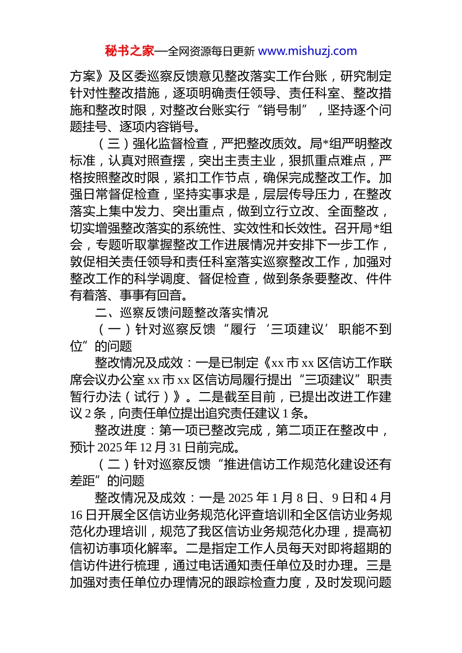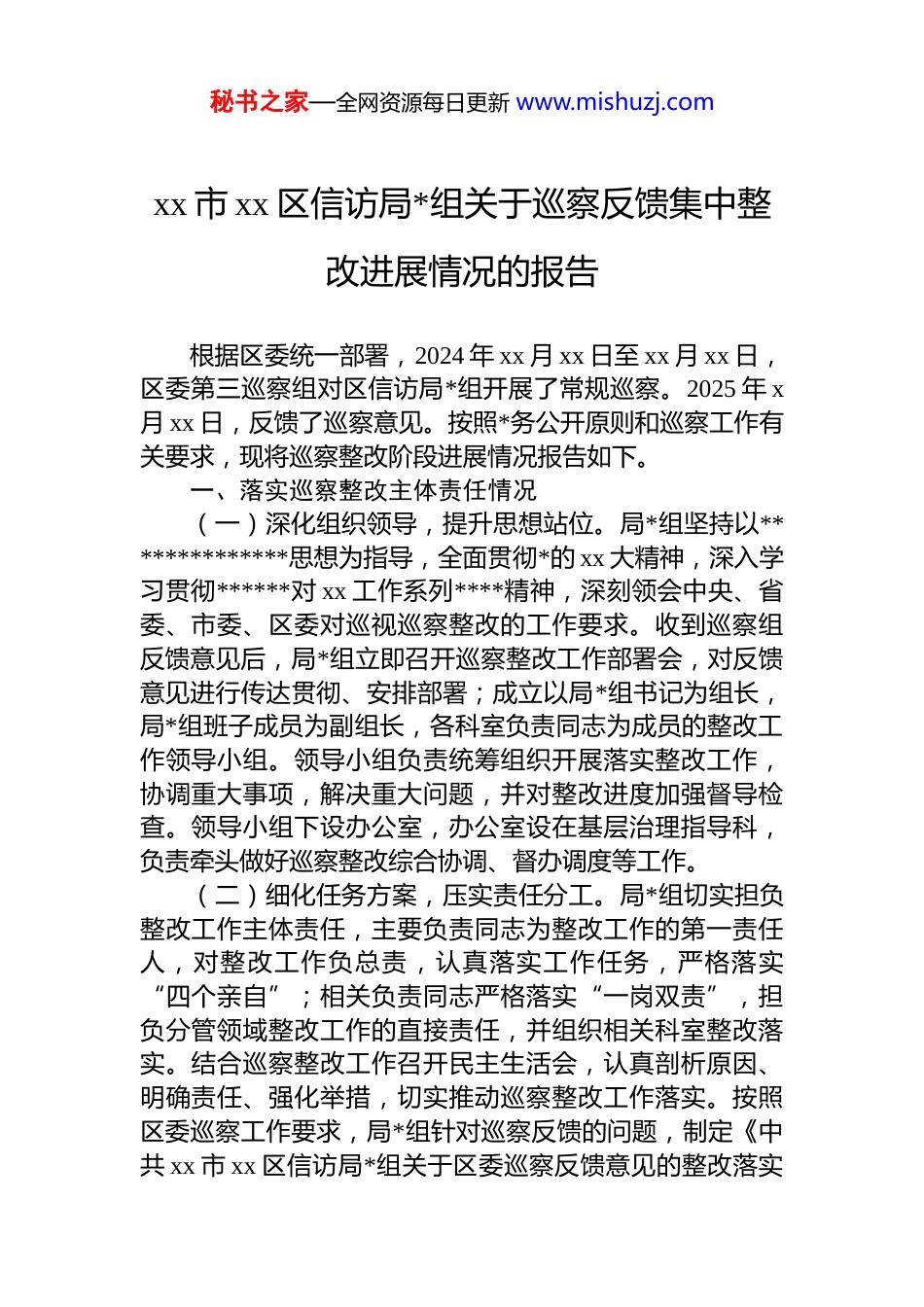 秘书之家—全网资源每日更新 www.mishuzj.comxx 市 xx 区信访局*组关于巡察反馈集中整改进展情况的报告根据区委统一部署,2024 年 xx 月 xx 日至 xx 月 xx 日,区委第三巡察组对区信访局*组开展了常规巡察。2025 年 x月 xx 日,反馈了巡察意见。按照*务公开原则和巡察工作有关要求,现将巡察整改阶段进展情况报告如下。一、落实巡察整改主体责任情况(一)深化组织领导,提升思想站位。局*组坚持以**************思想为指导,全面贯彻*的 xx 大精神,深入学习贯彻******对 xx 工作系列****精神,深刻领会中央、省委、市委、区委对巡视巡察整改的工作要求。收到巡察组反馈意见后,局*组立即召开巡察整改工作部署会,对反馈意见进行传达贯彻、安排部署;成立以局*组书记为组长,局*组班子成员为副组长,各科室负责同志为成员的整改工作领导小组。领导小组负责统筹组织开展落实整改工作,协调重大事项,解决重大问题,并对整改进度加强督导检查。领导小组下设办公室,办公室设在基层治理指导科,负责牵头做好巡察整改综合协调、督办调度等工作。(二)细化任务方案,压实责任分工。局*组切实担负整改工作主体责任,主要负责同志为整改工作的第一责任人,对整改工作负总责,认真落实工作任务,严格落实“四个亲自”;相关负责同志严格落实“一岗双责”,担负分管领域整改工作的直接责任,并组织相关科室整改落实。结合巡察整改工作召开民主生活会,认真剖析原因、明确责任、强化举措,切实推动巡察整改工作落实。按照区委巡察工作要求,局*组针对巡察反馈的问题,制定《中共 xx 市 xx 区信访局*组关于区委巡察反馈意见的整改落实秘书之家—全网资源每日更新 www.mishuzj.com方案》及区委巡察反馈意见整改落实工作台账,研究制定针对性整改措施,逐项明确责任领导、责任科室、整改措施和整改时限,对整改台账实行“销号制”,坚持逐个问题挂号、逐项内容销号。(三)强化监督检查,严把整改质效。局*组严明整改标准,认真对照查摆,突出主责主业,狠抓重点难点,严格按照整改时限,紧扣工作节点,确保完成整改工作。加强日常督促检查,坚持实事求是,层层传导压力,在整改落实上集中发力、突出重点,做到立行立改、全面整改,切实增强整改落实的系统性、实效性和长效性。召开局*组会,专题听取掌握整改工作进展情况并安排下一步工作,敦促相关责任领导和责任科室落实巡察整改工作,加强对整改工作的科学调度、督促检查,做到条条要整改、件件有着落、事事有回音。二、巡察反馈问题整改落实情况(一)针对巡察反馈“履行‘三项建议’职能不到位”的问题整改情况及成效:一是已制定《xx 市 xx 区信访工作联席会议办公室 xx 市 xx 区信访局履行提出“三项建议”职责暂行办法(试行)》。二是截至目前,已提出改进工作建议 2 条,向责任单位提出追究责任建议 1 条。整改进度:第一项已整改完成,第二项正在整改中,预计 2025 年 12 月 31 日前完成。(二)针对巡察反馈“推进信访工作规范化建设还有差距”的问题整改情况及成效:一是 2025 年 1 月 8 日、9 日和 4 月16 日开展全区信访业务规范化评查培训和全区信访业务规范化办理培训,规范了我区信访业务规范化办理,提高初信初访事项化解率。二是指定工作人员每天对即将超期的信访件进行梳理,通过电话通知责任单位及时办理。三是加强对责任单位办理情况的跟踪检查力度,及时发现问题秘书之家—全网资源每日更新 www.mishuzj.com对办理不规范的信访事项通知责任单位进行整改。整改进度:第一项已整改完成;第二、三项已整改并长期坚持。(三)针对巡察反馈“理论中心组学习不规范”的问题整改情况及成效:对照年度《全区*委(*组)理论学习中心组学习专题学习安排意见》,2025 年 4 月 28 日印发《局*组理论学习中心组 2025 年度学习计划》;截至 2025年 11 月底,局*组理论学习中心组开展集中学习 11 次,其中 2025 年 2 月 5 日、4 月 18 日、5 月 21 日、7 月 21 日、9月 25 日、11 月 21 日开展集中研讨,2025 年 12 月将按计划开展理论中...