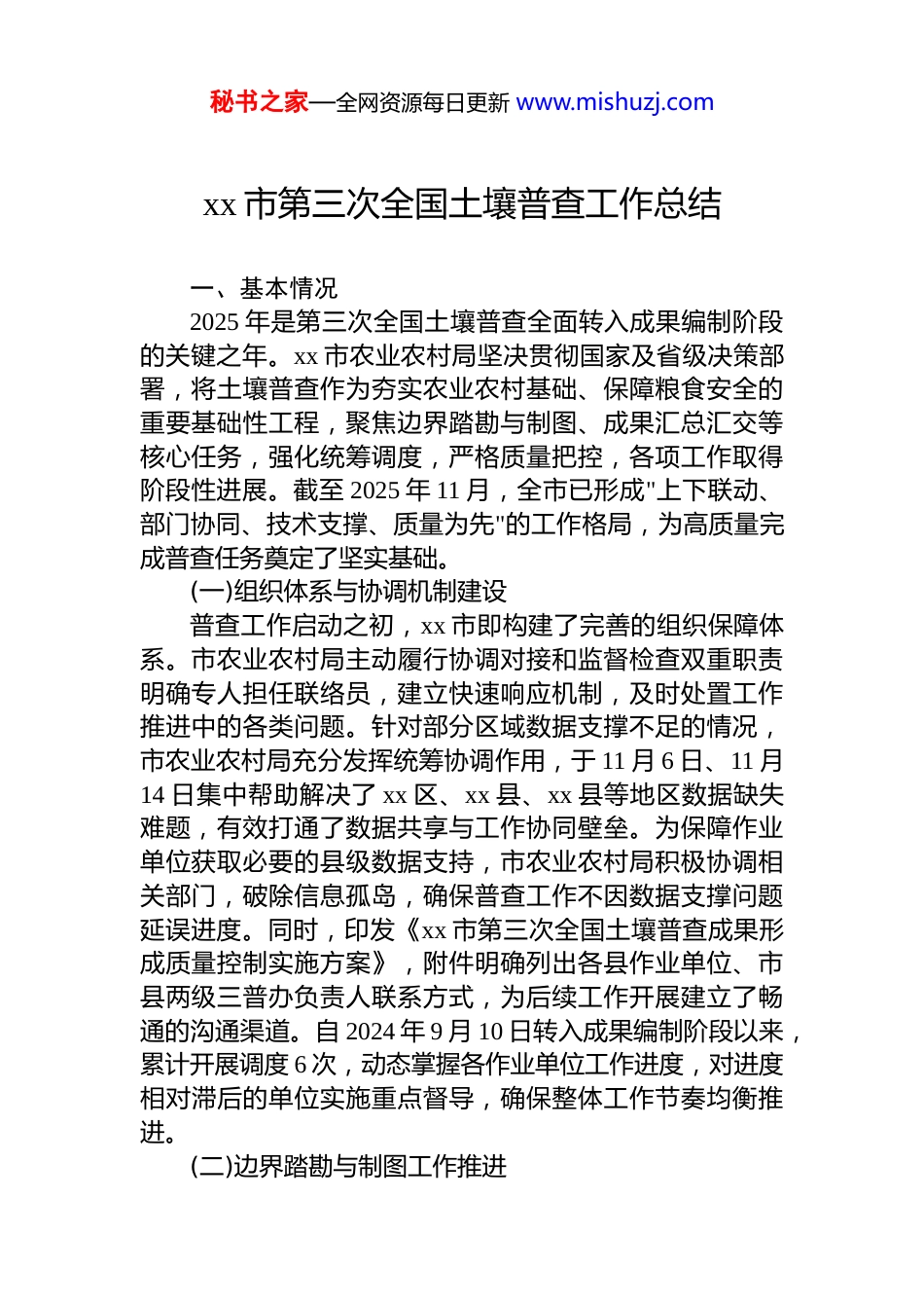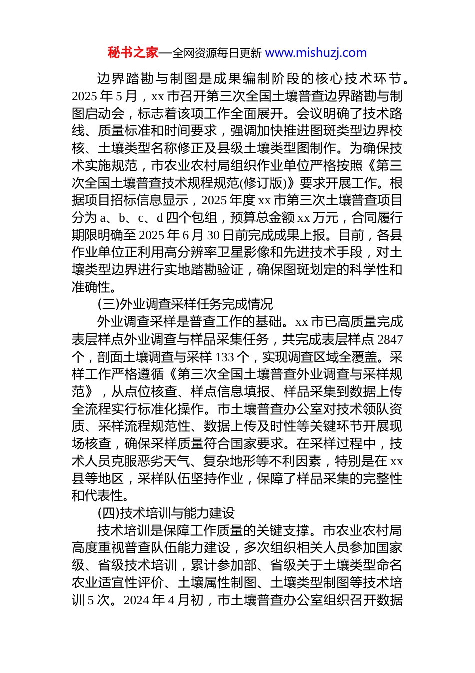 秘书之家—全网资源每日更新 www.mishuzj.comxx 市第三次全国土壤普查工作总结一、基本情况2025 年是第三次全国土壤普查全面转入成果编制阶段的关键之年。xx 市农业农村局坚决贯彻国家及省级决策部署,将土壤普查作为夯实农业农村基础、保障粮食安全的重要基础性工程,聚焦边界踏勘与制图、成果汇总汇交等核心任务,强化统筹调度,严格质量把控,各项工作取得阶段性进展。截至 2025 年 11 月,全市已形成"上下联动、部门协同、技术支撑、质量为先"的工作格局,为高质量完成普查任务奠定了坚实基础。(一)组织体系与协调机制建设普查工作启动之初,xx 市即构建了完善的组织保障体系。市农业农村局主动履行协调对接和监督检查双重职责明确专人担任联络员,建立快速响应机制,及时处置工作推进中的各类问题。针对部分区域数据支撑不足的情况,市农业农村局充分发挥统筹协调作用,于 11 月 6 日、11 月14 日集中帮助解决了 xx 区、xx 县、xx 县等地区数据缺失难题,有效打通了数据共享与工作协同壁垒。为保障作业单位获取必要的县级数据支持,市农业农村局积极协调相关部门,破除信息孤岛,确保普查工作不因数据支撑问题延误进度。同时,印发《xx 市第三次全国土壤普查成果形成质量控制实施方案》,附件明确列出各县作业单位、市县两级三普办负责人联系方式,为后续工作开展建立了畅通的沟通渠道。自 2024 年 9 月 10 日转入成果编制阶段以来,累计开展调度 6 次,动态掌握各作业单位工作进度,对进度相对滞后的单位实施重点督导,确保整体工作节奏均衡推进。(二)边界踏勘与制图工作推进秘书之家—全网资源每日更新 www.mishuzj.com边界踏勘与制图是成果编制阶段的核心技术 环节。2025 年 5 月,xx 市召开第三次全国土壤普查边界踏勘与制图启动会,标志着该项工作全面展开。会议明确了技术路线、质量标准和时间要求,强调加快推进图斑类型边界校核、土壤类型名称修正及县级土壤类型图制作。为确保技术实施规范,市农业农村局组织作业单位严格按照《第三次全国土壤普查技术规程规范(修订版)》要求开展工作。根据项目招标信息显示,2025 年度 xx 市第三次土壤普查项目分为 a、b、c、d 四个包组,预算总金额 xx 万元,合同履行期限明确至 2025 年 6 月 30 日前完成成果上报。目前,各县作业单位正利用高分辨率卫星影像和先进技术手段,对土壤类型边界进行实地踏勘验证,确保图斑划定的科学性和准确性。(三)外业调查采样任务完成情况外业调查采样是普查工作的基础。xx 市已高质量完成表层样点外业调查与样品采集任务,共完成表层样点 2847个,剖面土壤调查与采样 133 个,实现调查区域全覆盖。采样工作严格遵循《第三次全国土壤普查外业调查与采样规范》,从点位核查、样点信息填报、样品采集到数据上传全流程实行标准化操作。市土壤普查办公室对技术领队资质、采样流程规范性、数据上传及时性等关键环节开展现场核查,确保采样质量符合国家要求。在采样过程中,技术人员克服恶劣天气、复杂地形等不利因素,特别是在 xx县等地区,采样队伍坚持作业,保障了样品采集的完整性和代表性。(四)技术培训与能力建设技术培训是保障工作质量的关键支撑。市农业农村局高度重视普查队伍能力建设,多次组织相关人员参加国家级、省级技术培训,累计参加部、省级关于土壤类型命名农业适宜性评价、土壤属性制图、土壤类型制图等技术培训 5 次。2024 年 4 月初,市土壤普查办公室组织召开数据秘书之家—全网资源每日更新 www.mishuzj.com审核、成果编制暨盐碱地综合利用技术培训会议,各县三普办负责同志及盐碱地治理工作负责人参加培训。20xx 年 5月,组织开展全市表层采样技术培训,各县三普工作人员及企事业单位技术人员近百人参训。培训内容涵盖平台使用、采样技术、质量控制等实操要点,有效提升了基层技术人员的专业能力。省级层面的培训活动也为 xx 市提供了重要支持,河北省举办的培训班效果良好,学员外业调查采样能力水平明显提升。(五)质量控制体系运行质量控制贯穿普查工作全过程。市农业农村局印发质量控制实施方案,建立了"周...