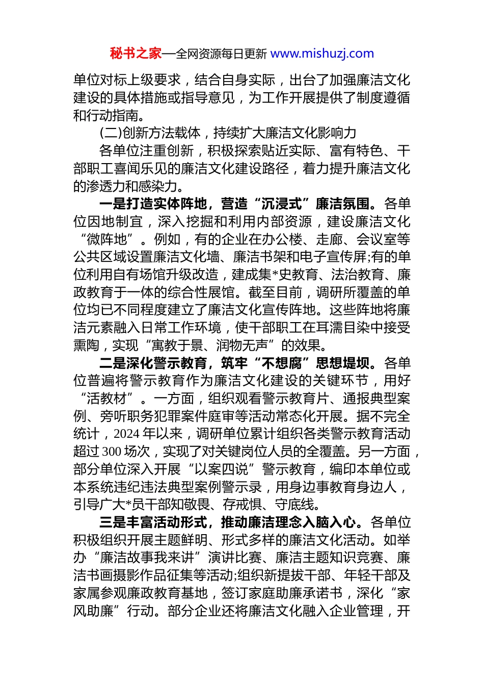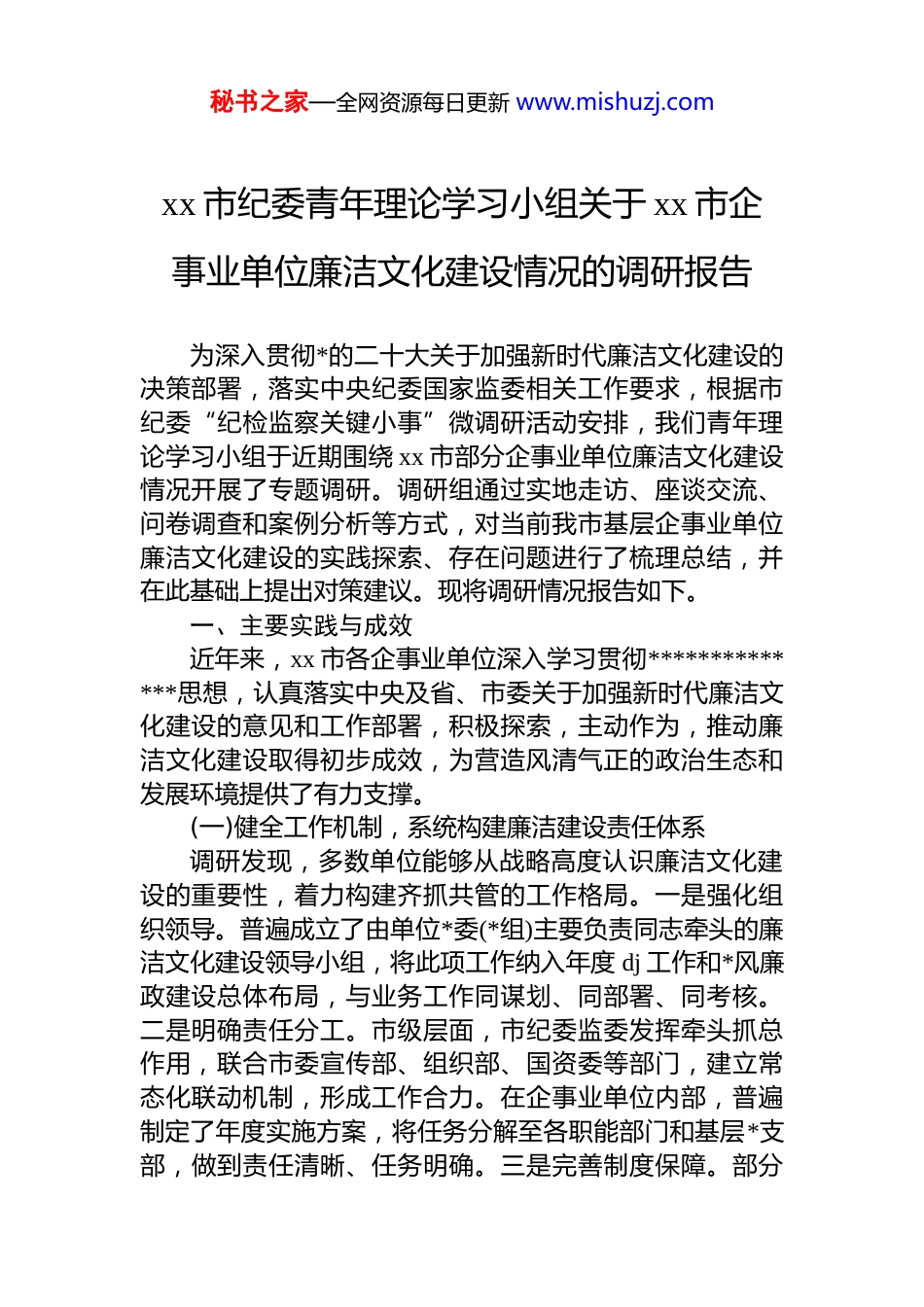 秘书之家—全网资源每日更新 www.mishuzj.comxx 市纪委青年理论学习小组关于 xx 市企事业单位廉洁文化建设情况的调研报告为深入贯彻*的二十大关于加强新时代廉洁文化建设的决策部署,落实中央纪委国家监委相关工作要求,根据市纪委“纪检监察关键小事”微调研活动安排,我们青年理论学习小组于近期围绕 xx 市部分企事业单位廉洁文化建设情况开展了专题调研。调研组通过实地走访、座谈交流、问卷调查和案例分析等方式,对当前我市基层企事业单位廉洁文化建设的实践探索、存在问题进行了梳理总结,并在此基础上提出对策建议。现将调研情况报告如下。一、主要实践与成效近年来,xx 市各企事业单位深入学习贯彻**************思想,认真落实中央及省、市委关于加强新时代廉洁文化建设的意见和工作部署,积极探索,主动作为,推动廉洁文化建设取得初步成效,为营造风清气正的政治生态和发展环境提供了有力支撑。(一)健全工作机制,系统构建廉洁建设责任体系调研发现,多数单位能够从战略高度认识廉洁文化建设的重要性,着力构建齐抓共管的工作格局。一是强化组织领导。普遍成立了由单位*委(*组)主要负责同志牵头的廉洁文化建设领导小组,将此项工作纳入年度 dj 工作和*风廉政建设总体布局,与业务工作同谋划、同部署、同考核。二是明确责任分工。市级层面,市纪委监委发挥牵头抓总作用,联合市委宣传部、组织部、国资委等部门,建立常态化联动机制,形成工作合力。在企事业单位内部,普遍制定了年度实施方案,将任务分解至各职能部门和基层*支部,做到责任清晰、任务明确。三是完善制度保障。部分秘书之家—全网资源每日更新 www.mishuzj.com单位对标上级要求,结合自身实际,出台了加强廉洁文化建设的具体措施或指导意见,为工作开展提供了制度遵循和行动指南。(二)创新方法载体,持续扩大廉洁文化影响力各单位注重创新,积极探索贴近实际、富有特色、干部职工喜闻乐见的廉洁文化建设路径,着力提升廉洁文化的渗透力和感染力。一是打造实体阵地,营造“沉浸式”廉洁氛围。各单位因地制宜,深入挖掘和利用内部资源,建设廉洁文化“微阵地”。例如,有的企业在办公楼、走廊、会议室等公共区域设置廉洁文化墙、廉洁书架和电子宣传屏;有的单位利用自有场馆升级改造,建成集*史教育、法治教育、廉政教育于一体的综合性展馆。截至目前,调研所覆盖的单位均已不同程度建立了廉洁文化宣传阵地。这些阵地将廉洁元素融入日常工作环境,使干部职工在耳濡目染中接受熏陶,实现“寓教于景、润物无声”的效果。二是深化警示教育,筑牢“不想腐”思想堤坝。各单位普遍将警示教育作为廉洁文化建设的关键环节,用好“活教材”。一方面,组织观看警示教育片、通报典型案例、旁听职务犯罪案件庭审等活动常态化开展。据不完全统计,2024 年以来,调研单位累计组织各类警示教育活动超过 300 场次,实现了对关键岗位人员的全覆盖。另一方面,部分单位深入开展“以案四说”警示教育,编印本单位或本系统违纪违法典型案例警示录,用身边事教育身边人,引导广大*员干部知敬畏、存戒惧、守底线。三是丰富活动形式,推动廉洁理念入脑入心。各单位积极组织开展主题鲜明、形式多样的廉洁文化活动。如举办“廉洁故事我来讲”演讲比赛、廉洁主题知识竞赛、廉洁书画摄影作品征集等活动;组织新提拔干部、年轻干部及家属参观廉政教育基地,签订家庭助廉承诺书,深化“家风助廉”行动。部分企业还将廉洁文化融入企业管理,开秘书之家—全网资源每日更新 www.mishuzj.com展“廉洁文化月”活动,要求关键岗位人员和业务合作方签订廉洁协议,覆盖率达到 100%,将廉洁要求从内部管理延伸至外部合作,构筑廉洁从业的“防火墙”。(三)聚焦特色融合,着力打造廉洁文化品牌部分单位在实践中注重挖掘自身行业特点和文化底蕴,探索形成了具有辨识度和影响力的廉洁文化品牌。一是推动廉洁文化与行业文化深度融合。例如,市属某供水企业将“清澈”作为企业文化与廉洁文化的核心连接点,通过制度建设和监督机制创新,有效降低了供水服务各环节的廉政风险,树立了良好的社会形象。市属某交通运输集团,在公交站点、出租车...