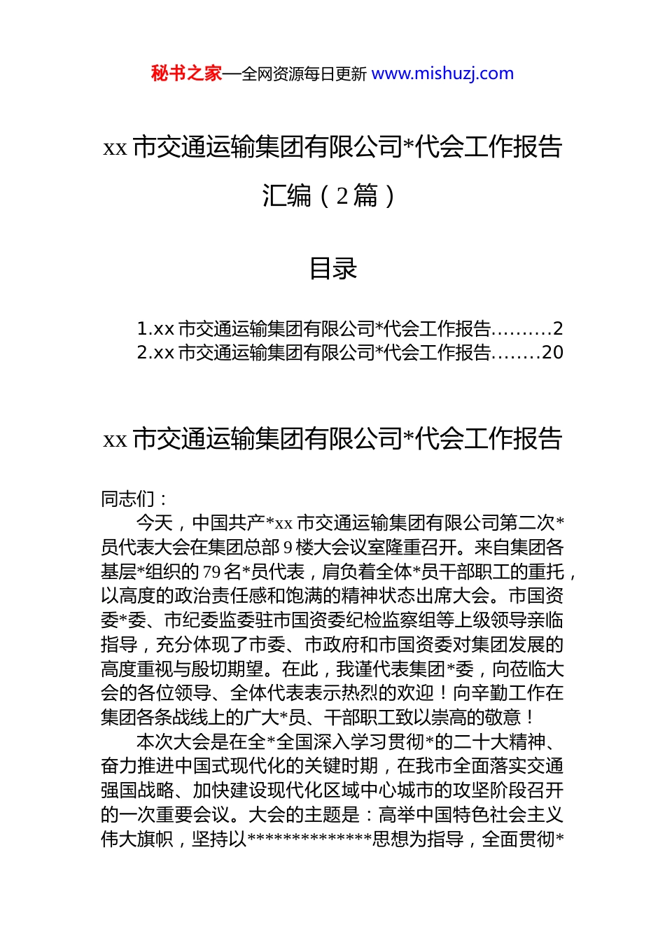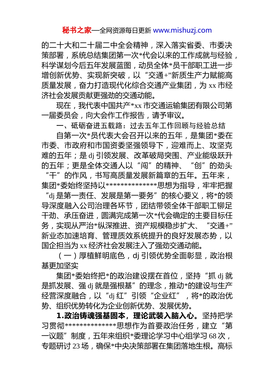 秘书之家—全网资源每日更新 www.mishuzj.comxx 市交通运输集团有限公司*代会工作报告汇编(2 篇)目录1.xx 市交通运输集团有限公司*代会工作报告..........22.xx 市交通运输集团有限公司*代会工作报告........20xx 市交通运输集团有限公司*代会工作报告同志们:今天,中国共产*xx 市交通运输集团有限公司第二次*员代表大会在集团总部 9 楼大会议室隆重召开。来自集团各基层*组织的 79 名*员代表,肩负着全体*员干部职工的重托,以高度的政治责任感和饱满的精神状态出席大会。市国资委*委、市纪委监委驻市国资委纪检监察组等上级领导亲临指导,充分体现了市委、市政府和市国资委对集团发展的高度重视与殷切期望。在此,我谨代表集团*委,向莅临大会的各位领导、全体代表表示热烈的欢迎!向辛勤工作在集团各条战线上的广大*员、干部职工致以崇高的敬意!本次大会是在全*全国深入学习贯彻*的二十大精神、奋力推进中国式现代化的关键时期,在我市全面落实交通强国战略、加快建设现代化区域中心城市的攻坚阶段召开的一次重要会议。大会的主题是:高举中国特色社会主义伟大旗帜,坚持以**************思想为指导,全面贯彻*秘书之家—全网资源每日更新 www.mishuzj.com的二十大和二十届二中全会精神,深入落实省委、市委决策部署,系统总结集团第一次*代会以来的工作成就与经验,科学谋划今后五年发展蓝图,动员全体*员干部职工进一步增创新优势、实现新突破,以“交通+”新质生产力赋能高质量发展,奋力打造现代化综合交通产业集团,为 xx 市经济社会发展贡献更强劲的交通动能。现在,我代表中国共产*xx 市交通运输集团有限公司第一届委员会,向大会作工作报告,请予审议。一、砥砺奋进五载路:过去五年工作回顾与经验总结自第一次*员代表大会召开以来的五年,是集团*委在市委、市政府和市国资委坚强领导下,迎难而上、攻坚克难的五年;是 dj 引领发展、改革破局突围、产业能级跃升的五年;更是全体交通人以“闯”的精神、“创”的劲头“干”的作风,书写高质量发展新篇章的五年。五年来,集团*委始终坚持以**************思想为指导,牢牢把握“dj 是第一责任、发展是第一要务”的核心要义,将*的领导深度融入公司治理各环节,团结带领全体干部职工铆足干劲、承压奋进,圆满完成第一次*代会确定的主要目标任务,实现从严治*纵深推进、资产规模稳步扩大、“交通+”新业态加速培育、管理质效系统提升的良好发展态势,以国企担当为 xx 经济社会发展注入了强劲交通动能。(一)厚植鲜明底色,dj 引领优势全面彰显,政治根基更加坚实集团*委始终把*的政治建设摆在首位,坚持“抓 dj 就是抓发展、强 dj 就是强根基”的理念,推动*的建设与生产经营深度融合,以“dj 红”引领“企业红”,将*的政治优势、组织优势转化为企业创新优势、发展优势。1.政治铸魂强基固本,理论武装入脑入心。坚持把学习贯彻**************思想作为首要政治任务,建立“第一议题”制度,五年来组织*委理论学习中心组学习 68 次,专题研讨 23 场,确保*中央决策部署在集团落地生根。高标秘书之家—全网资源每日更新 www.mishuzj.com准建成全市首个国有企业*史学习教育基地,打造“沉浸式+互动式”学习平台,累计开展主题*日活动 320 余场次,覆盖*员职工 8000 余人次。创新开展“交通大讲堂”“红色微*课”等特色活动,举办*史知识竞赛、主题演讲比赛 46场,其中“百年*史·交通印记”主题竞赛获市级优秀组织奖。通过“线上+线下”双轮驱动,推动*的创新理论进车间、进班组、进项目一线,引导*员干部深刻领悟“两个确立”的决定性意义,增强“四个意识”、坚定“四个自信”、做到“两个维护”,确保集团发展始终沿着正确政治方向前进。2.骨干队伍梯次培养,人才强企成效显著。出台《集团骨干队伍建设中长期规划(2020-2025)》及竞争上岗、轮岗交流等 8 项选人用人制度,实施“青苗计划”“头雁工程”,建立年轻干部重点培养库,五年来公开选拔中层干部 46 人次,其中“85 后”干部占比达 35%,干部队伍结构实现年轻化、专业化、知识化。创新“订单式”人才培养模式,联合...