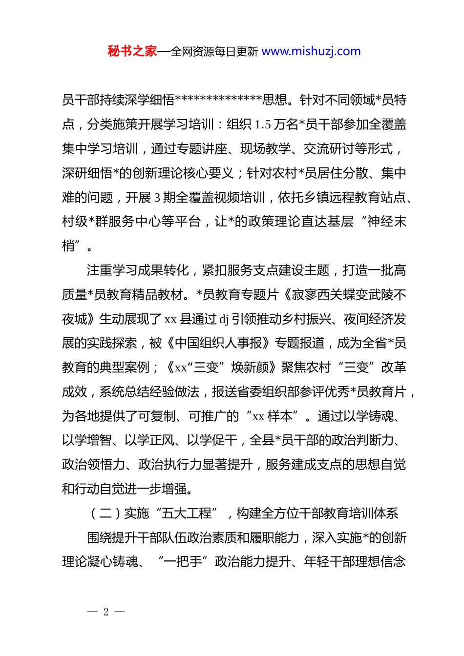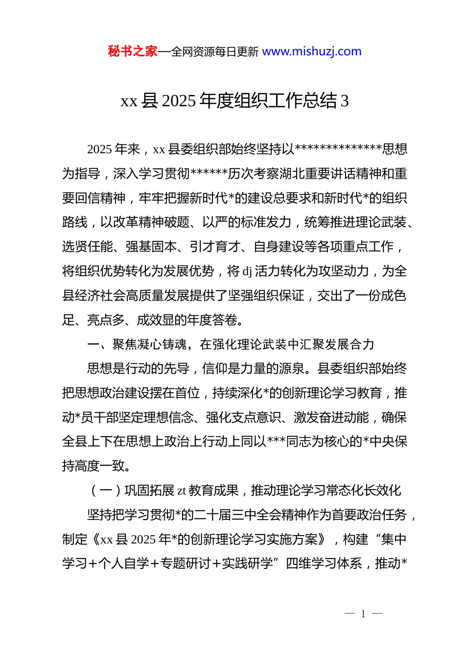 秘书之家—全网资源每日更新 www.mishuzj.comxx 县 2025 年度组织工作总结 32025 年来,xx 县委组织部始终坚持以**************思想为指导,深入学习贯彻******历次考察湖北重要讲话精神和重要回信精神,牢牢把握新时代*的建设总要求和新时代*的组织路线,以改革精神破题、以严的标准发力,统筹推进理论武装、选贤任能、强基固本、引才育才、自身建设等各项重点工作,将组织优势转化为发展优势,将 dj 活力转化为攻坚动力,为全县经济社会高质量发展提供了坚强组织保证,交出了一份成色足、亮点多、成效显的年度答卷。一、聚焦凝心铸魂,在强化理论武装中汇聚发展合力思想是行动的先导,信仰是力量的源泉。县委组织部始终把思想政治建设摆在首位,持续深化*的创新理论学习教育,推动*员干部坚定理想信念、强化支点意识、激发奋进动能,确保全县上下在思想上政治上行动上同以***同志为核心的*中央保持高度一致。(一)巩固拓展 zt 教育成果,推动理论学习常态化长效化坚持把学习贯彻*的二十届三中全会精神作为首要政治任务,制定《xx 县 2025 年*的创新理论学习实施方案》,构建“集中学习+个人自学+专题研讨+实践研学”四维学习体系,推动*— 1 —秘书之家—全网资源每日更新 www.mishuzj.com员干部持续深学细悟**************思想。针对不同领域*员特点,分类施策开展学习培训:组织 1.5 万名*员干部参加全覆盖集中学习培训,通过专题讲座、现场教学、交流研讨等形式,深研细悟*的创新理论核心要义;针对农村*员居住分散、集中难的问题,开展 3 期全覆盖视频培训,依托乡镇远程教育站点、村级*群服务中心等平台,让*的政策理论直达基层“神经末梢”。注重学习成果转化,紧扣服务支点建设主题,打造一批高质量*员教育精品教材。*员教育专题片《寂寥西关蝶变武陵不夜城》生动展现了 xx 县通过 dj 引领推动乡村振兴、夜间经济发展的实践探索,被《中国组织人事报》专题报道,成为全省*员教育的典型案例;《xx“三变”焕新颜》聚焦农村“三变”改革成效,系统总结经验做法,报送省委组织部参评优秀*员教育片,为各地提供了可复制、可推广的“xx 样本”。通过以学铸魂、以学增智、以学正风、以学促干,全县*员干部的政治判断力、政治领悟力、政治执行力显著提升,服务建成支点的思想自觉和行动自觉进一步增强。(二)实施“五大工程”,构建全方位干部教育培训体系围绕提升干部队伍政治素质和履职能力,深入实施*的创新理论凝心铸魂、“一把手”政治能力提升、年轻干部理想信念— 2 —秘书之家—全网资源每日更新 www.mishuzj.com强化、干部履职能力提升、干部教育培训机构质量提升“五大工程”,精准施策开展靶向培训,推动干部教育培训提质增效。在培训载体上持续创新:举办 2025 年县委*校春季主体培训班 3 期 4 个班次,覆盖 246 名县乡两级骨干干部,课程设置聚焦政策解读、能力提升、实践应用三大板块,邀请省市专家、业务骨干、先进典型授课,实现理论学习与实践操作有机结合;组织 1 批 40 名领导干部赴“江浙闽粤”深圳开展解放思想专题培训,通过实地考察、座谈交流、案例分析等形式,学习先进地区在产业发展、基层治理、营商环境优化等方面的成功经验,推动干部打破思维定势、拓宽发展视野;举办 3 期“强县讲坛”,1700 人次领导干部登台授课、交流研讨,围绕服务支点建设、推进强县工程等重点工作谈思路、讲举措、献良策,形成“以讲促学、以学促干”的良好氛围。在培训内容上精准对接发展需求:紧扣县域数字经济与智能 ai、低空经济、林下经济等新兴产业和重点领域发展需要,开展各类专题培训 18 场,培训 1967 人次,帮助干部弥补知识弱项、能力短板、经验盲区;针对组工干部能力建设需求,创办“武陵组工”写作营,选拔 251 名组工干部参与常态化信息培训、写作调研等活动,通过专题授课、实战练兵、互评互改等方式,提升组工干部文字表达、调查研究、政策落实能力。— 3 —秘书之家—全网资源每日更新 www.mishuzj.comxx 县*员春训的创新做法被《中国组织人事报》专题推介,成为全国干部教育培训的先进典型。...