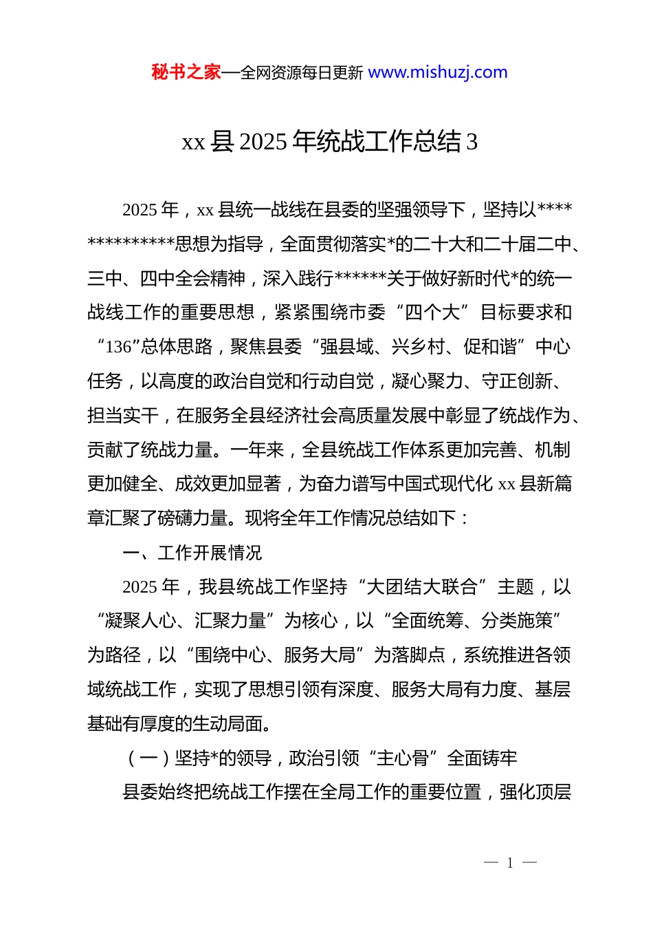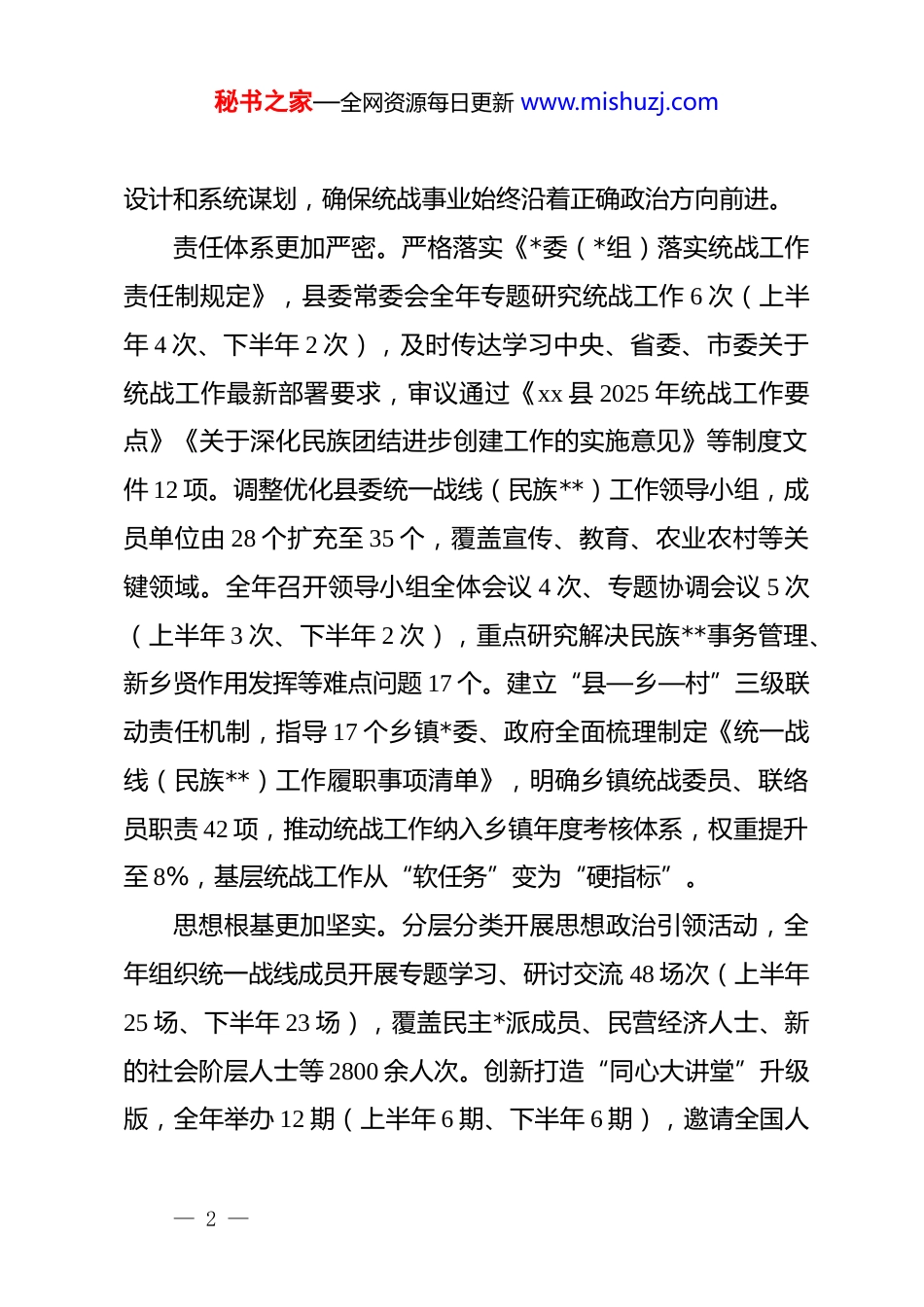 秘书之家—全网资源每日更新 www.mishuzj.comxx 县 2025 年统战工作总结 32025 年,xx 县统一战线在县委的坚强领导下,坚持以**************思想为指导,全面贯彻落实*的二十大和二十届二中、三中、四中全会精神,深入践行******关于做好新时代*的统一战线工作的重要思想,紧紧围绕市委“四个大”目标要求和“136”总体思路,聚焦县委“强县域、兴乡村、促和谐”中心任务,以高度的政治自觉和行动自觉,凝心聚力、守正创新、担当实干,在服务全县经济社会高质量发展中彰显了统战作为、贡献了统战力量。一年来,全县统战工作体系更加完善、机制更加健全、成效更加显著,为奋力谱写中国式现代化 xx 县新篇章汇聚了磅礴力量。现将全年工作情况总结如下:一、工作开展情况2025 年,我县统战工作坚持“大团结大联合”主题,以“凝聚人心、汇聚力量”为核心,以“全面统筹、分类施策”为路径,以“围绕中心、服务大局”为落脚点,系统推进各领域统战工作,实现了思想引领有深度、服务大局有力度、基层基础有厚度的生动局面。(一)坚持*的领导,政治引领“主心骨”全面铸牢县委始终把统战工作摆在全局工作的重要位置,强化顶层— 1 —秘书之家—全网资源每日更新 www.mishuzj.com设计和系统谋划,确保统战事业始终沿着正确政治方向前进。责任体系更加严密。严格落实《*委(*组)落实统战工作责任制规定》,县委常委会全年专题研究统战工作 6 次(上半年 4 次、下半年 2 次),及时传达学习中央、省委、市委关于统战工作最新部署要求,审议通过《xx 县 2025 年统战工作要点》《关于深化民族团结进步创建工作的实施意见》等制度文件 12 项。调整优化县委统一战线(民族**)工作领导小组,成员单位由 28 个扩充至 35 个,覆盖宣传、教育、农业农村等关键领域。全年召开领导小组全体会议 4 次、专题协调会议 5 次(上半年 3 次、下半年 2 次),重点研究解决民族**事务管理、新乡贤作用发挥等难点问题 17 个。建立“县—乡—村”三级联动责任机制,指导 17 个乡镇*委、政府全面梳理制定《统一战线(民族**)工作履职事项清单》,明确乡镇统战委员、联络员职责 42 项,推动统战工作纳入乡镇年度考核体系,权重提升至 8%,基层统战工作从“软任务”变为“硬指标”。思想根基更加坚实。分层分类开展思想政治引领活动,全年组织统一战线成员开展专题学习、研讨交流 48 场次(上半年25 场、下半年 23 场),覆盖民主*派成员、民营经济人士、新的社会阶层人士等 2800 余人次。创新打造“同心大讲堂”升级版,全年举办 12 期(上半年 6 期、下半年 6 期),邀请全国人— 2 —秘书之家—全网资源每日更新 www.mishuzj.com大代表、省社会主义学院专家、法律实务工作者等开展“**************思想”“铸牢中华民族共同体意识”“新修订《**事务条例》解读”等专题宣讲 8 场次。持续巩固拓展“凝心铸魂强根基·团结奋进新征程”zt 教育成果,统筹开展“同心向*·奋进新征程”系列活动:组织*史学习教育 22 场次,举办“统战故事分享会”15 场次,开展“共话发展·建言献策”座谈会 10场次,赴南梁革命纪念馆等红色教育基地开展现场教学 18 场次,覆盖统战成员 1500 余人。特别在庆祝中国共产*成立 104 周年之际,策划“七个一”系列活动(一次主题*日、一场红色诵读、一堂专题*课、一次走访慰问、一场成果展览、一次志愿服务、一场文艺汇演),参与人数超 3000 人次,有效夯实了共同思想政治基础。支持民主*派、无*派人士深入开展“学规定、强作风、树形象”zt 教育,通过集中学习、案例警示、作风评议等形式,组织廉政警示教育活动 9 场次,引导 200 余名*外人士签订《廉洁自律承诺书》,纪律规矩意识显著增强。宣传矩阵更加立体。全力构建“线上+线下”融合宣传格局,县统战微信公众号全年发布信息 320 篇(条)(上半年 86篇、下半年 234 篇),其中原创内容占比 65%,开设“统战风采”“石榴籽故事”“法大进行时”等特色专栏,刊发统战成员先进事迹 12 期、“***讲过的民族团结故事”36 期、“统战— 3...