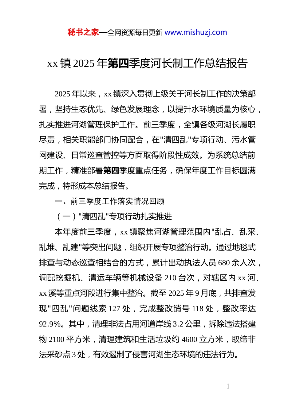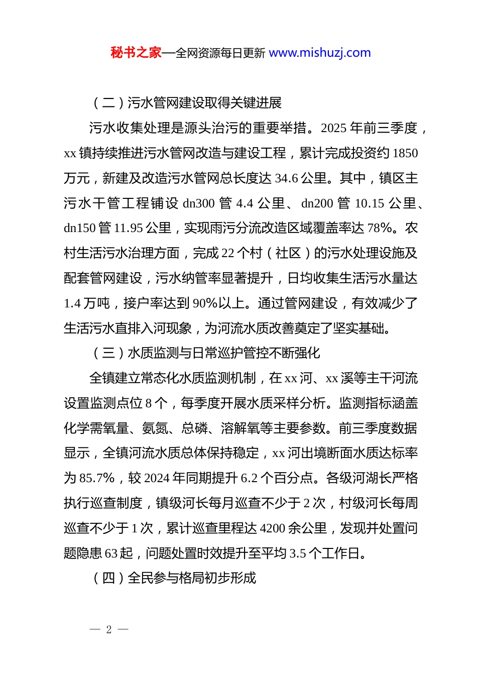 秘书之家—全网资源每日更新 www.mishuzj.comxx 镇 2025 年第四季度河长制工作总结报告2025 年以来,xx 镇深入贯彻上级关于河长制工作的决策部署,坚持生态优先、绿色发展理念,以提升水环境质量为核心,扎实推进河湖管理保护工作。前三季度,全镇各级河湖长履职尽责,相关职能部门协同配合,在"清四乱"专项行动、污水管网建设、日常巡查管控等方面取得阶段性成效。为系统总结前期工作,精准部署第四季度重点任务,确保年度工作目标圆满完成,特形成本总结报告。一、前三季度工作落实情况回顾(一)"清四乱"专项行动扎实推进本年度前三季度,xx 镇聚焦河湖管理范围内"乱占、乱采、乱堆、乱建"等突出问题,组织开展专项整治行动。通过地毯式排查与动态巡查相结合的方式,累计出动执法人员 680 余人次,调配挖掘机、清运车辆等机械设备 210 台次,对辖区内 xx 河、xx 溪等重点河段进行集中整治。截至 2025 年 9 月底,共排查发现"四乱"问题线索 127 处,完成整改销号 118 处,整改率达92.9%。其中,清理非法占用河道岸线 3.2 公里,拆除违法搭建物 2100 平方米,清理建筑和生活垃圾约 4600 立方米,取缔非法采砂点 3 处,有效遏制了侵害河湖生态环境的违法行为。— 1 —秘书之家—全网资源每日更新 www.mishuzj.com(二)污水管网建设取得关键进展污水收集处理是源头治污的重要举措。2025 年前三季度,xx 镇持续推进污水管网改造与建设工程,累计完成投资约 1850万元,新建及改造污水管网总长度达 34.6 公里。其中,镇区主污水干管工程铺设 dn300 管 4.4 公里、dn200 管 10.15 公里、dn150 管 11.95 公里,实现雨污分流改造区域覆盖率达 78%。农村生活污水治理方面,完成 22 个村(社区)的污水处理设施及配套管网建设,污水纳管率显著提升,日均收集生活污水量达1.4 万吨,接户率达到 90%以上。通过管网建设,有效减少了生活污水直排入河现象,为河流水质改善奠定了坚实基础。(三)水质监测与日常巡护管控不断强化全镇建立常态化水质监测机制,在 xx 河、xx 溪等主干河流设置监测点位 8 个,每季度开展水质采样分析。监测指标涵盖化学需氧量、氨氮、总磷、溶解氧等主要参数。前三季度数据显示,全镇河流水质总体保持稳定,xx 河出境断面水质达标率为 85.7%,较 2024 年同期提升 6.2 个百分点。各级河湖长严格执行巡查制度,镇级河长每月巡查不少于 2 次,村级河长每周巡查不少于 1 次,累计巡查里程达 4200 余公里,发现并处置问题隐患 63 起,问题处置时效提升至平均 3.5 个工作日。(四)全民参与格局初步形成— 2 —秘书之家—全网资源每日更新 www.mishuzj.com通过入户宣讲、村务公开栏、微信公众号等多种形式,开展护水宣传活动 23 场次,发放宣传资料 5600 余份,覆盖群众达 2.3 万人次。设立有奖举报渠道,收到群众有效举报信息 15条,核实后兑现奖励。组建民间护河志愿队伍 12 支,开展志愿巡查活动 45 次,形成"政府主导、部门协作、群众参与"的共治格局。二、当前存在的主要短板与问题在肯定成绩的同时,必须清醒认识到工作中存在的短板:一是水质稳定达标压力依然较大,部分支流断面在枯水期氨氮、总磷指标存在波动;二是部分老旧管网存在错接、漏接现象,影响收集效率;三是少数沿河餐饮、加工作坊存在偷排、漏排风险隐患;四是群众参与度有待进一步提升,部分村(社区)宣传覆盖面不足。三、第四季度重点工作部署针对上述问题,本次会议明确五项重点举措,确保年度任务圆满收官。(一)突出问题整改,实行清单化销号管理聚焦水质稳定核心任务,对各级督查反馈、自查发现的问题建立统一台账,明确整改责任人、整改时限和验收标准。重点针对 xx 溪支流氨氮超标问题,溯源排查上游污染源,制— 3 —秘书之家—全网资源每日更新 www.mishuzj.com定"一点一策"整治方案。建立问题整改周报制度,实行清单化管理、销号式推进,确保 12 月底前全部整改到位。同时,开展"回头看"复查,防止问题反弹。(二)压实层级责任,构建协同治水体系进一步夯实各级河湖长"第一责任人"职...