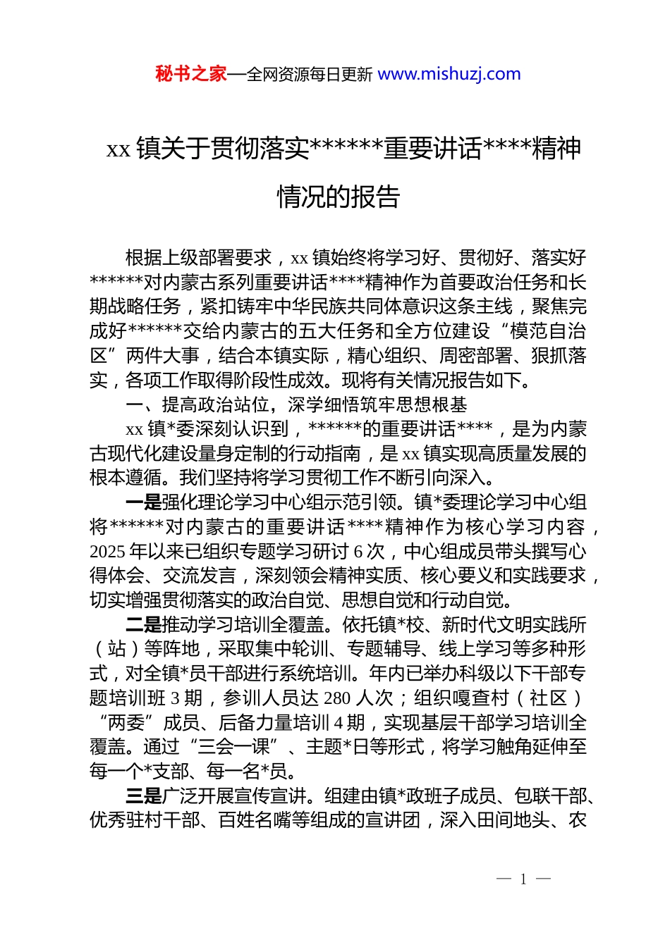 秘书之家—全网资源每日更新 www.mishuzj.comxx 镇关于贯彻落实******重要讲话****精神情况的报告根据上级部署要求,xx 镇始终将学习好、贯彻好、落实好******对内蒙古系列重要讲话****精神作为首要政治任务和长期战略任务,紧扣铸牢中华民族共同体意识这条主线,聚焦完成好******交给内蒙古的五大任务和全方位建设“模范自治区”两件大事,结合本镇实际,精心组织、周密部署、狠抓落实,各项工作取得阶段性成效。现将有关情况报告如下。一、提高政治站位,深学细悟筑牢思想根基xx 镇*委深刻认识到,******的重要讲话****,是为内蒙古现代化建设量身定制的行动指南,是 xx 镇实现高质量发展的根本遵循。我们坚持将学习贯彻工作不断引向深入。一是强化理论学习中心组示范引领。镇*委理论学习中心组将******对内蒙古的重要讲话****精神作为核心学习内容,2025 年以来已组织专题学习研讨 6 次,中心组成员带头撰写心得体会、交流发言,深刻领会精神实质、核心要义和实践要求,切实增强贯彻落实的政治自觉、思想自觉和行动自觉。二是推动学习培训全覆盖。依托镇*校、新时代文明实践所(站)等阵地,采取集中轮训、专题辅导、线上学习等多种形式,对全镇*员干部进行系统培训。年内已举办科级以下干部专题培训班 3 期,参训人员达 280 人次;组织嘎查村(社区)“两委”成员、后备力量培训 4 期,实现基层干部学习培训全覆盖。通过“三会一课”、主题*日等形式,将学习触角延伸至每一个*支部、每一名*员。三是广泛开展宣传宣讲。组建由镇*政班子成员、包联干部、优秀驻村干部、百姓名嘴等组成的宣讲团,深入田间地头、农— 1 —秘书之家—全网资源每日更新 www.mishuzj.com家院落、社区广场,用群众喜闻乐见的语言和方式,面对面宣讲******对内蒙古各族人民的深情关怀和战略指引。利用镇村两级微信公众号、宣传栏、村村通广播等载体,持续推送解读文章、宣传标语,营造了浓厚的学习贯彻氛围。二、聚焦首要任务,有形有感有效铸牢中华民族共同体意识我们牢牢把握民族团结这条生命线,将铸牢中华民族共同体意识贯穿于经济社会发展全过程各方面。一是构建宣传教育常态化机制。将铸牢中华民族共同体意识教育纳入干部教育、*员教育、国民教育、社会教育范畴。在镇中心小学深入开展“铸牢中华民族共同体意识”主题团队日活动、知识竞赛、文艺汇演。在社区、嘎查村持续开展“民族团结一家亲”主题活动,讲述民族团结进步故事,2025 年累计开展各类活动 40 余场次,参与群众超 5000 人次。二是促进各民族交往交流交融。积极创造共居共学、共建共享、共事共乐的社会条件。鼓励不同民族群众在社区网格、村民小组中混合居住,引导各族群众在农业生产、合作社经营中互助合作。举办那达慕、农民丰收节等节庆活动,搭建各民族文化交流互鉴平台。扎实做好国家通用语言文字普及推广工作。三是深化民族团结进步创建。积极开展民族团结进步示范单位、示范家庭评选活动,年内计划评选镇级示范嘎查村 2 个、示范社区 1 个、示范家庭 30 户。依法治理民族事务,保障各民族合法权益,坚决防范化解民族领域风险隐患,使“三个离不开”“四个与共”“五个认同”的思想深入人心。三、服务发展大局,全力推动经济社会高质量发展我们紧紧围绕高质量发展这个首要任务,将******的殷切期望转化为推动 xx 镇发展的生动实践。一是着力发展现代农牧业。坚决扛起粮食安全政治责任,— 2 —秘书之家—全网资源每日更新 www.mishuzj.com稳定粮食播种面积,2025 年全镇粮食播种面积保持在 x 万亩以上,预计总产量达 x 万吨。大力发展设施农业,新建高标准日光温室 50 座。优化畜牧业结构,支持肉牛、肉羊规模化标准化养殖,2025 年 6 月末,牲畜存栏头数达 x 万头只。积极培育本土农畜产品品牌,拓展线上线下销售渠道,带动农牧民增收。二是稳步推进生态文明建设。坚定不移走生态优先、绿色发展之路。严格落实草畜平衡和禁牧休牧制度,加强草原生态保护修复,年内完成草原围栏建设 x 公里、补播改良草场 x 亩。扎实推进林长制工作,加强林地巡查管护。深入开展农村人居环境...