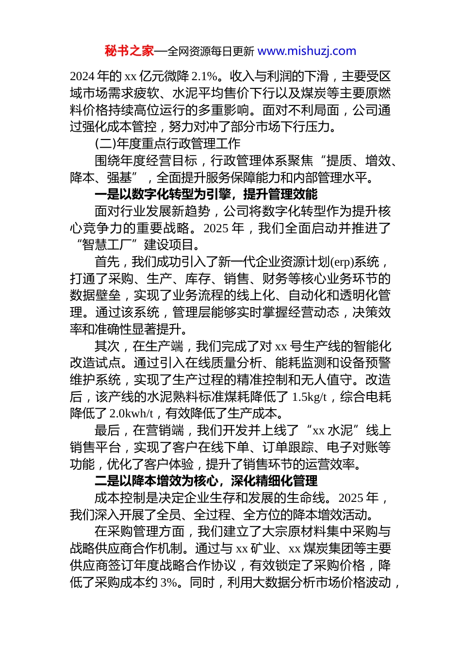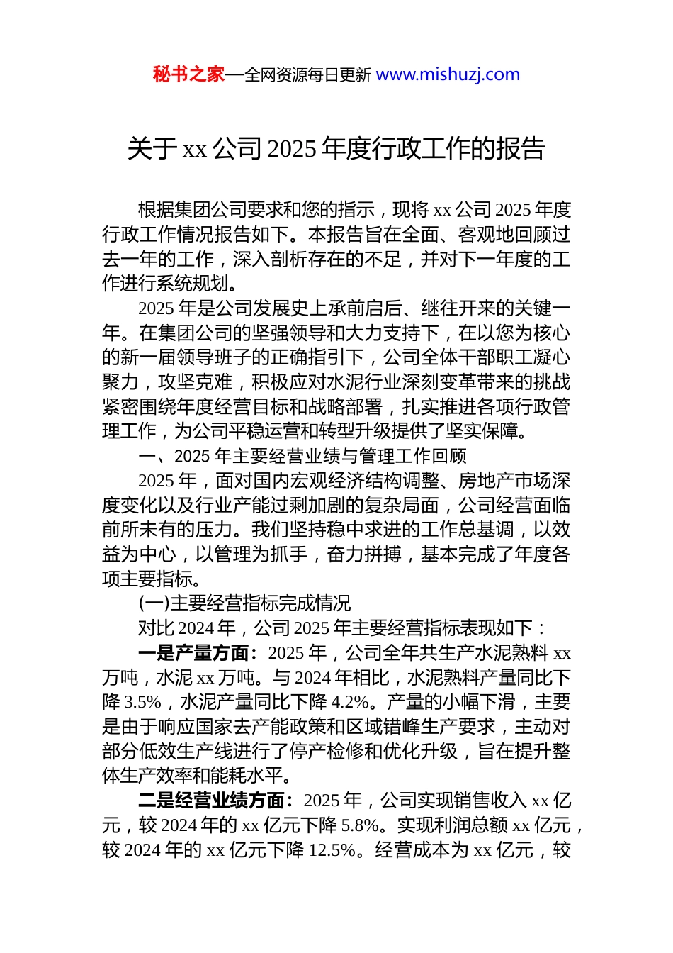 秘书之家—全网资源每日更新 www.mishuzj.com关于 xx 公司 2025 年度行政工作的报告根据集团公司要求和您的指示,现将 xx 公司 2025 年度行政工作情况报告如下。本报告旨在全面、客观地回顾过去一年的工作,深入剖析存在的不足,并对下一年度的工作进行系统规划。2025 年是公司发展史上承前启后、继往开来的关键一年。在集团公司的坚强领导和大力支持下,在以您为核心的新一届领导班子的正确指引下,公司全体干部职工凝心聚力,攻坚克难,积极应对水泥行业深刻变革带来的挑战紧密围绕年度经营目标和战略部署,扎实推进各项行政管理工作,为公司平稳运营和转型升级提供了坚实保障。一、2025 年主要经营业绩与管理工作回顾2025 年,面对国内宏观经济结构调整、房地产市场深度变化以及行业产能过剩加剧的复杂局面,公司经营面临前所未有的压力。我们坚持稳中求进的工作总基调,以效益为中心,以管理为抓手,奋力拼搏,基本完成了年度各项主要指标。(一)主要经营指标完成情况对比 2024 年,公司 2025 年主要经营指标表现如下:一是产量方面:2025 年,公司全年共生产水泥熟料 xx万吨,水泥 xx 万吨。与 2024 年相比,水泥熟料产量同比下降 3.5%,水泥产量同比下降 4.2%。产量的小幅下滑,主要是由于响应国家去产能政策和区域错峰生产要求,主动对部分低效生产线进行了停产检修和优化升级,旨在提升整体生产效率和能耗水平。二是经营业绩方面:2025 年,公司实现销售收入 xx 亿元,较 2024 年的 xx 亿元下降 5.8%。实现利润总额 xx 亿元,较 2024 年的 xx 亿元下降 12.5%。经营成本为 xx 亿元,较秘书之家—全网资源每日更新 www.mishuzj.com2024 年的 xx 亿元微降 2.1%。收入与利润的下滑,主要受区域市场需求疲软、水泥平均售价下行以及煤炭等主要原燃料价格持续高位运行的多重影响。面对不利局面,公司通过强化成本管控,努力对冲了部分市场下行压力。(二)年度重点行政管理工作围绕年度经营目标,行政管理体系聚焦“提质、增效、降本、强基”,全面提升服务保障能力和内部管理水平。一是以数字化转型为引擎,提升管理效能面对行业发展新趋势,公司将数字化转型作为提升核心竞争力的重要战略。2025 年,我们全面启动并推进了“智慧工厂”建设项目。首先,我们成功引入了新一代企业资源计划(erp)系统,打通了采购、生产、库存、销售、财务等核心业务环节的数据壁垒,实现了业务流程的线上化、自动化和透明化管理。通过该系统,管理层能够实时掌握经营动态,决策效率和准确性显著提升。其次,在生产端,我们完成了对 xx 号生产线的智能化改造试点。通过引入在线质量分析、能耗监测和设备预警维护系统,实现了生产过程的精准控制和无人值守。改造后,该产线的水泥熟料标准煤耗降低了 1.5kg/t,综合电耗降低了 2.0kwh/t,有效降低了生产成本。最后,在营销端,我们开发并上线了“xx 水泥”线上销售平台,实现了客户在线下单、订单跟踪、电子对账等功能,优化了客户体验,提升了销售环节的运营效率。二是以降本增效为核心,深化精细化管理成本控制是决定企业生存和发展的生命线。2025 年,我们深入开展了全员、全过程、全方位的降本增效活动。在采购管理方面,我们建立了大宗原材料集中采购与战略供应商合作机制。通过与 xx 矿业、xx 煤炭集团等主要供应商签订年度战略合作协议,有效锁定了采购价格,降低了采购成本约 3%。同时,利用大数据分析市场价格波动,秘书之家—全网资源每日更新 www.mishuzj.com优化采购时点,实现了精准采购。在生产运营方面,我们大力推广节能降耗技术。通过对窑磨系统进行技术改造、优化配料方案、推广使用替代燃料等措施,全年节约标准煤约 xx 万吨。此外,我们还加强了备品备件的全生命周期管理,通过修复利旧、国产化替代等方式,全年降低设备维护成本 xx 万元。在费用控制方面,我们严格执行年度预算管理,严控非生产性支出。通过优化办公流程、推行无纸化办公、精简会议活动等措施,公司管理费用率同比下降 0.5 个百分点。三是以安全环保为底线,筑牢发展根基我们始终将安全生产和环境...