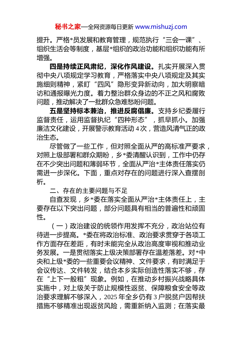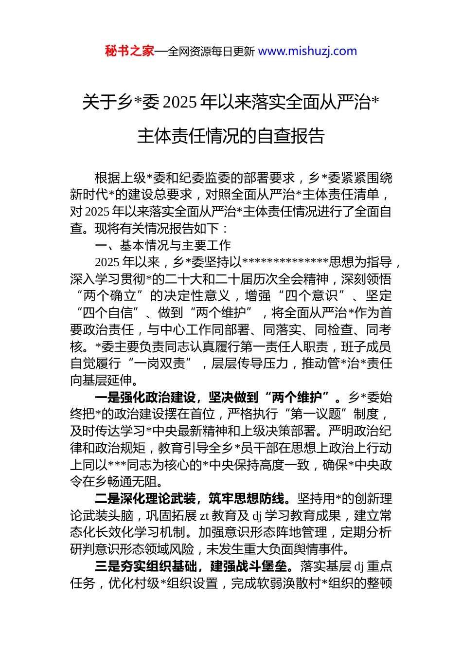 秘书之家—全网资源每日更新 www.mishuzj.com关于乡*委 2025 年以来落实全面从严治*主体责任情况的自查报告根据上级*委和纪委监委的部署要求,乡*委紧紧围绕新时代*的建设总要求,对照全面从严治*主体责任清单,对 2025 年以来落实全面从严治*主体责任情况进行了全面自查。现将有关情况报告如下:一、基本情况与主要工作2025 年以来,乡*委坚持以**************思想为指导,深入学习贯彻*的二十大和二十届历次全会精神,深刻领悟“两个确立”的决定性意义,增强“四个意识”、坚定“四个自信”、做到“两个维护”,将全面从严治*作为首要政治责任,与中心工作同部署、同落实、同检查、同考核。*委主要负责同志认真履行第一责任人职责,班子成员自觉履行“一岗双责”,层层传导压力,推动管*治*责任向基层延伸。一是强化政治建设,坚决做到“两个维护”。乡*委始终把*的政治建设摆在首位,严格执行“第一议题”制度,及时传达学习*中央最新精神和上级决策部署。严明政治纪律和政治规矩,教育引导全乡*员干部在思想上政治上行动上同以***同志为核心的*中央保持高度一致,确保*中央政令在乡畅通无阻。二是深化理论武装,筑牢思想防线。坚持用*的创新理论武装头脑,巩固拓展 zt 教育及 dj 学习教育成果,建立常态化长效化学习机制。加强意识形态阵地管理,定期分析研判意识形态领域风险,未发生重大负面舆情事件。三是夯实组织基础,建强战斗堡垒。落实基层 dj 重点任务,优化村级*组织设置,完成软弱涣散村*组织的整顿秘书之家—全网资源每日更新 www.mishuzj.com提升。严格*员发展和教育管理,规范执行“三会一课”、组织生活会等制度,基层*组织的政治功能和组织功能有所增强。四是持续正风肃纪,深化作风建设。扎实开展深入贯彻中央八项规定学习教育,严格落实中央八项规定及其实施细则精神,紧盯“四风”隐形变异新动向,加大明察暗访和通报曝光力度。着力整治群众身边的不正之风和腐败问题,推动解决了一批群众急难愁盼问题。五是坚持标本兼治,推进反腐倡廉。支持乡纪委履行监督责任,运用监督执纪“四种形态”,抓早抓小。加强廉洁文化建设,开展警示教育活动 4 次,营造风清气正的政治生态。尽管做了一些工作,但对照全面从严的高标准严要求,对照上级部署和群众期盼,乡*委清醒认识到,工作中仍存在不少突出问题和薄弱环节,全面从严治*主体责任落实仍需进一步深化。下面,重点对存在的问题进行深入查摆剖析。二、存在的主要问题与不足自查发现,乡*委在落实全面从严治*主体责任上,主要存在以下突出问题,部分问题具有相当的普遍性和顽固性。(一)政治建设的统领作用发挥不充分,政治站位有待进一步提高。*委在将政治标准、政治要求贯穿于各项工作方面存在差距,有时未能完全从政治高度审视和推动业务发展。一是贯彻落实上级决策部署存在温差落差。对*中央和上级*委的一些重要会议精神、文件要求,有时满足于会议传达、文件转发,结合本乡实际创造性落实不够,存在“上下一般粗”现象。例如,在推动乡村振兴战略具体实施中,对上级关于防止规模性返贫、保障粮食安全等政治要求理解不够深入,2025 年全乡仍有 3 户脱贫户因帮扶措施不够精准出现返贫风险,需重新纳入监测;在落实最秘书之家—全网资源每日更新 www.mishuzj.com严格的耕地保护制度方面,虽然进行了部署,但日常监管不到位,年内仍发生占用耕地建设养殖设施的问题,虽然后期予以拆除复垦,但造成了不良影响和资源浪费。这反映出*委在推动工作时,政治判断力、政治领悟力、政治执行力仍需加强。二是*内政治生活不够严肃规范。*委班子民主生活会的“辣味”不足,批评与自我批评有时流于形式,讲工作业绩多、谈思想根源少,未能真正达到“红脸出汗、排毒治病”的效果。部分班子成员在参加所在支部组织生活时,以领导身份指导工作多,以普通*员身份进行思想汇报少。2025 年度民主生活会征求到的意见建议中,涉及具体工作事务的多,触及深层思想作风的少。三是意识形态工作责任制落实不到位。*委对意识形态领域的复杂性认识不足,对网络舆情、**管理等重点领域的风险排查不够细致。2025 年,辖...