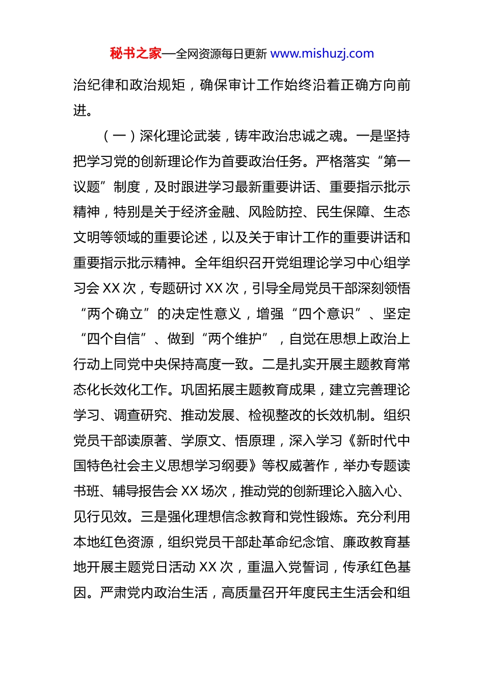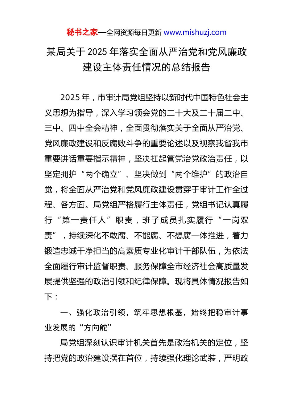 秘书之家—全网资源每日更新 www.mishuzj.com某局关于 2025 年落实全面从严治党和党风廉政建设主体责任情况的总结报告 2025 年,市审计局党组坚持以新时代中国特色社会主义思想为指导,深入学习领会党的二十大及二十届二中、三中、四中全会精神,全面贯彻落实关于全面从严治党、党风廉政建设和反腐败斗争的重要论述以及视察我省我市重要讲话重要指示精神,坚决扛起管党治党政治责任,以坚定拥护“两个确立”、坚决做到“两个维护”的政治自觉,将全面从严治党和党风廉政建设贯穿于审计工作全过程、各方面。局党组严格履行主体责任,党组书记认真履行“第一责任人”职责,班子成员扎实履行“一岗双责”,持续深化不敢腐、不能腐、不想腐一体推进,着力锻造忠诚干净担当的高素质专业化审计干部队伍,为依法全面履行审计监督职责、服务保障全市经济社会高质量发展提供坚强的政治引领和纪律保障。现将具体情况报告如下:一、强化政治引领,筑牢思想根基,始终把稳审计事业发展的“方向舵”局党组深刻认识审计机关首先是政治机关的定位,坚持把党的政治建设摆在首位,持续强化理论武装,严明政秘书之家—全网资源每日更新 www.mishuzj.com治纪律和政治规矩,确保审计工作始终沿着正确方向前进。(一)深化理论武装,铸牢政治忠诚之魂。一是坚持把学习党的创新理论作为首要政治任务。严格落实“第一议题”制度,及时跟进学习最新重要讲话、重要指示批示精神,特别是关于经济金融、风险防控、民生保障、生态文明等领域的重要论述,以及关于审计工作的重要讲话和重要指示批示精神。全年组织召开党组理论学习中心组学习会 XX 次,专题研讨 XX 次,引导全局党员干部深刻领悟“两个确立”的决定性意义,增强“四个意识”、坚定“四个自信”、做到“两个维护”,自觉在思想上政治上行动上同党中央保持高度一致。二是扎实开展主题教育常态化长效化工作。巩固拓展主题教育成果,建立完善理论学习、调查研究、推动发展、检视整改的长效机制。组织党员干部读原著、学原文、悟原理,深入学习《新时代中国特色社会主义思想学习纲要》等权威著作,举办专题读书班、辅导报告会 XX 场次,推动党的创新理论入脑入心、见行见效。三是强化理想信念教育和党性锻炼。充分利用本地红色资源,组织党员干部赴革命纪念馆、廉政教育基地开展主题党日活动 XX 次,重温入党誓词,传承红色基因。严肃党内政治生活,高质量召开年度民主生活会和组秘书之家—全网资源每日更新 www.mishuzj.com织生活会,认真开展批评和自我批评,切实增强了党内政治生活的政治性、时代性、原则性、战斗性。(二)严明政治纪律,守牢政治安全底线。一是始终把讲政治摆在首位。教育引导审计干部时刻绷紧政治纪律和政治规矩这根弦,在大是大非面前旗帜鲜明,在风浪考验面前无所畏惧,坚决反对“七个有之”,切实做到“五个必须”。二是确保中央政令畅通。紧紧围绕党中央重大决策部署及省委、市委工作要求谋划和开展审计工作,将推动重大政策落实、促进经济高质量发展、防范化解重大风险、促进权力规范运行等作为审计重点。全年组织实施的政策跟踪审计项目,均把检查政策措施执行的政治效果、社会效果、经济效果放在突出位置,确保党中央令行禁止。三是坚决维护意识形态安全。严格落实意识形态工作责任制,党组定期分析研判意识形态领域风险,加强对局门户网站、微信公众号、工作微信群等意识形态阵地的建设和管理。组织党员干部深入学习关于意识形态工作的重要论述,增强政治敏锐性和政治鉴别力,坚决抵制各种错误思潮和言论,确保审计领域意识形态安全。(三)扛牢政治责任,确保决策部署落地生根。一是坚决贯彻落实党中央决策部署。局党组对党中央关于全面从严治党、党风廉政建设的各项部署要求,第一时间传达秘书之家—全网资源每日更新 www.mishuzj.com学习,研究制定贯彻落实的具体措施。坚持党对审计工作的集中统一领导,严格执行重大事项请示报告制度,全年向市委审计委员会、市委、市政府请示报告重大事项 XX件。二是服务保障全市发展大局。自觉将审计工作融入全市中心工作,聚焦“三新一高”发展要求,围绕深化改...