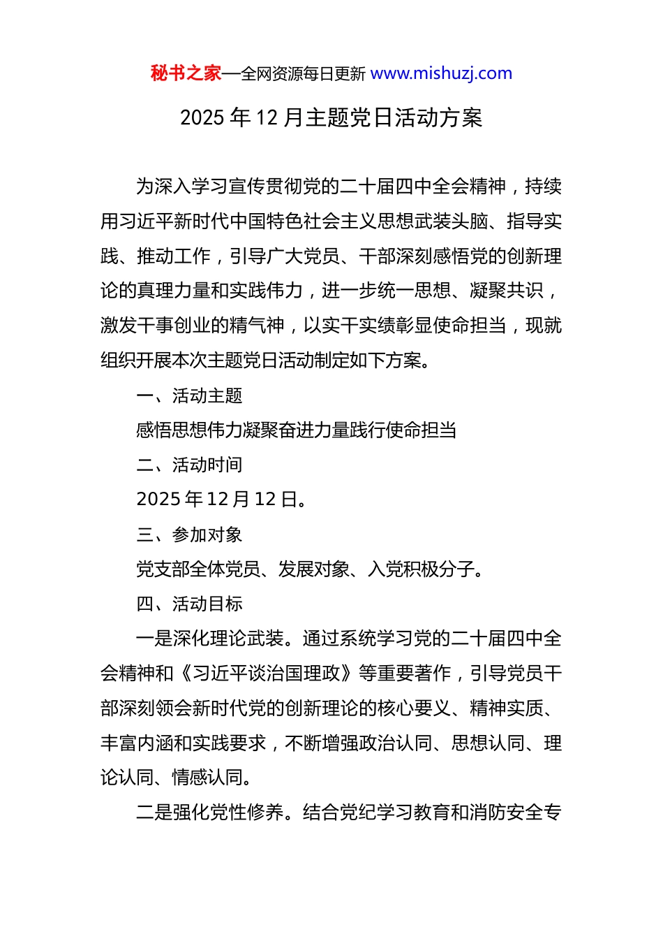 秘书之家—全网资源每日更新 www.mishuzj.com2025 年 12 月主题党日活动方案 为深入学习宣传贯彻党的二十届四中全会精神,持续用习近平新时代中国特色社会主义思想武装头脑、指导实践、推动工作,引导广大党员、干部深刻感悟党的创新理论的真理力量和实践伟力,进一步统一思想、凝聚共识,激发干事创业的精气神,以实干实绩彰显使命担当,现就组织开展本次主题党日活动制定如下方案。一、活动主题感悟思想伟力凝聚奋进力量践行使命担当二、活动时间2025 年 12 月 12 日。三、参加对象党支部全体党员、发展对象、入党积极分子。四、活动目标一是深化理论武装。通过系统学习党的二十届四中全会精神和《习近平谈治国理政》等重要著作,引导党员干部深刻领会新时代党的创新理论的核心要义、精神实质、丰富内涵和实践要求,不断增强政治认同、思想认同、理论认同、情感认同。二是强化党性修养。结合党纪学习教育和消防安全专秘书之家—全网资源每日更新 www.mishuzj.com题学习,引导党员干部筑牢信仰之基、补足精神之钙、把稳思想之舵,严守政治纪律和政治规矩,强化安全发展理念,提升风险防范意识。三是推动学用结合。坚持理论联系实际,将学习成果转化为推动工作的强大动力,引导党员干部立足岗位,在服务发展大局、保障安全稳定、解决群众急难愁盼问题中当先锋、作表率,以实干争先的实际行动践行初心使命。五、活动内容本次主题党日活动要紧扣主题,创新形式,务实高效,重点围绕“一课一片一实践”展开,确保内容充实、效果实在。(一)讲好“一课”,强化理论灌输一是聚焦核心内容讲党课。以深入学习党的二十届四中全会精神和《习近平谈治国理政》第五卷为重点,将第一卷至第四卷作为一个有机整体贯通学习。党支部书记要带头讲授专题党课,重点阐释全会提出的新思想、新论断、新要求,以及习近平新时代中国特色社会主义思想的最新发展。鼓励普通党员特别是年轻干部、业务骨干结合岗位实际,围绕特定专题讲授“微党课”,分享学习心得和工作感悟。二是丰富党课讲授形式。可利用学校思政半月谈、秘书之家—全网资源每日更新 www.mishuzj.com“三会一课”等现有平台,采取研讨式、案例式、互动式等多种方法,增强党课的吸引力和感染力。党课内容要紧密结合本单位、本领域工作实际,特别是要联系 2025 年政府工作报告中涉及的相关部署要求,引导党员干部思考如何将理论学习成果转化为推动 XX 高质量发展的具体思路和举措。(二)观好“一片”,深化思想认识一是精选观看内容。组织观看《总书记擘画中国式现代化新篇章》等重磅微视频,深刻领会中央宏阔的战略布局。观看《奋进的中国·我们的“十四五”》系列纪录片,直观感受国家发展成就和未来蓝图,增强自豪感与使命感。二是组织交流研讨。观影后,要组织党员进行讨论,结合所见所感,围绕如何在中国式现代化建设中找准定位、贡献力量,如何立足岗位贯彻落实好党中央的决策部署等话题畅谈体会,深化理解,凝聚共识。(三)抓好“一实践”,推动知行合一一是开展“安全先锋”主题实践。结合第 34 个“全国消防日”和“消防宣传月”活动,组织党员认真学习领会习近平总书记关于安全生产、消防安全的重要论述和指示批示精神。可邀请专家开展消防安全知识讲座,组织观看秘书之家—全网资源每日更新 www.mishuzj.com火灾警示案例教育片,结合实际开展消防应急疏散演练等活动,切实提升党员干部的消防安全意识和应急处置能力,引导党员在安全生产领域争当先锋。二是开展“服务大局”主题实践。紧密结合单位中心工作和年度重点任务,围绕党员发展、就业创业、乡村振兴、我为群众办实事、师德师风建设等主题,积极组织开展支部联点共建、志愿服务、岗位建功等活动。引导党员深入基层、深入群众,在服务社会、服务师生的具体实践中提升能力素质,展现担当作为。例如,可组织党员参与XX 相关活动,助力解决实际困难。三是开展“师德反思”主题实践。结合单位实际,组织党员对照《XX 单位师德失范行为负面清单》等规章制度,开展师德师风问题风险排查和反思活动。通过个人自查、党员互评等方式,引导教师党员深刻检视自身...