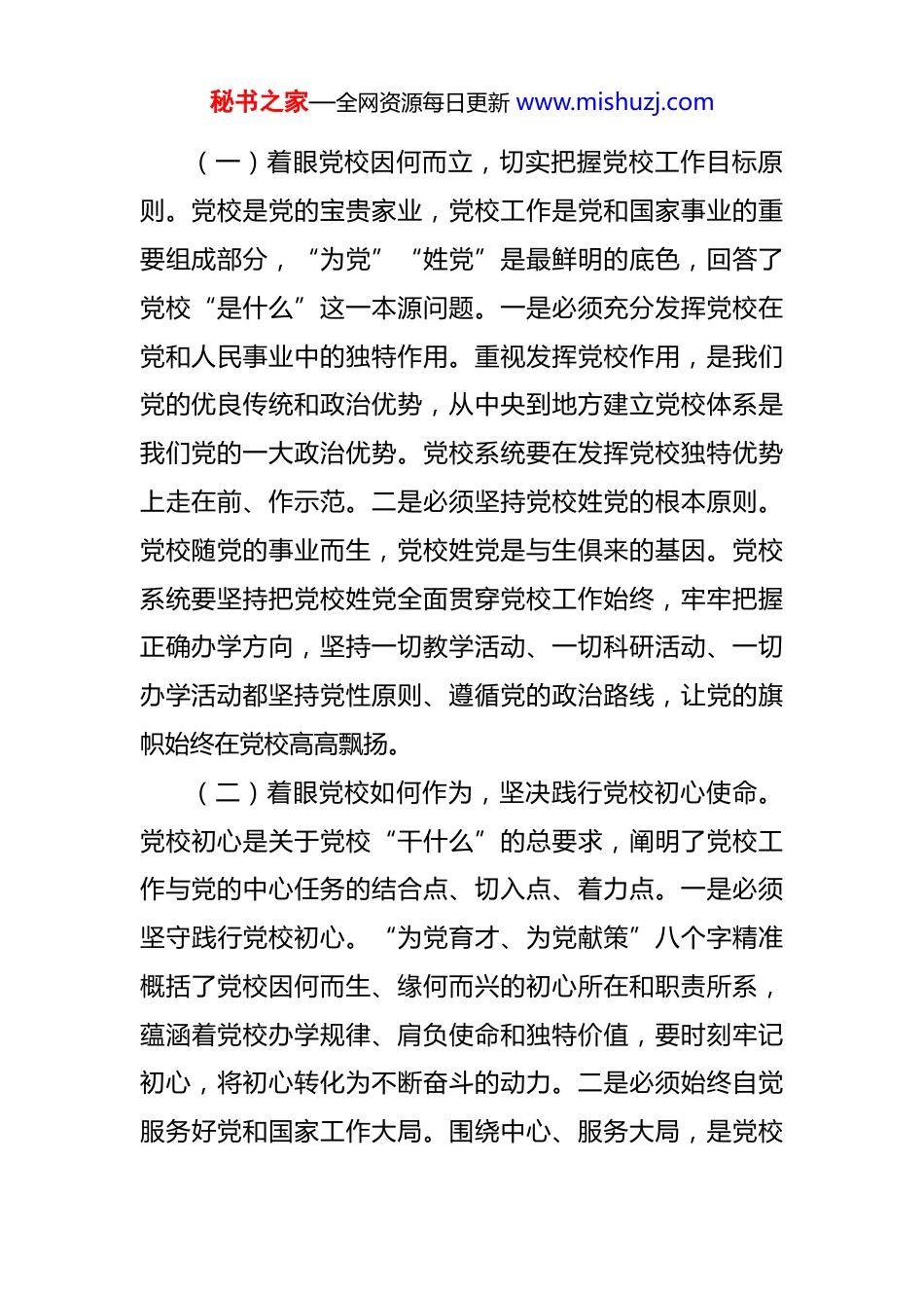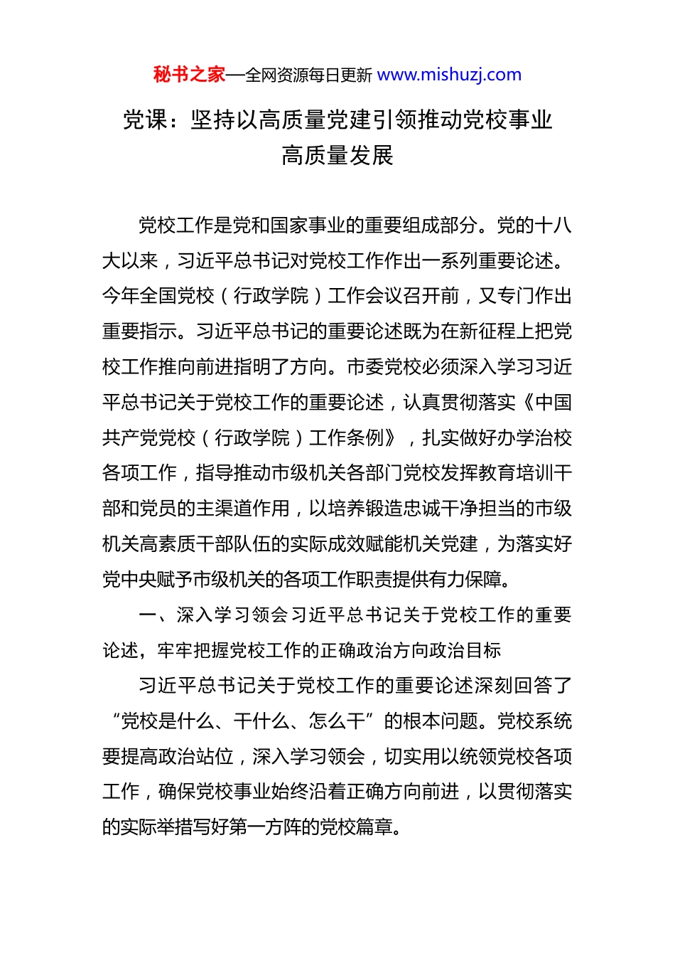秘书之家—全网资源每日更新 www.mishuzj.com党课:坚持以高质量党建引领推动党校事业高质量发展 党校工作是党和国家事业的重要组成部分。党的十八大以来,习近平总书记对党校工作作出一系列重要论述。今年全国党校(行政学院)工作会议召开前,又专门作出重要指示。习近平总书记的重要论述既为在新征程上把党校工作推向前进指明了方向。市委党校必须深入学习习近平总书记关于党校工作的重要论述,认真贯彻落实《中国共产党党校(行政学院)工作条例》,扎实做好办学治校各项工作,指导推动市级机关各部门党校发挥教育培训干部和党员的主渠道作用,以培养锻造忠诚干净担当的市级机关高素质干部队伍的实际成效赋能机关党建,为落实好党中央赋予市级机关的各项工作职责提供有力保障。一、深入学习领会习近平总书记关于党校工作的重要论述,牢牢把握党校工作的正确政治方向政治目标习近平总书记关于党校工作的重要论述深刻回答了“党校是什么、干什么、怎么干”的根本问题。党校系统要提高政治站位,深入学习领会,切实用以统领党校各项工作,确保党校事业始终沿着正确方向前进,以贯彻落实的实际举措写好第一方阵的党校篇章。秘书之家—全网资源每日更新 www.mishuzj.com(一)着眼党校因何而立,切实把握党校工作目标原则。党校是党的宝贵家业,党校工作是党和国家事业的重要组成部分,“为党”“姓党”是最鲜明的底色,回答了党校“是什么”这一本源问题。一是必须充分发挥党校在党和人民事业中的独特作用。重视发挥党校作用,是我们党的优良传统和政治优势,从中央到地方建立党校体系是我们党的一大政治优势。党校系统要在发挥党校独特优势上走在前、作示范。二是必须坚持党校姓党的根本原则。党校随党的事业而生,党校姓党是与生俱来的基因。党校系统要坚持把党校姓党全面贯穿党校工作始终,牢牢把握正确办学方向,坚持一切教学活动、一切科研活动、一切办学活动都坚持党性原则、遵循党的政治路线,让党的旗帜始终在党校高高飘扬。(二)着眼党校如何作为,坚决践行党校初心使命。党校初心是关于党校“干什么”的总要求,阐明了党校工作与党的中心任务的结合点、切入点、着力点。一是必须坚守践行党校初心。“为党育才、为党献策”八个字精准概括了党校因何而生、缘何而兴的初心所在和职责所系,蕴涵着党校办学规律、肩负使命和独特价值,要时刻牢记初心,将初心转化为不断奋斗的动力。二是必须始终自觉服务好党和国家工作大局。围绕中心、服务大局,是党校秘书之家—全网资源每日更新 www.mishuzj.com事业必须始终坚持的政治站位。党校系统要更加自觉地找准党校工作与党的中心任务的结合点、切入点、着力点,为推进党和国家事业发展献计出力、担当尽责。三是必须在培养造就堪当民族复兴重任的执政骨干队伍上积极作为。市级机关是推动党中央治国理政、管党治党决策部署贯彻落实的重要环节。党校系统必须在办好让党放心、让干部成才、为大局服务的党校教育方面下更大功夫,努力培养造就政治过硬、适应新时代要求、具备领导现代化建设能力的市级机关高素质干部队伍。四是必须努力当好党的思想理论建设的生力军。党校是党的思想理论战线的重要方面军,承担着为党献策的重要职责。党校系统要在党的创新理论研究阐释、推进党的理论创新和建言献策等方面积极探索,做好理论研究、对策研究这个探索规律、经世致用的大学问。(三)着眼党校事业兴旺,着力提升党校工作质效。实现党校事业高质量发展,需要进一步强基固本、守正创新、练好内功、发挥优势,推进党校各项工作提质增效。一是必须坚持党对党校工作的全面领导。党的领导确保党校办学方向,激发党校办学活力,凝聚党校发展合力。市级机关各部门党组(党委)要认真落实办党校、管党校、建党校的主体责任,加强对本系统党校工作的谋划部署,秘书之家—全网资源每日更新 www.mishuzj.com用情用力耕耘好党校事业这份“责任田”。二是必须始终坚持从严治校、质量立校。党校系统教育培训面向市级机关广大党员干部,要在从严治校、质量立校上有更高标准和要求。三是必须大力实施人才强校战略。办好党校,需要一支高素质的办学队伍作...