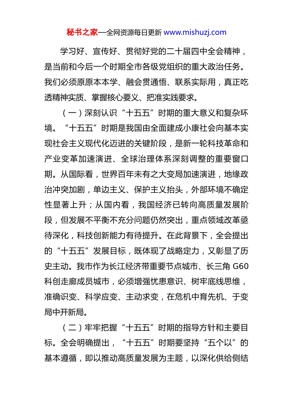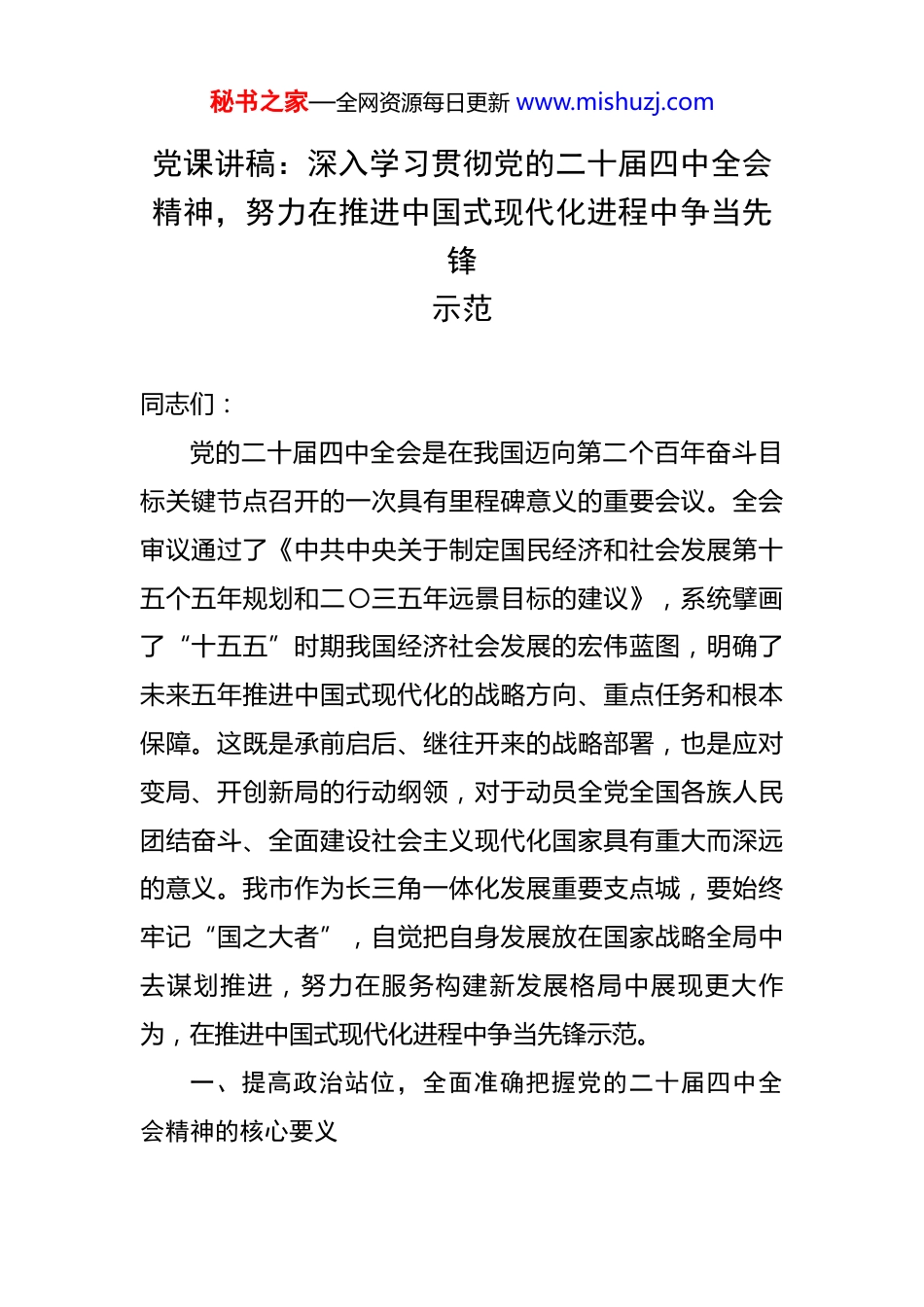 秘书之家—全网资源每日更新 www.mishuzj.com党课讲稿:深入学习贯彻党的二十届四中全会精神,努力在推进中国式现代化进程中争当先锋示范 同志们:党的二十届四中全会是在我国迈向第二个百年奋斗目标关键节点召开的一次具有里程碑意义的重要会议。全会审议通过了《中共中央关于制定国民经济和社会发展第十五个五年规划和二〇三五年远景目标的建议》,系统擘画了“十五五”时期我国经济社会发展的宏伟蓝图,明确了未来五年推进中国式现代化的战略方向、重点任务和根本保障。这既是承前启后、继往开来的战略部署,也是应对变局、开创新局的行动纲领,对于动员全党全国各族人民团结奋斗、全面建设社会主义现代化国家具有重大而深远的意义。我市作为长三角一体化发展重要支点城,要始终牢记“国之大者”,自觉把自身发展放在国家战略全局中去谋划推进,努力在服务构建新发展格局中展现更大作为,在推进中国式现代化进程中争当先锋示范。一、提高政治站位,全面准确把握党的二十届四中全会精神的核心要义秘书之家—全网资源每日更新 www.mishuzj.com学习好、宣传好、贯彻好党的二十届四中全会精神,是当前和今后一个时期全市各级党组织的重大政治任务。我们必须原原本本学、融会贯通悟、联系实际用,真正吃透精神实质、掌握核心要义、把准实践要求。(一)深刻认识“十五五”时期的重大意义和复杂环境。“十五五”时期是我国由全面建成小康社会向基本实现社会主义现代化迈进的关键阶段,是新一轮科技革命和产业变革加速演进、全球治理体系深刻调整的重要窗口期。从国际看,世界百年未有之大变局加速演进,地缘政治冲突加剧,单边主义、保护主义抬头,外部环境不确定性显著上升;从国内看,我国经济已转向高质量发展阶段,但发展不平衡不充分问题仍然突出,重点领域改革亟待深化,科技创新能力有待提升。在此背景下,全会提出的“十五五”发展目标,既体现了战略定力,又彰显了历史主动。我市作为长江经济带重要节点城市、长三角 G60科创走廊成员城市,必须增强忧患意识、树牢底线思维,准确识变、科学应变、主动求变,在危机中育先机、于变局中开新局。(二)牢牢把握“十五五”时期的指导方针和主要目标。全会明确提出,“十五五”时期要坚持“五个以”的基本遵循,即以推动高质量发展为主题,以深化供给侧结秘书之家—全网资源每日更新 www.mishuzj.com构性改革为主线,以改革创新为根本动力,以满足人民日益增长的美好生活需要为根本目的,以统筹发展和安全为基本保障;提出“两个推动”即推动质量变革、效率变革、动力变革;强调“一个确保”即确保经济持续健康发展和社会大局稳定。同时,坚持“六个坚持”重要原则。坚持党的全面领导、坚持以人民为中心、坚持新发展理念、坚持深化改革开放、坚持系统观念、坚持发扬斗争精神。这些方针原则为我们指明了前进方向。我市要在对标对表中找准定位,在服务大局中体现担当,力争到 2030年,地区生产总值突破 8000 亿元,人均 GDP 达到全国平均水平以上,常住人口城镇化率超过 75%,高新技术产业增加值占规上工业比重达 60%以上,生态环境质量持续改善,社会治理体系更加完善,人民群众获得感、幸福感、安全感显著增强。(三)精准聚焦“十五五”时期的战略任务和重大举措。全会围绕构建高水平社会主义市场经济体制、建设现代化产业体系、全面推进乡村振兴、促进区域协调发展、推进绿色低碳转型、提升国家安全能力等作出系统部署。特别是将“加快发展新质生产力”摆在突出位置,强调要以科技创新引领产业创新,推动传统产业高端化、智能化、绿色化升级,培育壮大新兴产业和未来产业。这对我秘书之家—全网资源每日更新 www.mishuzj.com市而言既是重大机遇,更是使命责任。我们要立足制造业基础雄厚、科教资源集聚、区位交通优越等优势,主动承接国家战略布局,积极融入长三角一体化发展,在集成电路、人工智能、新能源汽车、低空经济、生物医药等领域加快布局,打造具有全国影响力的先进制造业基地和科技创新策源地。(四)始终坚持“十五五”时期发展的根本保证。党的领导是中国特色社会主义最本质的特征,是中国式现代化行稳...