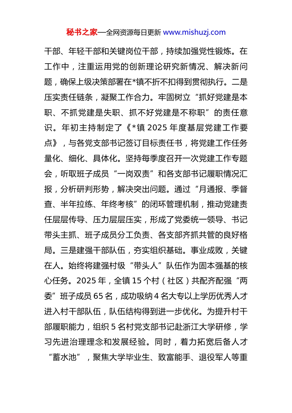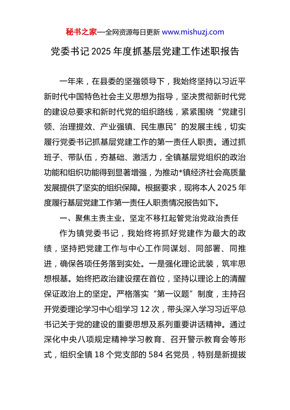 秘书之家—全网资源每日更新 www.mishuzj.com党委书记 2025 年度抓基层党建工作述职报告 一年来,在县委的坚强领导下,我始终坚持以习近平新时代中国特色社会主义思想为指导,坚决贯彻新时代党的建设总要求和新时代党的组织路线,紧紧围绕“党建引领、治理提效、产业强镇、民生惠民”的发展主线,切实履行党委书记抓基层党建工作的第一责任人职责。通过抓班子、带队伍,夯基础、激活力,全镇基层党组织的政治功能和组织功能得到显著增强,为推动*镇经济社会高质量发展提供了坚实的组织保障。根据要求,现将本人 2025 年度履行基层党建工作第一责任人职责情况报告如下。一、聚焦主责主业,坚定不移扛起管党治党政治责任作为镇党委书记,我始终将抓好党建作为最大的政绩,坚持把党建工作与中心工作同谋划、同部署、同推进,确保各项任务落到实处。一是强化理论武装,筑牢思想根基。始终把政治建设摆在首位,坚持以理论上的清醒保证政治上的坚定。严格落实“第一议题”制度,主持召开党委理论学习中心组学习 12 次,带头深入学习习近平总书记关于党的建设的重要思想及系列重要讲话精神。通过深化中央八项规定精神学习教育、召开警示教育会等形式,组织全镇 18 个党支部的 584 名党员,特别是新提拔秘书之家—全网资源每日更新 www.mishuzj.com干部、年轻干部和关键岗位干部,持续加强党性锻炼。在工作中,注重运用党的创新理论研究新情况、解决新问题,确保上级决策部署在*镇不折不扣得到贯彻执行。二是压实责任链条,凝聚工作合力。牢固树立“抓好党建是本职、不抓党建是失职、抓不好党建是不称职”的责任意识。年初主持制定了《*镇 2025 年度基层党建工作要点》,与各党支部书记签订目标责任书,将党建工作任务量化、细化、具体化。坚持每季度召开一次党建工作专题会,听取班子成员“一岗双责”和各支部书记履职情况汇报,分析研判形势,解决突出问题。通过“月通报、季督查、半年拉练、年终考核”的闭环管理机制,推动党建责任层层传导、压力层层压实,形成了党委统一领导、书记带头主抓、班子成员分工负责、各支部齐抓共管的良好格局。三是建强干部队伍,夯实组织基础。事业成败,关键在人。始终将建强村级“带头人”队伍作为固本强基的核心任务。2025 年,全镇 15 个村(社区)共配齐配强“两委”班子成员 65 名,成功吸纳 4 名大专以上学历优秀人才进入村干部队伍,队伍结构得到进一步优化。为提升村干部履职能力,组织 5 名村党支部书记赴浙江大学研修,学习先进治理理念和发展经验。同时,着力拓宽后备人才“蓄水池”,聚焦大学毕业生、致富能手、退役军人等重秘书之家—全网资源每日更新 www.mishuzj.com点群体,建立 41 人的村级后备力量信息台账,为乡村振兴储备了有生力量。二、聚焦中心任务,以高质量党建引领高质量发展坚持围绕中心、服务大局,将党建工作的成效体现在推动全镇经济社会发展的实践中,实现党建与业务深度融合、同频共振。一是党建引领产业兴旺,激活发展内生动力。产业是乡村振兴的基石。我们以党支部为引领,精准施策,大力发展特色优势产业。以*坝区“粮油轮作”为基础,由党支部牵头组织,流转土地、对接市场,全镇发展“高粱+油菜”种植面积达 5000 亩。经测算,2025 年上半年油菜产量超 150 万斤,下半年高粱产量达 260 万斤,有效解决群众就业 4300 余人次,带动群众增收超过 50 万元。同时,立足本镇实际,推动家庭农场发展,实现肉牛存栏 8000 头以上。通过党组织领办合作社等模式,高质量管护现有茶园 1.5 万亩,并成功提质改造了 900 亩高标准抹茶示范基地,显著提升了产业附加值。二是党建引领基层治理,共建和美善治乡村。治理有效是乡村振兴的重要保障。我们坚持党建引领网格化治理,提升乡村治理现代化水平。投入 15 万元升级集镇视频监控系统,并以党支部为单位,组建 15 支村级党员巡逻队常态化开展巡查,将矛盾风险化解在萌芽状态。为深化精神文明建设,依托新时秘书之家—全网资源每日更新 www.mishuzj.com代文明实践站,组建了 18 支共计 600 余人的党员志愿服务队,常态化开...