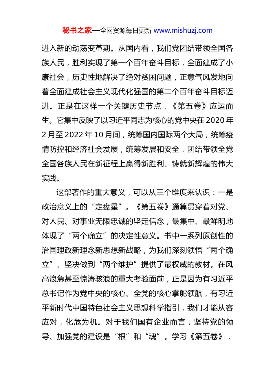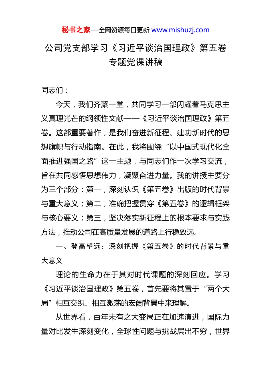 秘书之家—全网资源每日更新 www.mishuzj.com公司党支部学习《习近平谈治国理政》第五卷专题党课讲稿 同志们:今天,我们齐聚一堂,共同学习一部闪耀着马克思主义真理光芒的纲领性文献——《习近平谈治国理政》第五卷。这部重要著作,是我们奋进新征程、建功新时代的思想旗帜与行动指南。在此,我将围绕“以中国式现代化全面推进强国之路”这一主题,与同志们作一次学习交流,旨在共同感悟思想伟力,凝聚奋进力量。我的讲授主要分为三个部分:第一,深刻认识《第五卷》出版的时代背景与重大意义;第二,准确把握贯穿《第五卷》的逻辑框架与核心要义;第三,坚决落实新征程上的根本要求与实践方法,推动公司在高质量发展的道路上行稳致远。一、登高望远:深刻把握《第五卷》的时代背景与重大意义理论的生命力在于其对时代课题的深刻回应。学习《习近平谈治国理政》第五卷,首先要将其置于“两个大局”相互交织、相互激荡的宏阔背景中来理解。从世界看,百年未有之大变局正在加速演进,国际力量对比发生深刻变化,全球性问题与挑战层出不穷,世界秘书之家—全网资源每日更新 www.mishuzj.com进入新的动荡变革期。从国内看,我们党团结带领全国各族人民,胜利实现了第一个百年奋斗目标,全面建成了小康社会,历史性地解决了绝对贫困问题,正意气风发地向着全面建成社会主义现代化强国的第二个百年奋斗目标迈进。正是在这样一个关键历史节点,《第五卷》应运而生。它集中反映了以习近平同志为核心的党中央在 2020 年2 月至 2022 年 10 月间,统筹国内国际两个大局,统筹疫情防控和经济社会发展,统筹发展和安全,团结带领全党全国各族人民在新征程上赢得新胜利、铸就新辉煌的伟大实践。这部著作的重大意义,可以从三个维度来认识:一是政治意义上的“定盘星”。《第五卷》通篇贯穿着对党、对人民、对事业无限忠诚的坚定信念,最集中、最鲜明地体现了“两个确立”的决定性意义。书中一系列原创性的治国理政新理念新思想新战略,为我们深刻领悟“两个确立”、坚决做到“两个维护”提供了最权威的教材。在风高浪急甚至惊涛骇浪的重大考验面前,正是因为有习近平总书记作为党中央的核心、全党的核心掌舵领航,有习近平新时代中国特色社会主义思想科学指引,我们才能从容应对,化危为机。对于我们国有企业而言,坚持党的领导、加强党的建设是“根”和“魂”。学习《第五卷》,秘书之家—全网资源每日更新 www.mishuzj.com就是要不断铸牢政治忠诚之魂,确保企业发展的“方向盘”始终掌握在党和人民手中,确保*公司这艘航船始终沿着正确的政治方向破浪前行。二是思想意义上的“领航标”。《第五卷》与前四卷一脉相承又与时俱进,是系统反映习近平新时代中国特色社会主义思想的最新权威著作。它生动记录了马克思主义中国化时代化的最新成果,深刻阐明了中国之路、中国之治、中国之理。特别是,书中鲜明提出了“以中国式现代化全面推进中华民族伟大复兴”这一中心任务,系统阐述了中国式现代化的理论体系,使其更加清晰、更加科学、更加可感。这标志着我们党对现代化建设规律的认识达到了新高度。学习《第五卷》,就是要掌握蕴含其中的世界观和方法论,用党的创新理论武装头脑、指导实践,在新时代新征程上更加自觉地用新思想引领*公司实现更高质量的发展。三是实践意义上的“动力源”。理论的价值在于指导实践。书中关于“高质量发展是全面建设社会主义现代化国家的首要任务”“统筹发展和安全”“全面从严治党”等一系列重大论断,都具有极强的现实针对性和指导性。这些论述不是空洞的理论说教,而是源于实践、指导实践的真知灼见。它们为我们应对复杂局面、破解发展难题、激发创新活力提供了“金钥匙”。*公司作为城市建设和运营的重要力秘书之家—全网资源每日更新 www.mishuzj.com量,承担着“让城市更有靓度”的光荣使命。如何在新一轮市场化竞争中勇立潮头?如何破解发展中的痛点和技术上的难点?如何守住安全生产和廉洁从业的底线?答案就在这部著作之中。学习《第五卷》,就是要将其转化为推动*公司改革发展和党的建设各项工作的强大动力和生动实践。二、纲举目张:系统领...
