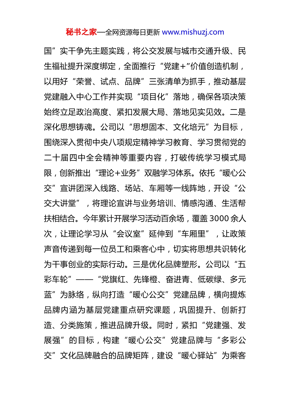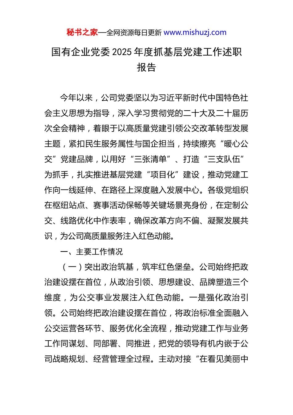 秘书之家—全网资源每日更新 www.mishuzj.com国有企业党委 2025 年度抓基层党建工作述职报告 今年以来,公司党委坚以为习近平新时代中国特色社会主义思想为指导,深入学习贯彻党的二十大及二十届历次全会精神,着眼于以高质量党建引领公交改革转型发展主题,紧扣民生服务属性与国企担当,持续擦亮“暖心公交”党建品牌,以用好“三张清单”、打造“三支队伍”为抓手,扎实推进基层党建“项目化”建设,推动党建工作向一线延伸、在路径上深度融入发展中心。各级党组织在枢纽站点、赛事活动保畅等关键场景亮身份,在定制公交、线路优化中作表率,确保改革方向不偏、凝聚发展共识,为公司高质量服务注入红色动能。一、主要工作情况(一)突出政治筑基,筑牢红色堡垒。公司始终把政治建设摆在首位,从政治引领、思想建设、品牌塑造三个维度,为公交事业发展注入红色动能。一是强化政治引领。公司始终把政治建设摆在首位,将政治标准全面融入公交运营各环节、服务优化全流程,推动党建工作与业务工作同谋划、同部署、同推进,把党的领导有机内嵌于公司战略规划、经营管理全过程。主动对接“在看见美丽中秘书之家—全网资源每日更新 www.mishuzj.com国”实干争先主题实践,将公交发展与城市交通升级、民生福祉提升深度绑定,全面推行“党建+”价值创造机制,以用好“荣誉、试点、品牌”三张清单为抓手,推动基层党建融入中心工作并实现“项目化”落地,确保各项决策始终立足政治高度、紧扣发展大局、落地见实见效。二是深化思想铸魂。公司以“思想固本、文化培元”为目标,围绕深入贯彻中央八项规定精神学习教育、学习贯彻党的二十届四中全会精神等重要内容,打破传统学习模式局限,创新推出“理论+业务”双融学习体系。依托“暖心公交”宣讲团深入线路、场站、车厢等一线阵地,开设“公交大讲堂”,将理论宣讲与业务培训、情感沟通、生活帮扶相结合。今年累计开展学习活动百余场,覆盖 3000 余人次,让理论学习从“会议室”延伸到“车厢里”,让政策声音传递到每一位员工和乘客心中,切实将思想共识转化为干事创业的实际行动。三是优化品牌塑形。公司以“五彩车轮”——“党旗红、先锋橙、奋进青、低碳绿、多元蓝”为脉络,纵向打造“暖心公交”党建品牌,横向提炼品牌内涵为基层党建重点研究课题,巩固提升、创新打造、分类施策,推进品牌升级。同时,紧扣“党建强、发展强”的目标,构建“暖心公交”党建品牌与“多彩公交”文化品牌融合的品牌矩阵,建设“暖心驿站”为乘客秘书之家—全网资源每日更新 www.mishuzj.com与一线员工提供便利,推出 6 路“玫瑰红”公交、党员先锋线等 10 余条特色线路,让党建品牌从“抽象概念”变为群众可感可知的“服务产品”。(二)突出服务惠民,织密幸福网络。公司坚持以民生导向织密幸福网络,始终将“人民满意”作为服务的出发点和落脚点,通过数字赋能、标准升级、联建共建,让公交车辆成为传递民生温度的“移动窗口”。一是破解民生难题。公司以线网优化为契机,推动公交服务向“智能化、便捷化”转型。近年来,创新性投放 15 辆“新青年数字出行”公交车,打造首个“动态响应式公交”服务模式——通过智能调度系统实时匹配乘客需求与车辆资源,实现乘客“3 分钟内步行至站点”的便捷体验,大幅缩短候车时间。同时,依托“我为群众办实事”实践活动,开通“民情连线”服务热线,组建专项团队主动走访 50 余户群众,累计解决出行疑难问题 260 余起,用“数字化+人性化”的服务组合,回应群众出行诉求。二是擦亮民生底色。公司将群众出行感受作为服务标尺,创新推出“三心四点”美丽服务法,以“热心招呼、耐心等候、细心观察”践行服务初心,以“靠站近一点、起步缓一点、速度慢一点、刹车轻一点”优化乘车体验。为确保服务标准落地,升级《文明服务标准化建设手册》,建立“重点驾驶秘书之家—全网资源每日更新 www.mishuzj.com员”动态监管机制,通过定期考核、针对性培训,持续提升服务质量,实现乘客满意率长期稳定在 95%以上,让“美丽服务”成为公交的鲜明标签。三是拓宽服务边界。公司立足民生主业,深入推进“链上...