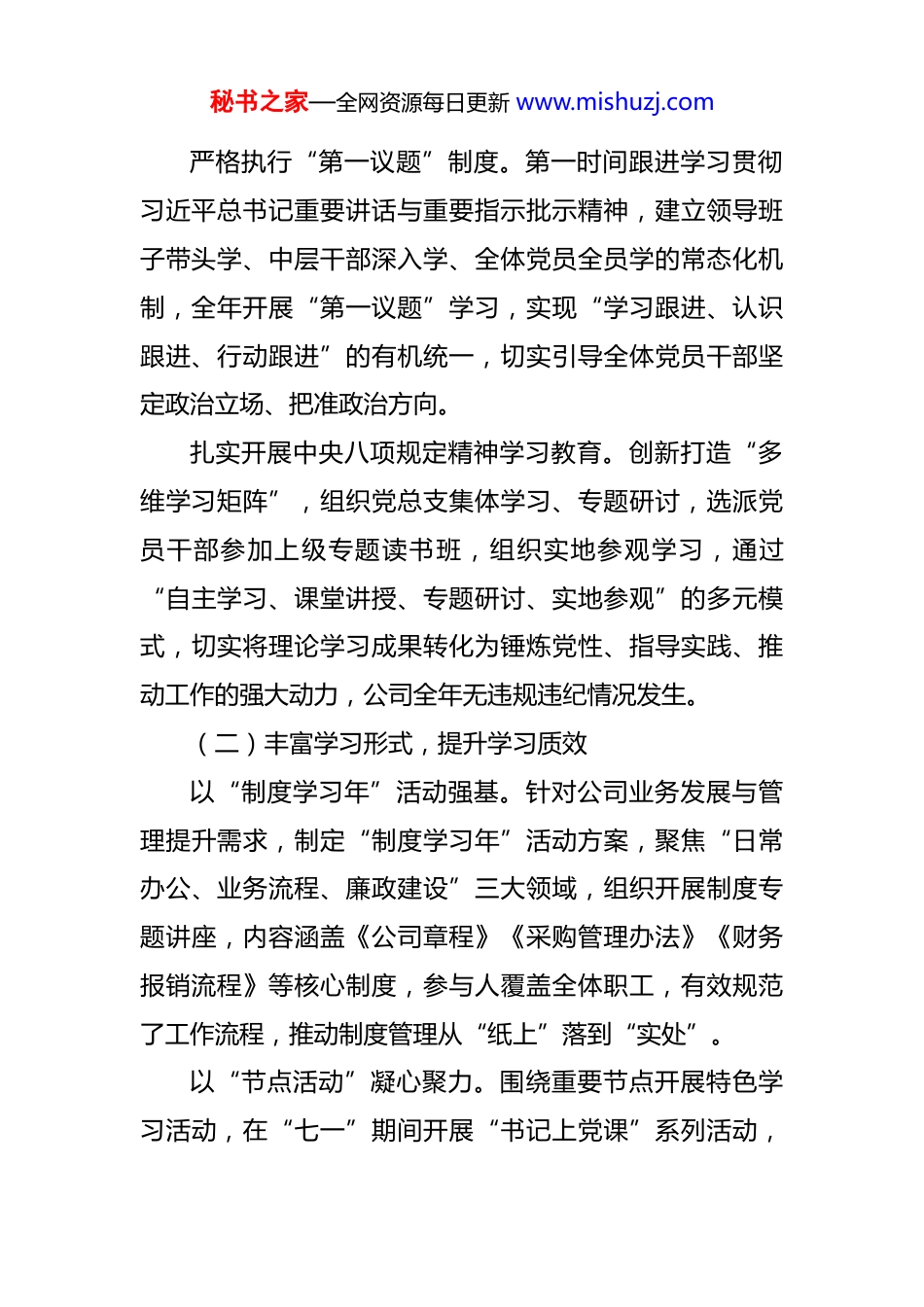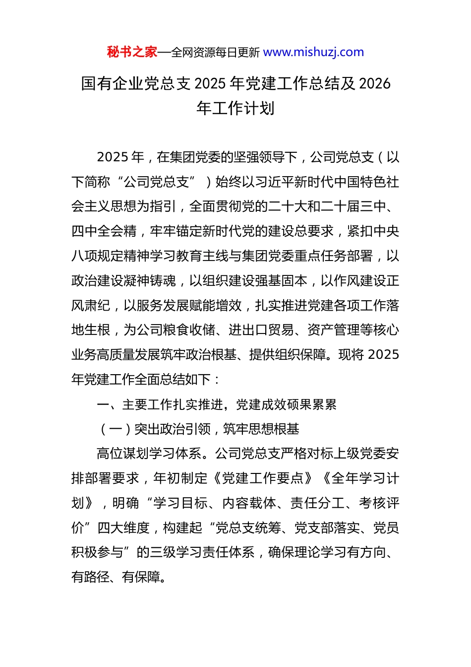 秘书之家—全网资源每日更新 www.mishuzj.com国有企业党总支 2025 年党建工作总结及 2026年工作计划 2025 年,在集团党委的坚强领导下,公司党总支(以下简称“公司党总支”)始终以习近平新时代中国特色社会主义思想为指引,全面贯彻党的二十大和二十届三中、四中全会精,牢牢锚定新时代党的建设总要求,紧扣中央八项规定精神学习教育主线与集团党委重点任务部署,以政治建设凝神铸魂,以组织建设强基固本,以作风建设正风肃纪,以服务发展赋能增效,扎实推进党建各项工作落地生根,为公司粮食收储、进出口贸易、资产管理等核心业务高质量发展筑牢政治根基、提供组织保障。现将 2025年党建工作全面总结如下:一、主要工作扎实推进,党建成效硕果累累(一)突出政治引领,筑牢思想根基高位谋划学习体系。公司党总支严格对标上级党委安排部署要求,年初制定《党建工作要点》《全年学习计划》,明确“学习目标、内容载体、责任分工、考核评价”四大维度,构建起“党总支统筹、党支部落实、党员积极参与”的三级学习责任体系,确保理论学习有方向、有路径、有保障。秘书之家—全网资源每日更新 www.mishuzj.com严格执行“第一议题”制度。第一时间跟进学习贯彻习近平总书记重要讲话与重要指示批示精神,建立领导班子带头学、中层干部深入学、全体党员全员学的常态化机制,全年开展“第一议题”学习,实现“学习跟进、认识跟进、行动跟进”的有机统一,切实引导全体党员干部坚定政治立场、把准政治方向。扎实开展中央八项规定精神学习教育。创新打造“多维学习矩阵”,组织党总支集体学习、专题研讨,选派党员干部参加上级专题读书班,组织实地参观学习,通过“自主学习、课堂讲授、专题研讨、实地参观”的多元模式,切实将理论学习成果转化为锤炼党性、指导实践、推动工作的强大动力,公司全年无违规违纪情况发生。(二)丰富学习形式,提升学习质效以“制度学习年”活动强基。针对公司业务发展与管理提升需求,制定“制度学习年”活动方案,聚焦“日常办公、业务流程、廉政建设”三大领域,组织开展制度专题讲座,内容涵盖《公司章程》《采购管理办法》《财务报销流程》等核心制度,参与人覆盖全体职工,有效规范了工作流程,推动制度管理从“纸上”落到“实处”。以“节点活动”凝心聚力。围绕重要节点开展特色学习活动,在“七一”期间开展“书记上党课”系列活动,秘书之家—全网资源每日更新 www.mishuzj.com组织驻外地库点党员录制“庆七一·我想对党说”视频,传递党员心声。八一建军节开展“铭记血泪史实干建新功”观影活动,组织观看《南京照相馆》,让党员干部接受深刻的思想淬炼与精神洗礼。结合中国人民抗日战争暨世界反法西斯战争胜利 80 周年,组织集体观看纪念大会直播,厚植爱国主义情怀,凝聚奋进力量。系列活动以节点为纽带,以内容为核心,让理论学习从枯燥灌输变为生动浸润,显著提升了学习的吸引力与实效性。(三)坚持学用结合,推动成果转化强化意识形态阵地建设。严格落实意识形态工作责任制,紧扣中央八项规定精神学习教育、2025 年中央一号文件宣传等重点任务,制作宣传展板 X 块。为深化党的二十届四中全会精神学习与集团企业文化宣传贯彻,编制发放《习近平总书记、中央、省委关于“三农”工作指示及应知应会》书籍。订阅《党的生活》等党报党刊,持续巩固和扩大党的宣传思想阵地。创新宣传载体建设。在公司官方公众号开设“深入贯彻中央八项规定精神学习教育”“业务知识课堂”“平凡”“企业资讯”六大特色专题,涵盖党建、业务、职工风采三大类内容。其中“党建口袋”采用“图文+影像”模式,每周推送党建小知识与党史小故事,打破单一文字宣秘书之家—全网资源每日更新 www.mishuzj.com传局限。“业务知识课堂”以“标准化概念+生活化语言”解读业务要点,助力职工提升专业能力。“平凡”专题通过图视文形式展现先进典型,弘扬“宁流千滴汗、不坏一粒粮”的粮食人精神。严格规范信息发布。建立健全信息发布“三审三校”机制,即部门初审、党群部复审、党总支终审;撰稿人初校、部门负责人二校、党群部负责人终校,确保宣传内容政治正...