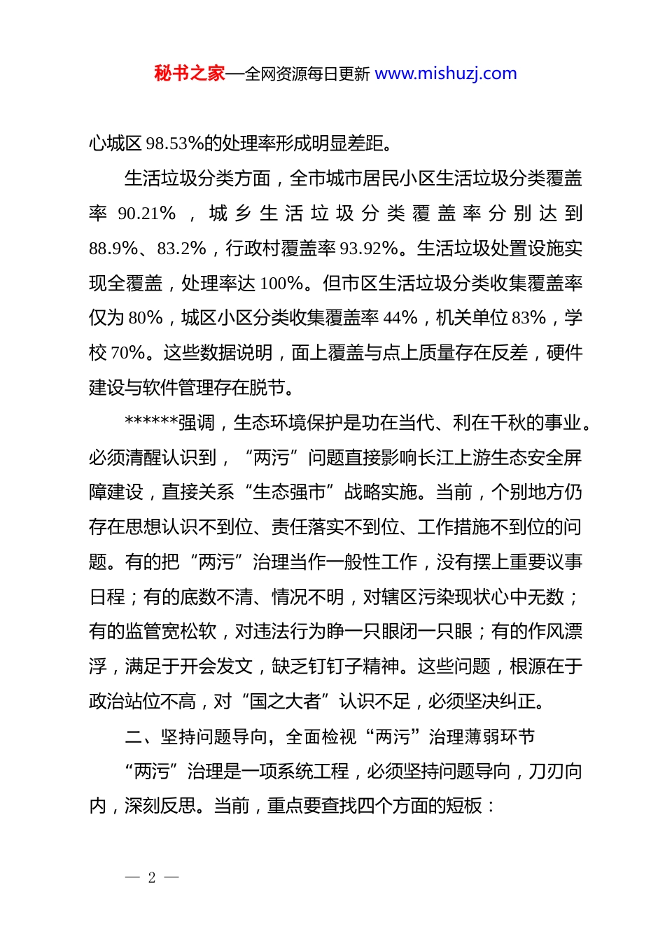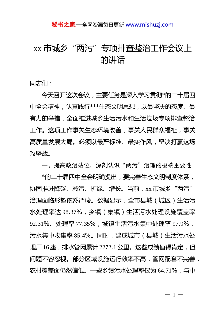 秘书之家—全网资源每日更新 www.mishuzj.comxx 市城乡“两污”专项排查整治工作会议上的讲话同志们:今天召开这次会议,主要任务是深入学习贯彻*的二十届四中全会精神,认真践行***生态文明思想,以最坚决的态度、最有力的举措,全面推进城乡生活污水和生活垃圾专项排查整治工作。这项工作事关生态环境改善,事关人民群众福祉,事关高质量发展大局。必须以最严标准、最实作风,坚决打赢这场攻坚战。一、提高政治站位,深刻认识“两污”治理的极端重要性*的二十届四中全会明确提出,要完善生态文明制度体系,协同推进降碳、减污、扩绿、增长。当前,xx 市城乡“两污”治理面临形势依然严峻。数据显示,全市县城(城区)生活污水处理率达 98.37%,乡镇(集镇)生活污水处理设施覆盖率92.31%、处理率 77.35%,城镇生活污水集中处理率 97.9%,污水集中收集率 85.4%。同时,建成城市(县城)生活污水处理厂 16 座,排水管网累计 2272.1 公里。这些成绩值得肯定,但问题不容忽视。部分区域设施运行效率不高,管网配套不完善,农村覆盖面仍然偏低。一些乡镇污水处理率仅为 64.71%,与中— 1 —秘书之家—全网资源每日更新 www.mishuzj.com心城区 98.53%的处理率形成明显差距。生活垃圾分类方面,全市城市居民小区生活垃圾分类覆盖率 90.21% , 城 乡 生 活 垃 圾 分 类 覆 盖 率 分 别 达 到88.9%、83.2%,行政村覆盖率 93.92%。生活垃圾处置设施实现全覆盖,处理率达 100%。但市区生活垃圾分类收集覆盖率仅为 80%,城区小区分类收集覆盖率 44%,机关单位 83%,学校 70%。这些数据说明,面上覆盖与点上质量存在反差,硬件建设与软件管理存在脱节。******强调,生态环境保护是功在当代、利在千秋的事业。必须清醒认识到,“两污”问题直接影响长江上游生态安全屏障建设,直接关系“生态强市”战略实施。当前,个别地方仍存在思想认识不到位、责任落实不到位、工作措施不到位的问题。有的把“两污”治理当作一般性工作,没有摆上重要议事日程;有的底数不清、情况不明,对辖区污染现状心中无数;有的监管宽松软,对违法行为睁一只眼闭一只眼;有的作风漂浮,满足于开会发文,缺乏钉钉子精神。这些问题,根源在于政治站位不高,对“国之大者”认识不足,必须坚决纠正。二、坚持问题导向,全面检视“两污”治理薄弱环节“两污”治理是一项系统工程,必须坚持问题导向,刀刃向内,深刻反思。当前,重点要查找四个方面的短板:— 2 —秘书之家—全网资源每日更新 www.mishuzj.com第一,治理底数是否清晰。从掌握情况看,全市建成农村生活污水处理设施 144 座,铺设收集管网 400 余千米,完成新改建设施 196 个,标准化运维 3960 个。但设施分布不均衡,部分区域存在空白点。农村生活垃圾收运处置自然村覆盖率96.67%,建成终端处理设施 51 座、垃圾中转站 40 个、垃圾集中收集点 1923 个、公共垃圾桶 17462 个、收运车辆 1820 辆。这些设施运行状况如何,哪些超负荷运转,哪些“晒太阳”,哪些管网缺失,必须逐一摸清。有的县市区对辖区内污染源头、排放去向、处理底数掌握不准,基础台账不健全,动态更新不及时,导致决策缺乏依据,工作缺乏针对性。第二,监管执法是否严格。建成生活污水处理设施 122 座、污水管网 1028 公里,生活垃圾处理设施 51 座,这些设施的日常监管是否到位?进水浓度、出水水质、运行负荷是否实时监测?垃圾焚烧发电厂、电热解焚烧炉 20 座,处理流程是否规范?部分乡镇污水处理厂(站)17 座、管网 102.9 公里,由于专业人才缺乏,运维水平低下,时常出现非正常运行。有的企业主体责任不落实,偷排漏排、超标排放时有发生。有的部门监管责任缺失,执法检查走过场,对违法行为查处不力,没有形成有效震慑。必须以零容忍态度,重拳出击,严惩重罚。第三,设施短板是否补齐。对照国家标准,现有设施能力— 3 —秘书之家—全网资源每日更新 www.mishuzj.com存在缺口。渔农村生活污水标准化运维处理设施行政村覆盖率74.08%,乡村标准公厕 877 座,这些与群众需求仍有差距。部分老旧小区、城乡结...
