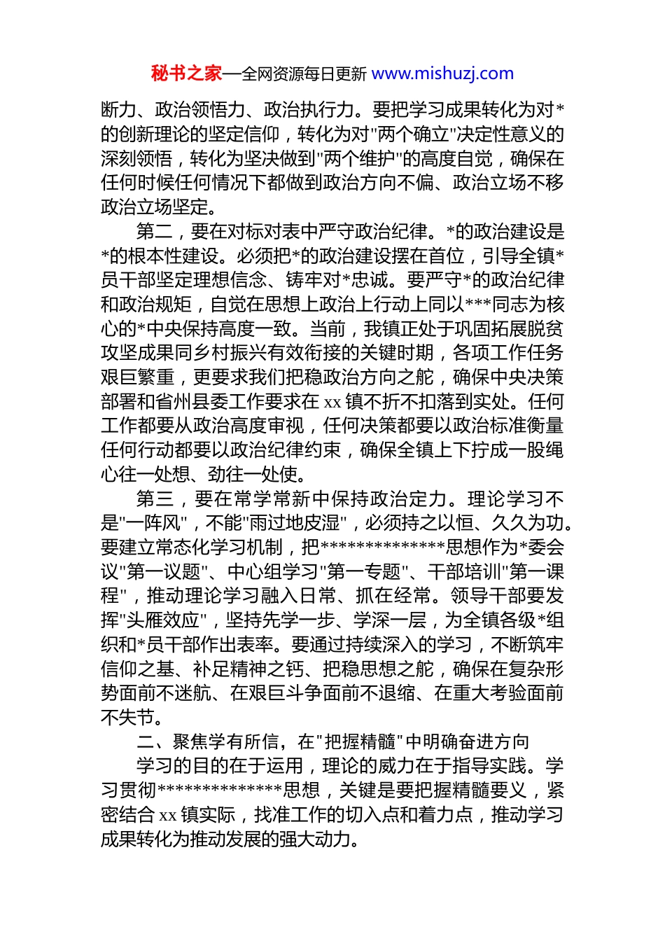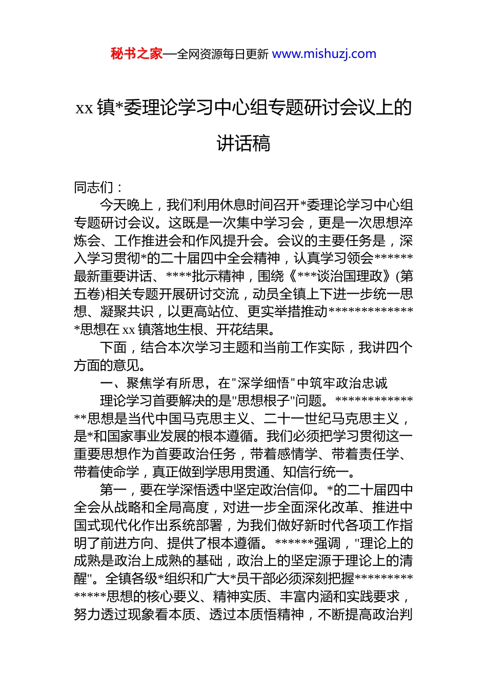 秘书之家—全网资源每日更新 www.mishuzj.comxx 镇*委理论学习中心组专题研讨会议上的讲话稿同志们:今天晚上,我们利用休息时间召开*委理论学习中心组专题研讨会议。这既是一次集中学习会,更是一次思想淬炼会、工作推进会和作风提升会。会议的主要任务是,深入学习贯彻*的二十届四中全会精神,认真学习领会******最新重要讲话、****批示精神,围绕《***谈治国理政》(第五卷)相关专题开展研讨交流,动员全镇上下进一步统一思想、凝聚共识,以更高站位、更实举措推动**************思想在 xx 镇落地生根、开花结果。下面,结合本次学习主题和当前工作实际,我讲四个方面的意见。一、聚焦学有所思,在"深学细悟"中筑牢政治忠诚理论学习首要解决的是"思想根子"问题。**************思想是当代中国马克思主义、二十一世纪马克思主义,是*和国家事业发展的根本遵循。我们必须把学习贯彻这一重要思想作为首要政治任务,带着感情学、带着责任学、带着使命学,真正做到学思用贯通、知信行统一。第一,要在学深悟透中坚定政治信仰。*的二十届四中全会从战略和全局高度,对进一步全面深化改革、推进中国式现代化作出系统部署,为我们做好新时代各项工作指明了前进方向、提供了根本遵循。******强调,"理论上的成熟是政治上成熟的基础,政治上的坚定源于理论上的清醒"。全镇各级*组织和广大*员干部必须深刻把握**************思想的核心要义、精神实质、丰富内涵和实践要求,努力透过现象看本质、透过本质悟精神,不断提高政治判秘书之家—全网资源每日更新 www.mishuzj.com断力、政治领悟力、政治执行力。要把学习成果转化为对*的创新理论的坚定信仰,转化为对"两个确立"决定性意义的深刻领悟,转化为坚决做到"两个维护"的高度自觉,确保在任何时候任何情况下都做到政治方向不偏、政治立场不移政治立场坚定。第二,要在对标对表中严守政治纪律。*的政治建设是*的根本性建设。必须把*的政治建设摆在首位,引导全镇*员干部坚定理想信念、铸牢对*忠诚。要严守*的政治纪律和政治规矩,自觉在思想上政治上行动上同以***同志为核心的*中央保持高度一致。当前,我镇正处于巩固拓展脱贫攻坚成果同乡村振兴有效衔接的关键时期,各项工作任务艰巨繁重,更要求我们把稳政治方向之舵,确保中央决策部署和省州县委工作要求在 xx 镇不折不扣落到实处。任何工作都要从政治高度审视,任何决策都要以政治标准衡量任何行动都要以政治纪律约束,确保全镇上下拧成一股绳心往一处想、劲往一处使。第三,要在常学常新中保持政治定力。理论学习不是"一阵风",不能"雨过地皮湿",必须持之以恒、久久为功。要建立常态化学习机制,把**************思想作为*委会议"第一议题"、中心组学习"第一专题"、干部培训"第一课程",推动理论学习融入日常、抓在经常。领导干部要发挥"头雁效应",坚持先学一步、学深一层,为全镇各级*组织和*员干部作出表率。要通过持续深入的学习,不断筑牢信仰之基、补足精神之钙、把稳思想之舵,确保在复杂形势面前不迷航、在艰巨斗争面前不退缩、在重大考验面前不失节。二、聚焦学有所信,在"把握精髓"中明确奋进方向学习的目的在于运用,理论的威力在于指导实践。学习贯彻**************思想,关键是要把握精髓要义,紧密结合 xx 镇实际,找准工作的切入点和着力点,推动学习成果转化为推动发展的强大动力。秘书之家—全网资源每日更新 www.mishuzj.com第一,要把握发展大势,增强战略定力。当前,xx 镇正处于转型升级、爬坡过坎的关键时期。根据最新统计,2025 年上半年,全镇地区生产总值预计实现同比增长约5.2%,固定资产投资同比增长超过 10%,规模以上工业增加值增长约 7.5%。这些数据充分说明,我镇经济发展基本盘稳固,发展态势持续向好。但也要清醒认识到,我们仍面临产业结构不够优化、发展质量不够高、城乡区域发展不平衡等突出问题。必须立足新发展阶段,完整、准确、全面贯彻新发展理念,主动融入新发展格局,以推动高质量发展为主题,以深化供给侧结构性改革为主线,以改革创新为根本动力,以满足人民日益增长的美好生活需要为根本目的,科学谋划"十五五"时期发展...