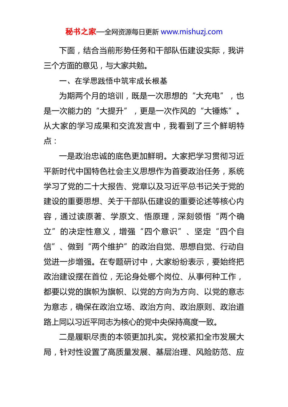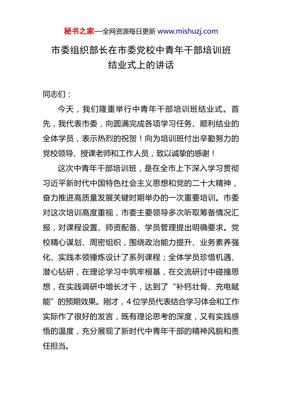 秘书之家—全网资源每日更新 www.mishuzj.com市委组织部长在市委党校中青年干部培训班结业式上的讲话 同志们:今天,我们隆重举行中青年干部培训班结业式。首先,我代表市委,向圆满完成各项学习任务、顺利结业的全体学员,表示热烈的祝贺!向为培训班付出辛勤努力的党校领导、授课老师和工作人员,致以诚挚的感谢!这次中青年干部培训班,是在全市上下深入学习贯彻习近平新时代中国特色社会主义思想和党的二十大精神,奋力推进高质量发展关键时期举办的一次重要培训。市委对这次培训高度重视,市委主要领导多次听取筹备情况汇报,对课程设置、师资配备、学员管理提出明确要求。党校精心谋划、周密组织,围绕政治能力提升、业务素养强化、实践本领锤炼设计了系列课程;全体学员珍惜机遇、潜心钻研,在理论学习中筑牢根基,在交流研讨中碰撞思想,在实践调研中增长才干,达到了“补钙壮骨、充电赋能”的预期效果。刚才,4 位学员代表结合学习体会和工作实际作了很好的发言,既有理论思考的深度,又有实践感悟的温度,充分展现了新时代中青年干部的精神风貌和责任担当。秘书之家—全网资源每日更新 www.mishuzj.com下面,结合当前形势任务和干部队伍建设实际,我讲三个方面的意见,与大家共勉。一、在学思践悟中筑牢成长根基为期两个月的培训,既是一次思想的“大充电”,也是一次能力的“大提升”,更是一次作风的“大锤炼”。从大家的学习成果和交流发言中,我看到了三个鲜明特点:一是政治忠诚的底色更加鲜明。大家把学习贯彻习近平新时代中国特色社会主义思想作为首要政治任务,系统学习了党的二十大报告、党章以及习近平总书记关于党的建设的重要思想、关于干部队伍建设的重要论述等核心内容,通过读原著、学原文、悟原理,深刻领悟“两个确立”的决定性意义,增强“四个意识”、坚定“四个自信”、做到“两个维护”的政治自觉、思想自觉、行动自觉进一步增强。在专题研讨中,大家纷纷表示,要始终把政治建设摆在首位,无论身处哪个岗位、从事何种工作,都要以党的旗帜为旗帜、以党的方向为方向、以党的意志为意志,确保在政治立场、政治方向、政治原则、政治道路上同以习近平同志为核心的党中央保持高度一致。二是履职尽责的本领更加扎实。党校紧扣全市发展大局,针对性设置了高质量发展、基层治理、风险防范、应秘书之家—全网资源每日更新 www.mishuzj.com急处突等实战化课程,邀请了既有理论造诣又有实践经验的领导干部、专家学者授课。大家围绕产业升级、乡村振兴、民生保障等重点课题,深入开展调查研究,形成了 20余篇高质量的调研报告,其中 3 篇已被市委决策参考采纳。在模拟处置突发事件、开展现场接访等实训环节,大家沉着应对、精准施策,展现出较强的问题分析能力和应急处置能力。这充分说明,大家能够主动把学习与工作结合起来,做到了学思用贯通、知信行统一。三是担当作为的作风更加过硬。培训期间,全体学员严格遵守党校“从严治校、从严治教、从严治学”的要求,按时参加学习、认真完成作业,展现了良好的组织纪律性。有的学员克服家庭困难,坚持全勤参与;有的学员利用课余时间查阅资料、交流探讨,学习氛围十分浓厚。在党性教育现场教学中,大家重温入党誓词、缅怀革命先烈,接受了深刻的党性洗礼和精神淬炼,进一步坚定了初心使命,激发了干事创业的精气神。这种勤学善思、求真务实的作风,正是我们干部队伍最需要的品质。在肯定成绩的同时,我们也要清醒地看到,面对新形势新任务,中青年干部队伍还存在一些短板和不足:有的政治判断力、政治领悟力、政治执行力有待提升,对上级决策部署的理解不够透彻、落实不够有力;有的专业素养秘书之家—全网资源每日更新 www.mishuzj.com不匹配,面对新业态、新技术、新领域,存在“本领恐慌”;有的斗争精神不足,面对矛盾问题不敢较真碰硬;有的工作作风不够扎实,存在形式主义、官僚主义倾向。这些问题,既是这次培训要着力解决的重点,也是大家今后成长路上必须攻克的难关。二、以“四型干部”标准砥砺成才习近平总书记强调,“年轻干部是党和国家事业发展的希望,必须筑牢理想信念根基,练就过硬本领...