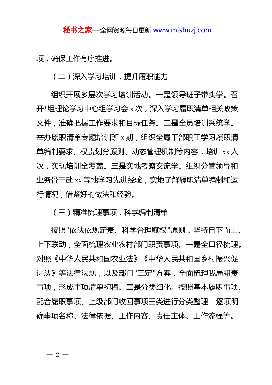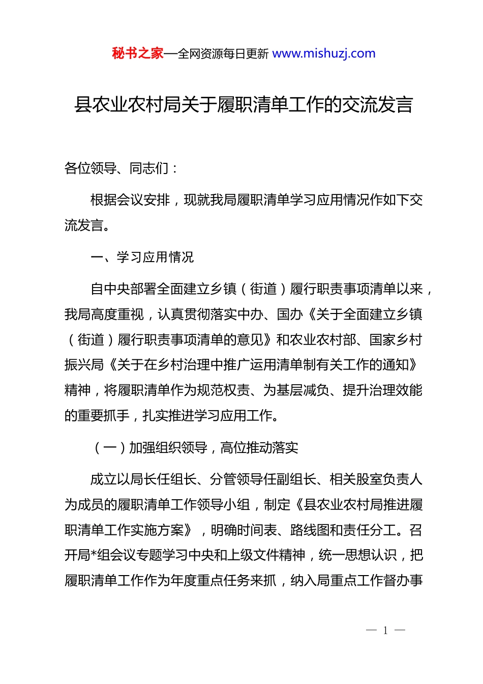 秘书之家—全网资源每日更新 www.mishuzj.com县农业农村局关于履职清单工作的交流发言各位领导、同志们:根据会议安排,现就我局履职清单学习应用情况作如下交流发言。一、学习应用情况自中央部署全面建立乡镇(街道)履行职责事项清单以来,我局高度重视,认真贯彻落实中办、国办《关于全面建立乡镇(街道)履行职责事项清单的意见》和农业农村部、国家乡村振兴局《关于在乡村治理中推广运用清单制有关工作的通知》精神,将履职清单作为规范权责、为基层减负、提升治理效能的重要抓手,扎实推进学习应用工作。(一)加强组织领导,高位推动落实成立以局长任组长、分管领导任副组长、相关股室负责人为成员的履职清单工作领导小组,制定《县农业农村局推进履职清单工作实施方案》,明确时间表、路线图和责任分工。召开局*组会议专题学习中央和上级文件精神,统一思想认识,把履职清单工作作为年度重点任务来抓,纳入局重点工作督办事— 1 —秘书之家—全网资源每日更新 www.mishuzj.com项,确保工作有序推进。(二)深入学习培训,提升履职能力组织开展多层次学习培训活动。一是领导班子带头学。召开*组理论学习中心组学习会 x 次,深入学习履职清单相关政策文件,准确把握工作要求和目标任务。二是全员培训系统学。举办履职清单专题培训班 x 期,组织全局干部职工学习履职清单编制要求、权责划分原则、动态管理机制等内容,培训 xx 人次,实现培训全覆盖。三是实地考察交流学。组织分管领导和业务骨干赴 xx 等地学习先进经验,实地了解履职清单编制和运行情况,借鉴好的做法和经验。(三)精准梳理事项,科学编制清单按照"依法依规定责、科学合理赋权"原则,坚持自下而上、上下联动,全面梳理农业农村部门职责事项。一是全口径梳理。对照《中华人民共和国农业法》《中华人民共和国乡村振兴促进法》等法律法规,以及部门"三定"方案,全面梳理我局职责事项,形成事项清单初稿。二是分类细化。按照基本履职事项、配合履职事项、上级部门收回事项三类进行分类整理,逐项明确事项名称、法律依据、工作内容、责任主体、工作流程等。— 2 —秘书之家—全网资源每日更新 www.mishuzj.com三是反复论证。组织召开座谈会 x 次,广泛征求乡镇、村级组织、服务对象等各方面意见建议,经过"三上三下"反复论证修改,最终形成《县农业农村局履职事项清单》。(四)建立配套机制,确保清单落地制定出台《县农业农村局履职清单动态管理办法》《县农业农村局履职清单监督考核办法》等配套制度 x 项,建立健全清单动态调整、监督考核、责任追究等机制。编制履职事项流程图 xx 个,明确每个事项的办理流程、时限要求、责任主体,通过政府网站、公示栏等途径向社会公开,让干部照单履职、群众按图办事。建立履职清单电子台账,实现清单事项数字化管理,及时跟踪事项办理进度,确保各项职责落实到位。二、取得的成效通过履职清单学习应用,我局在规范权责运行、提升服务效能、促进基层减负等方面取得明显成效。(一)权责边界更加清晰通过编制履职清单,明确了县级农业农村部门与乡镇、村级组织的职责分工,理清了"应该干什么、不该干什么、怎么干好"。梳理出我局基本履职事项 xx 项,主要包括农业产业发展— 3 —秘书之家—全网资源每日更新 www.mishuzj.com规划制定、农业技术推广服务、农产品质量安全监管、动植物疫病防控、农业综合执法、农村人居环境整治指导等;配合履职事项 xx 项,主要包括配合乡镇开展高标准农田建设、美丽乡村建设、农村改厕等;上级部门收回事项 xx 项,主要包括农药生产许可、动物防疫条件审查等专业性强、技术要求高的事项。通过清单化管理,避免了职责交叉、推诿扯皮等问题,实现了权责一致、责能一致。(二)服务效能显著提升履职清单明确了工作流程和办理时限,倒逼我局转变工作作风、优化服务流程、提高办事效率。一是审批时限大幅压缩。农业行政许可事项办理时限平均压缩 xx%,xx 项审批事项实现"一次办结",xx 项实现"网上办理"。二是服务质量明显提高。建立首问负责制、限时办结制、责任追究制,对清单事项实行台账式管理、项目化推...