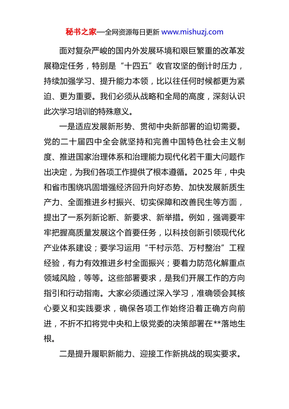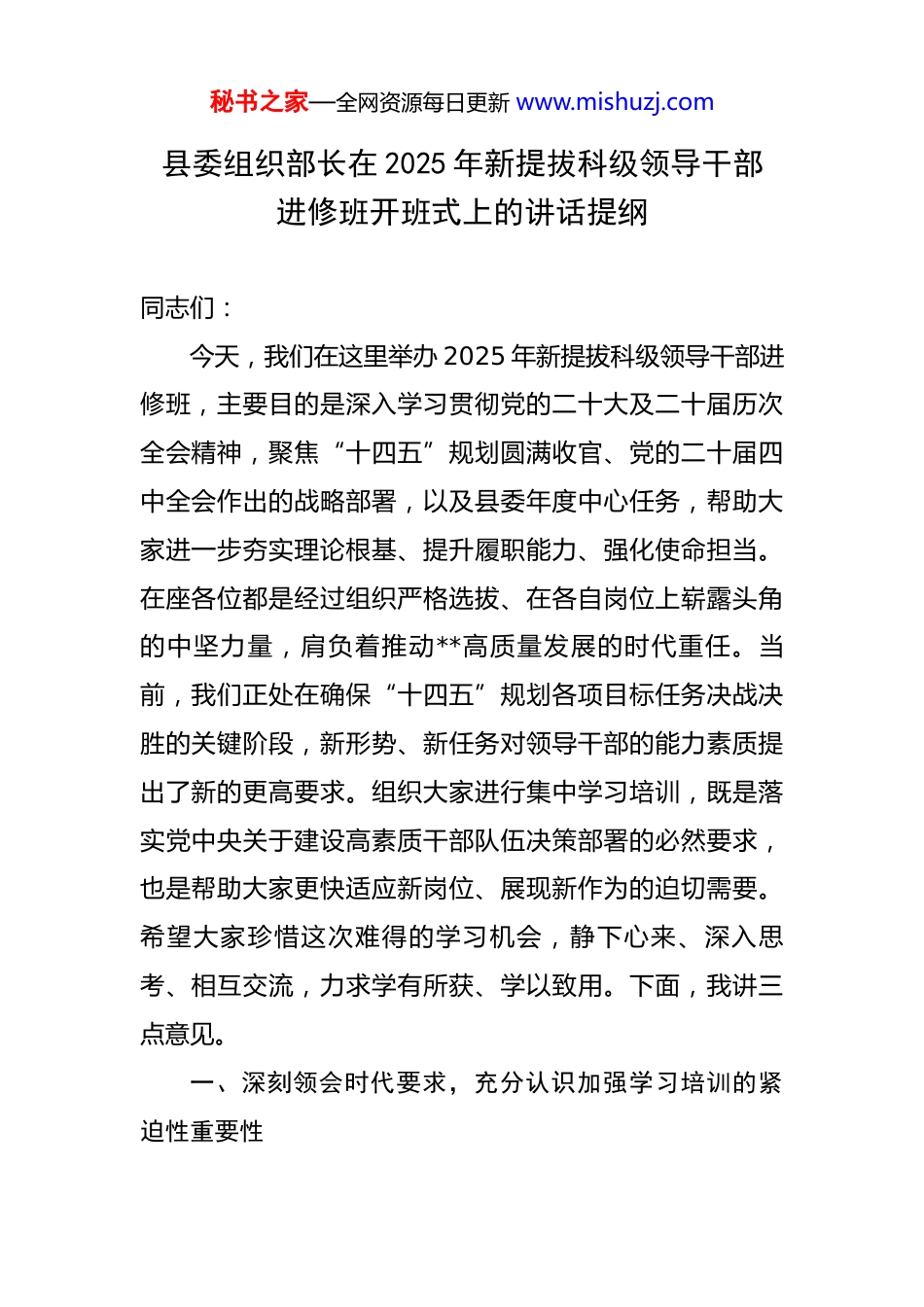 秘书之家—全网资源每日更新 www.mishuzj.com县委组织部长在 2025 年新提拔科级领导干部进修班开班式上的讲话提纲 同志们:今天,我们在这里举办 2025 年新提拔科级领导干部进修班,主要目的是深入学习贯彻党的二十大及二十届历次全会精神,聚焦“十四五”规划圆满收官、党的二十届四中全会作出的战略部署,以及县委年度中心任务,帮助大家进一步夯实理论根基、提升履职能力、强化使命担当。在座各位都是经过组织严格选拔、在各自岗位上崭露头角的中坚力量,肩负着推动**高质量发展的时代重任。当前,我们正处在确保“十四五”规划各项目标任务决战决胜的关键阶段,新形势、新任务对领导干部的能力素质提出了新的更高要求。组织大家进行集中学习培训,既是落实党中央关于建设高素质干部队伍决策部署的必然要求,也是帮助大家更快适应新岗位、展现新作为的迫切需要。希望大家珍惜这次难得的学习机会,静下心来、深入思考、相互交流,力求学有所获、学以致用。下面,我讲三点意见。一、深刻领会时代要求,充分认识加强学习培训的紧迫性重要性秘书之家—全网资源每日更新 www.mishuzj.com面对复杂严峻的国内外发展环境和艰巨繁重的改革发展稳定任务,特别是“十四五”收官攻坚的倒计时压力,持续加强学习、提升能力本领,比以往任何时候都更为紧迫、更为重要。我们必须从战略和全局的高度,深刻认识此次学习培训的特殊意义。一是适应发展新形势、贯彻中央新部署的迫切需要。党的二十届四中全会就坚持和完善中国特色社会主义制度、推进国家治理体系和治理能力现代化若干重大问题作出决定,为我们各项工作提供了根本遵循。2025 年,中央和省市围绕巩固增强经济回升向好态势、加快发展新质生产力、全面推进乡村振兴、切实保障和改善民生等方面,提出了一系列新论断、新要求、新举措。例如,强调要牢牢把握高质量发展这个首要任务,以科技创新引领现代化产业体系建设;要学习运用“千村示范、万村整治”工程经验,有力有效推进乡村全面振兴;要着力防范化解重点领域风险,等等。这些部署要求,是我们开展工作的方向指引和行动指南。大家必须通过深入学习,准确领会其核心要义和实践要求,确保各项工作始终沿着正确方向前进,不折不扣将党中央和上级党委的决策部署在**落地生根。二是提升履职新能力、迎接工作新挑战的现实要求。秘书之家—全网资源每日更新 www.mishuzj.com职务的提升意味着责任的加重。大家从副职到正职,或从较低层级岗位到更关键岗位,工作视野、决策范围、协调难度、负责领域都发生了显著变化。可能会遇到以前未曾接触过的复杂局面,例如,如何统筹推进**个重大项目建设与生态环保约束的关系,如何在财政紧平衡状态下有效保障**项民生实事,如何应对处置涉及**领域的突发性群体事件,等等。这些都对大家的政治判断力、政治领悟力、政治执行力,以及科学决策能力、改革攻坚能力、应急处突能力、群众工作能力、抓落实能力提出了直接考验。学习培训正是为大家提供一个系统“充电”、针对性“补短板”的平台,帮助大家掌握履职所需的新知识、新技能、新方法,尽快成为本职工作的行家里手。三是抢抓发展新机遇、开创事业新局面的重要基础。当前,**县正处在转型突破、爬坡过坎的关键时期。“十四五”规划确定的**项核心指标、**项重点工程,大部分已进入冲刺扫尾阶段,但仍有部分难点堵点需要攻坚。同时,对接国家重大区域战略、培育县域特色产业、推动城乡融合发展等方面,也蕴藏着新的发展机遇。机遇稍纵即逝,挑战无处不在。能否在收官战中交出优异答卷,能否为“十五五”发展奠定坚实基础,很大程度上取决于我们这批骨干力量的认识水平、思维层次和工作干劲。加强学秘书之家—全网资源每日更新 www.mishuzj.com习,就是要让大家进一步认清形势、把握规律、明晰路径,把学习成果转化为谋划工作的思路、促进发展的举措和改进作风的成效,在服务**县大局中展现新担当、实现新作为。二、准确把握核心内容,着力增强学习培训的针对性实效性本次进修班课程设置经过了精心安排,内容涵盖了政治理论、党性教育、能力提升、纪律规矩等多个方面。大家要围绕核心学习内容...