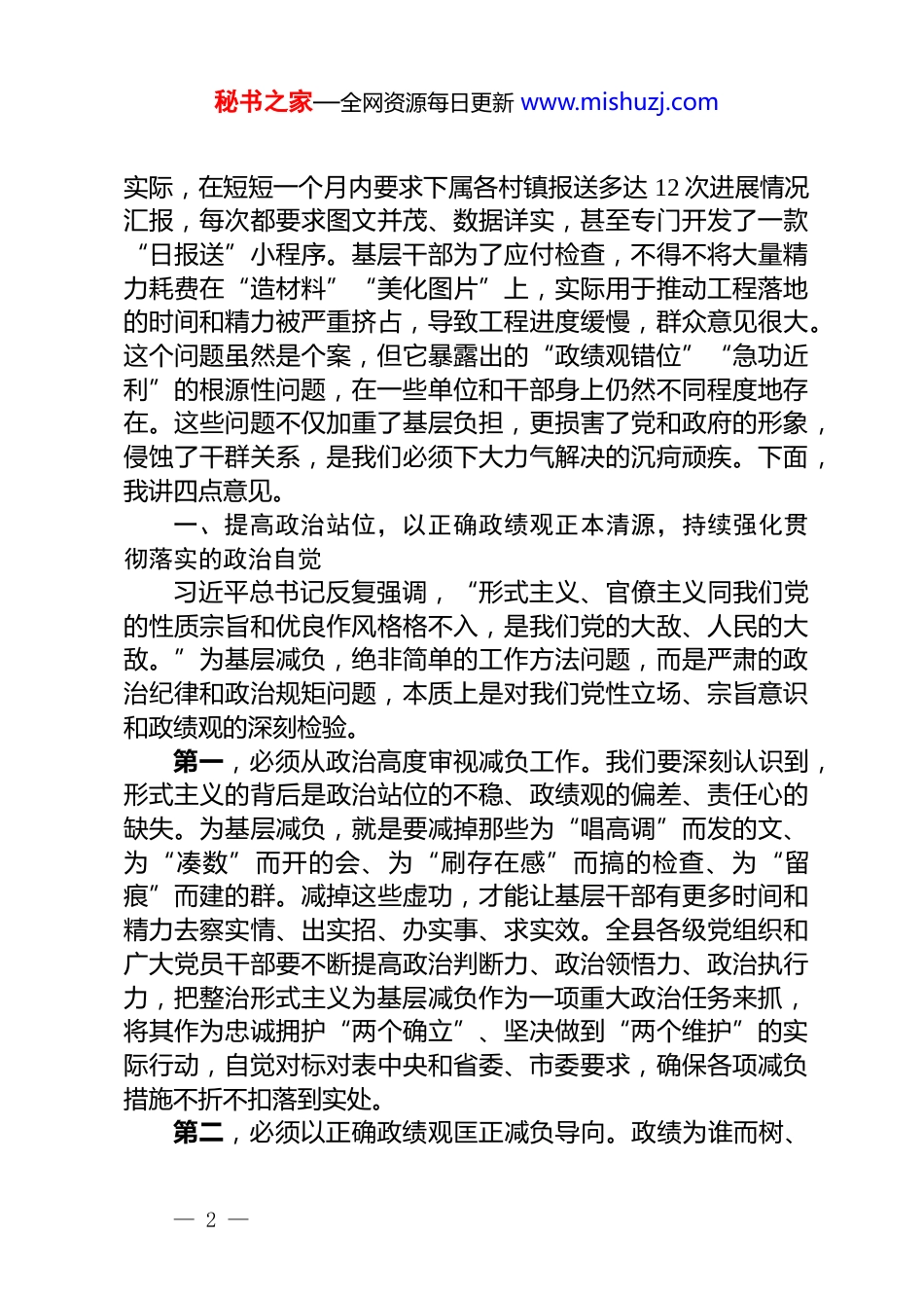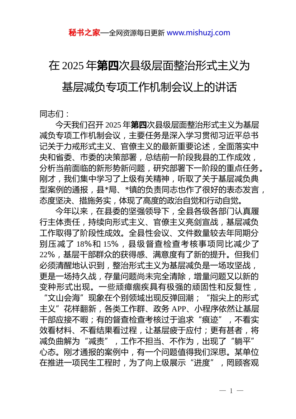 秘书之家—全网资源每日更新 www.mishuzj.com在 2025 年第四次县级层面整治形式主义为基层减负专项工作机制会议上的讲话同志们:今天我们召开 2025 年第四次县级层面整治形式主义为基层减负专项工作机制会议,主要任务是深入学习贯彻习近平总书记关于力戒形式主义、官僚主义的最新重要论述,全面落实中央和省委、市委的决策部署,总结前一阶段我县的工作成效,分析当前面临的新形势新问题,研究部署下一阶段的重点任务。刚才,我们集中学习了上级有关精神,听取了关于基层减负典型案例的通报,县*局、*镇的负责同志也作了很好的表态发言,态度坚决、措施务实,体现了高度的政治自觉和行动自觉。今年以来,在县委的坚强领导下,全县各级各部门认真履行主体责任,持续向形式主义、官僚主义亮剑宣战,基层减负工作取得了阶段性成效。全县性会议、文件数量较去年同期分别压减了 18%和 15%,县级督查检查考核事项同比减少了22%,基层干部群众的获得感、满意度有了新的提升。但我们必须清醒地认识到,整治形式主义为基层减负是一场攻坚战,更是一场持久战,存量问题尚未完全清除,增量问题又以新的变种形式出现。一些顽瘴痼疾具有极强的顽固性和反复性,“文山会海”现象在个别领域出现反弹回潮;“指尖上的形式主义”花样翻新,各类工作群、政务 APP、小程序依然让基层干部应接不暇;有的督查检查考核过于追求“痕迹”,不看实效看材料、不看结果看过程,让基层疲于应付;更有甚者,将减负曲解为“减责”,工作不担当、不作为,出现了“躺平”心态。刚才通报的案例中,有一个问题值得我们深思。某单位在推进一项民生工程时,为了向上级展示“进度”,罔顾客观— 1 —秘书之家—全网资源每日更新 www.mishuzj.com实际,在短短一个月内要求下属各村镇报送多达 12 次进展情况汇报,每次都要求图文并茂、数据详实,甚至专门开发了一款“日报送”小程序。基层干部为了应付检查,不得不将大量精力耗费在“造材料”“美化图片”上,实际用于推动工程落地的时间和精力被严重挤占,导致工程进度缓慢,群众意见很大。这个问题虽然是个案,但它暴露出的“政绩观错位”“急功近利”的根源性问题,在一些单位和干部身上仍然不同程度地存在。这些问题不仅加重了基层负担,更损害了党和政府的形象,侵蚀了干群关系,是我们必须下大力气解决的沉疴顽疾。下面,我讲四点意见。一、提高政治站位,以正确政绩观正本清源,持续强化贯彻落实的政治自觉习近平总书记反复强调,“形式主义、官僚主义同我们党的性质宗旨和优良作风格格不入,是我们党的大敌、人民的大敌。”为基层减负,绝非简单的工作方法问题,而是严肃的政治纪律和政治规矩问题,本质上是对我们党性立场、宗旨意识和政绩观的深刻检验。第一,必须从政治高度审视减负工作。我们要深刻认识到,形式主义的背后是政治站位的不稳、政绩观的偏差、责任心的缺失。为基层减负,就是要减掉那些为“唱高调”而发的文、为“凑数”而开的会、为“刷存在感”而搞的检查、为“留痕”而建的群。减掉这些虚功,才能让基层干部有更多时间和精力去察实情、出实招、办实事、求实效。全县各级党组织和广大党员干部要不断提高政治判断力、政治领悟力、政治执行力,把整治形式主义为基层减负作为一项重大政治任务来抓,将其作为忠诚拥护“两个确立”、坚决做到“两个维护”的实际行动,自觉对标对表中央和省委、市委要求,确保各项减负措施不折不扣落到实处。第二,必须以正确政绩观匡正减负导向。政绩为谁而树、— 2 —秘书之家—全网资源每日更新 www.mishuzj.com树什么样的政绩、靠什么树政绩,是必须回答好的根本性问题。我们追求的政绩,应该是经得起实践、人民和历史检验的实绩,是真正为*高质量发展添砖加瓦的业绩,而不是那些中看不中用的“花架子”、劳民伤财的“形象工程”。要聚焦“让干部有更多时间和精力抓落实”这一核心目标导向,引导全县干部牢固树立和践行正确政绩观。凡是作决策、定政策、推工作,都要首先问一问基层是否欢迎、群众是否答应、执行是否顺畅、效果是否真实。要坚决摒弃“以会议落实会议、以文件落实文件”的路径依赖...