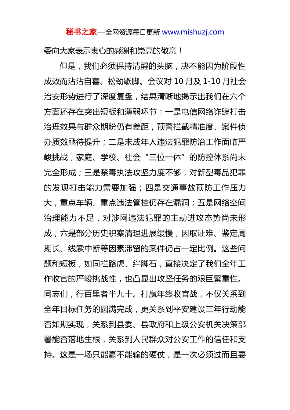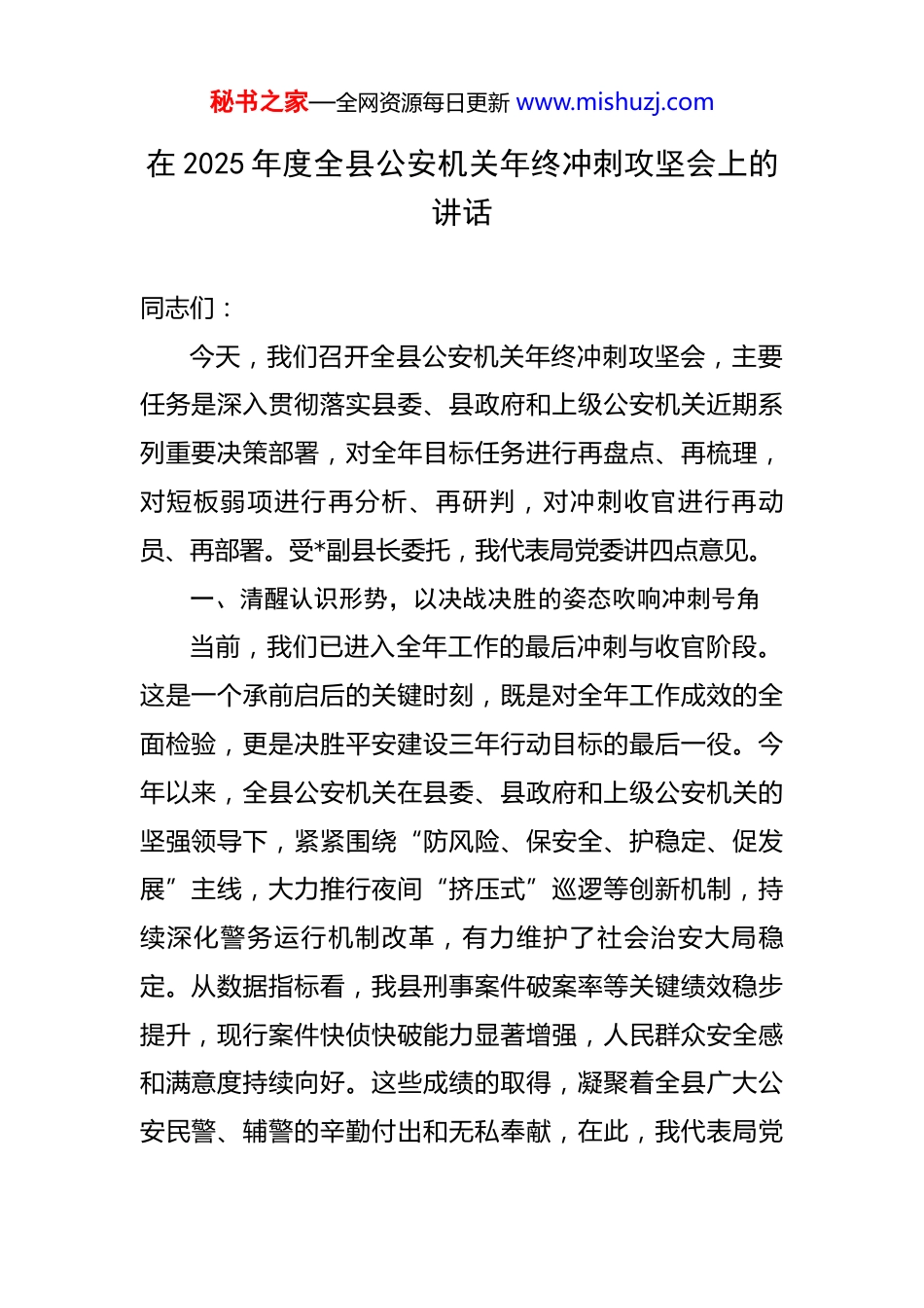 秘书之家—全网资源每日更新 www.mishuzj.com在 2025 年度全县公安机关年终冲刺攻坚会上的讲话 同志们:今天,我们召开全县公安机关年终冲刺攻坚会,主要任务是深入贯彻落实县委、县政府和上级公安机关近期系列重要决策部署,对全年目标任务进行再盘点、再梳理,对短板弱项进行再分析、再研判,对冲刺收官进行再动员、再部署。受*副县长委托,我代表局党委讲四点意见。一、清醒认识形势,以决战决胜的姿态吹响冲刺号角当前,我们已进入全年工作的最后冲刺与收官阶段。这是一个承前启后的关键时刻,既是对全年工作成效的全面检验,更是决胜平安建设三年行动目标的最后一役。今年以来,全县公安机关在县委、县政府和上级公安机关的坚强领导下,紧紧围绕“防风险、保安全、护稳定、促发展”主线,大力推行夜间“挤压式”巡逻等创新机制,持续深化警务运行机制改革,有力维护了社会治安大局稳定。从数据指标看,我县刑事案件破案率等关键绩效稳步提升,现行案件快侦快破能力显著增强,人民群众安全感和满意度持续向好。这些成绩的取得,凝聚着全县广大公安民警、辅警的辛勤付出和无私奉献,在此,我代表局党秘书之家—全网资源每日更新 www.mishuzj.com委向大家表示衷心的感谢和崇高的敬意!但是,我们必须保持清醒的头脑,决不能因为阶段性成效而沾沾自喜、松劲歇脚。会议对 10 月及 1-10 月社会治安形势进行了深度复盘,结果清晰地揭示出我们在六个方面还存在突出短板和薄弱环节:一是电信网络诈骗打击治理效果与群众期盼仍有差距,预警拦截精准度、案件侦办质效亟待提升;二是未成年人违法犯罪防治工作面临严峻挑战,家庭、学校、社会“三位一体”的防控体系尚未完全形成;三是禁毒执法攻坚力度不够,对新型毒品犯罪的发现打击能力需要加强;四是交通事故预防工作压力大,重点车辆、重点违法管控仍存在漏洞;五是网络空间治理能力不足,对涉网违法犯罪的主动进攻态势尚未形成;六是部分历史积案清理进展缓慢,因取证难、鉴定周期长、线索中断等因素滞留的案件仍占一定比例。这些问题和短板,如同拦路虎、绊脚石,直接决定了我们全年工作收官的严峻挑战性,也凸显出攻坚任务的艰巨繁重性。同志们,行百里者半九十。打赢年终收官战,不仅关系到全年目标任务的圆满完成,更关系到平安建设三年行动能否如期实现,关系到县委、县政府和上级公安机关决策部署能否落地生根,关系到人民群众对公安工作的信任和支持。这是一场只能赢不能输的硬仗,是一次必须过而且要秘书之家—全网资源每日更新 www.mishuzj.com过得硬的“大考”。全局上下必须深刻认识这场收官战的全局性、战略性意义,将上级决策部署不折不扣转化为实际行动,将学习教育成果有效转化为维护稳定、打击犯罪、服务群众的强大战斗力。我们要牢牢把握“社会治安秩序良好、生产生活秩序良好、人民群众安全感满意度持续提升”这一根本标尺,以高度的政治自觉和行动自觉,以“等不起”的紧迫感、“慢不得”的危机感、“坐不住”的责任感,全力以赴发起最后冲刺,坚决夺取全年工作的全面胜利!二、聚焦主责主业,以雷霆万钧的力度推进四大攻坚从现在到年底还剩整整 35 天,时间紧迫、任务繁重。我们必须坚持问题导向、目标导向、结果导向,以“咬定青山不放松”的韧劲和“不破楼兰终不还”的决心,聚焦四大重点领域,打好四场攻坚战役。(一)打好积案清理与现案攻坚的“效能提升战”。执法办案是公安机关的主业,是公安工作的生命线。我们要充分发挥“一个指挥部、两个重心、三个专班、四大防区、五项机制、六个专项组”为支撑的警种整体作战组织架构模式和警务协同运行机制优势,向积案和现案全面宣战。在积案清理方面,要对所有未结治安案件和未破刑事案件来一次“大起底”“大清仓”。法制部门要牵头成立秘书之家—全网资源每日更新 www.mishuzj.com积案攻坚专班,对每一起积案建立“一案一档”,实施“三色预警”管理:对因取证难、鉴定周期长、线索中断等因素滞留的积案,分类研判、因案施策、限期办结。要实行局领导包案、所队长领办、办案民警责任制,每周通报进展,半月调度会商,月底对账销号。特别是对群众...