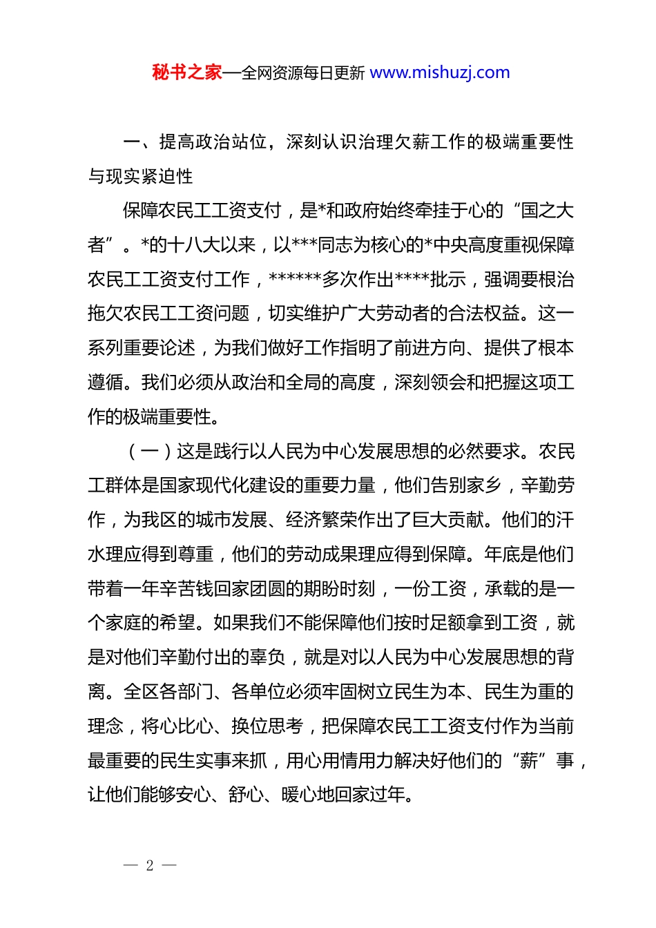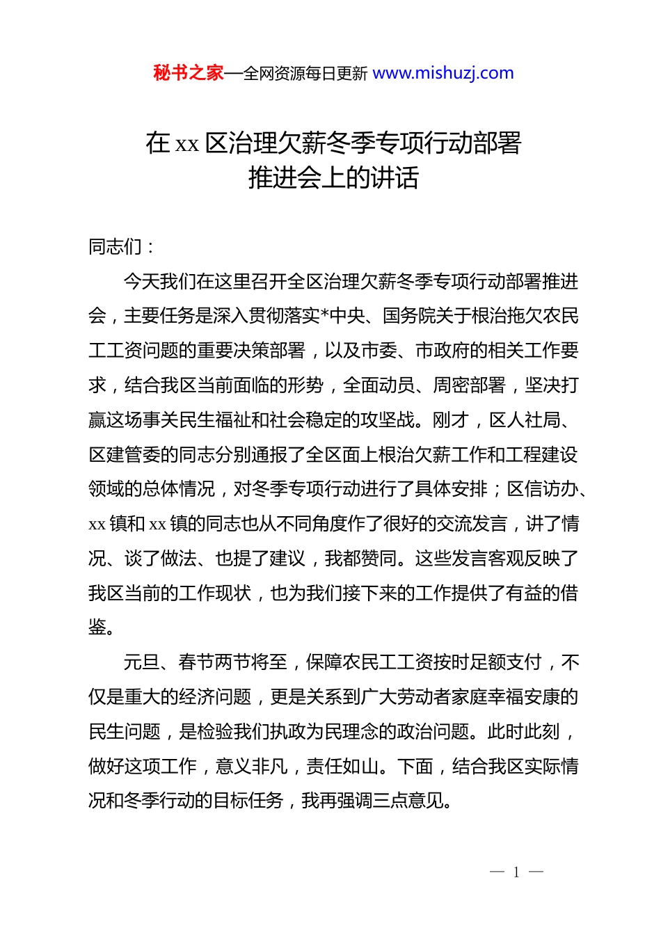 秘书之家—全网资源每日更新 www.mishuzj.com在 xx 区治理欠薪冬季专项行动部署推进会上的讲话同志们:今天我们在这里召开全区治理欠薪冬季专项行动部署推进会,主要任务是深入贯彻落实*中央、国务院关于根治拖欠农民工工资问题的重要决策部署,以及市委、市政府的相关工作要求,结合我区当前面临的形势,全面动员、周密部署,坚决打赢这场事关民生福祉和社会稳定的攻坚战。刚才,区人社局、区建管委的同志分别通报了全区面上根治欠薪工作和工程建设领域的总体情况,对冬季专项行动进行了具体安排;区信访办、xx 镇和 xx 镇的同志也从不同角度作了很好的交流发言,讲了情况、谈了做法、也提了建议,我都赞同。这些发言客观反映了我区当前的工作现状,也为我们接下来的工作提供了有益的借鉴。元旦、春节两节将至,保障农民工工资按时足额支付,不仅是重大的经济问题,更是关系到广大劳动者家庭幸福安康的民生问题,是检验我们执政为民理念的政治问题。此时此刻,做好这项工作,意义非凡,责任如山。下面,结合我区实际情况和冬季行动的目标任务,我再强调三点意见。— 1 —秘书之家—全网资源每日更新 www.mishuzj.com一、提高政治站位,深刻认识治理欠薪工作的极端重要性与现实紧迫性保障农民工工资支付,是*和政府始终牵挂于心的“国之大者”。*的十八大以来,以***同志为核心的*中央高度重视保障农民工工资支付工作,******多次作出****批示,强调要根治拖欠农民工工资问题,切实维护广大劳动者的合法权益。这一系列重要论述,为我们做好工作指明了前进方向、提供了根本遵循。我们必须从政治和全局的高度,深刻领会和把握这项工作的极端重要性。(一)这是践行以人民为中心发展思想的必然要求。农民工群体是国家现代化建设的重要力量,他们告别家乡,辛勤劳作,为我区的城市发展、经济繁荣作出了巨大贡献。他们的汗水理应得到尊重,他们的劳动成果理应得到保障。年底是他们带着一年辛苦钱回家团圆的期盼时刻,一份工资,承载的是一个家庭的希望。如果我们不能保障他们按时足额拿到工资,就是对他们辛勤付出的辜负,就是对以人民为中心发展思想的背离。全区各部门、各单位必须牢固树立民生为本、民生为重的理念,将心比心、换位思考,把保障农民工工资支付作为当前最重要的民生实事来抓,用心用情用力解决好他们的“薪”事,让他们能够安心、舒心、暖心地回家过年。— 2 —秘书之家—全网资源每日更新 www.mishuzj.com(二)这是维护社会大局和谐稳定的坚实基础。当前,我国经济正处于恢复发展的关键时期,外部环境复杂多变,内部改革发展稳定任务艰巨。从我区情况看,经济结构调整、产业转型升级仍在深化,部分行业特别是建筑业、加工制造业等劳动密集型企业,受市场波动、资金链紧张等因素影响,欠薪风险依然存在,甚至在局部领域有抬头趋势。根据区人社局的排查分析,近期我区欠薪隐患相较于去年同期,虽然总体可控,但潜在风险点不容忽视。欠薪问题极易引发群体性事件,激化社会矛盾,一旦处理不当,就可能成为影响社会稳定的导火索。特别是在岁末年初这个关键节点,任何一起欠薪事件都可能被放大,产生连锁反应。因此,我们必须保持清醒头脑,增强忧患意识,把问题想得更复杂一些,把措施准备得更充分一些,坚决守住不发生因欠薪引发大规模群体性事件和社会极端事件的底线,为我区经济社会高质量发展营造安全稳定的社会环境。(三)这是检验政府治理能力和治理水平的试金石。根治欠薪是一项复杂的系统工程,涉及源头预防、过程监管、事后处置等多个环节,考验着政府的综合治理能力。近年来,我区坚决贯彻落实《保障农民工工资支付条例》,不断健全工作机制,在制度建设、日常监管、联合执法等方面取得了显著成效,欠薪案件数量和涉及金额连续几年呈下降趋势。但是,我们也— 3 —秘书之家—全网资源每日更新 www.mishuzj.com要看到,工作中还存在一些短板和不足。比如,部分企业主体责任落实不到位,“一金三制”等源头治理制度在一些项目上还存在执行偏差;部门间信息共享和协同联动机制仍需进一步优化;面对新业态、新模式带来的用工方式变化,我们的监管手...