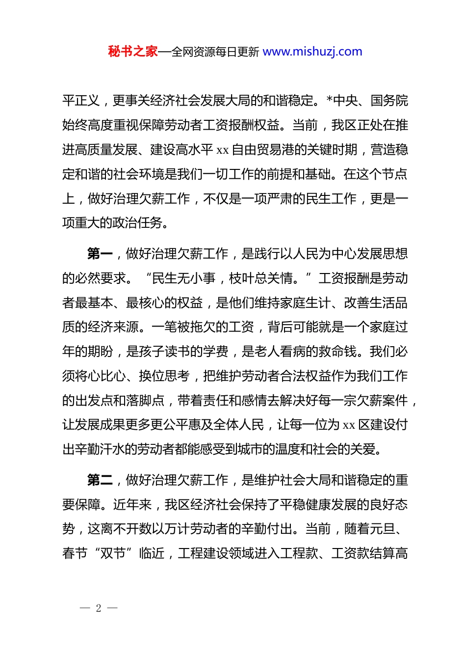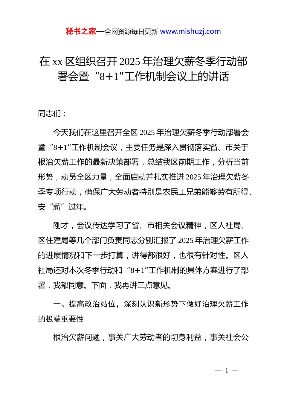 秘书之家—全网资源每日更新 www.mishuzj.com在 xx 区组织召开 2025 年治理欠薪冬季行动部署会暨“8+1”工作机制会议上的讲话同志们:今天我们在这里召开全区 2025 年治理欠薪冬季行动部署会暨“8+1”工作机制会议,主要任务是深入贯彻落实省、市关于根治欠薪工作的最新决策部署,总结我区前期工作,分析当前形势,动员全区力量,全面启动并扎实推进 2025 年治理欠薪冬季专项行动,确保广大劳动者特别是农民工兄弟能够劳有所得、安“薪”过年。刚才,会议传达学习了省、市相关会议精神,区人社局、区住建局等几个部门负责同志分别汇报了 2025 年治理欠薪工作的进展情况和下一步打算,讲得都很好,也很有针对性。区人社局还对本次冬季行动和“8+1”工作机制的具体方案进行了部署,我都同意。下面,我再讲三点意见。一、提高政治站位,深刻认识新形势下做好治理欠薪工作的极端重要性根治欠薪问题,事关广大劳动者的切身利益,事关社会公— 1 —秘书之家—全网资源每日更新 www.mishuzj.com平正义,更事关经济社会发展大局的和谐稳定。*中央、国务院始终高度重视保障劳动者工资报酬权益。当前,我区正处在推进高质量发展、建设高水平 xx 自由贸易港的关键时期,营造稳定和谐的社会环境是我们一切工作的前提和基础。在这个节点上,做好治理欠薪工作,不仅是一项严肃的民生工作,更是一项重大的政治任务。第一,做好治理欠薪工作,是践行以人民为中心发展思想的必然要求。“民生无小事,枝叶总关情。”工资报酬是劳动者最基本、最核心的权益,是他们维持家庭生计、改善生活品质的经济来源。一笔被拖欠的工资,背后可能就是一个家庭过年的期盼,是孩子读书的学费,是老人看病的救命钱。我们必须将心比心、换位思考,把维护劳动者合法权益作为我们工作的出发点和落脚点,带着责任和感情去解决好每一宗欠薪案件,让发展成果更多更公平惠及全体人民,让每一位为 xx 区建设付出辛勤汗水的劳动者都能感受到城市的温度和社会的关爱。第二,做好治理欠薪工作,是维护社会大局和谐稳定的重要保障。近年来,我区经济社会保持了平稳健康发展的良好态势,这离不开数以万计劳动者的辛勤付出。当前,随着元旦、春节“双节”临近,工程建设领域进入工程款、工资款结算高— 2 —秘书之家—全网资源每日更新 www.mishuzj.com峰期,各类欠薪问题也进入了易发多发期。历史经验告诉我们,欠薪问题极易引发群体性事件和极端事件,成为影响社会稳定的重要风险点。我们必须清醒地认识到,防范化解欠薪风险,就是防范化解社会稳定风险。全区各相关部门要树立底线思维,增强忧患意识,把功夫下在平时,把矛盾化解在萌芽,坚决防止因欠薪问题引发大规模群体性事件,为我区高质量发展营造安全稳定的社会环境。第三,做好治理欠薪工作,是优化营商环境、推动高质量发展的现实需要。一个地区的营商环境好不好,劳动者权益保障是最直接的“试金石”之一。一个频发欠薪、劳资纠纷不断的地区,不可能吸引和留住高素质的人才,也不可能获得企业和投资者的长久信赖。当前,我们正在全力打造法治化、国际化、便利化的一流营商环境。依法保障劳动者工资支付,构建和谐稳定的劳动关系,本身就是营商环境的核心组成部分。我们必须通过严格执法、源头治理,让“欠薪可耻、恶意欠薪有罪”的观念深入人心,让守法经营、诚信支付的企业在 xx 区得到更好的发展,从而形成良性循环,助推全区经济社会持续健康发展。二、聚焦重点难点,以雷霆之势和务实之举坚决打赢冬季— 3 —秘书之家—全网资源每日更新 www.mishuzj.com清欠攻坚战冬季专项行动是全年治理欠薪工作的“收官之战”,也是检验我们工作成效的“期末大考”。时间紧、任务重、要求高。全区各部门、各单位必须迅速行动起来,紧盯目标任务,聚焦关键环节,以最高标准、最严要求、最实举压茬推进,确保专项行动取得实实在在的成效。第一,全面排查,做到风险隐患“零死角”。预防是最好的治理。各行业主管部门要立即组织力量,对本领域、本行业的在建工程项目、用人单位进行一次“拉网式”“地毯式”的全面排查。要突出重点领域,紧盯工程建设领域...