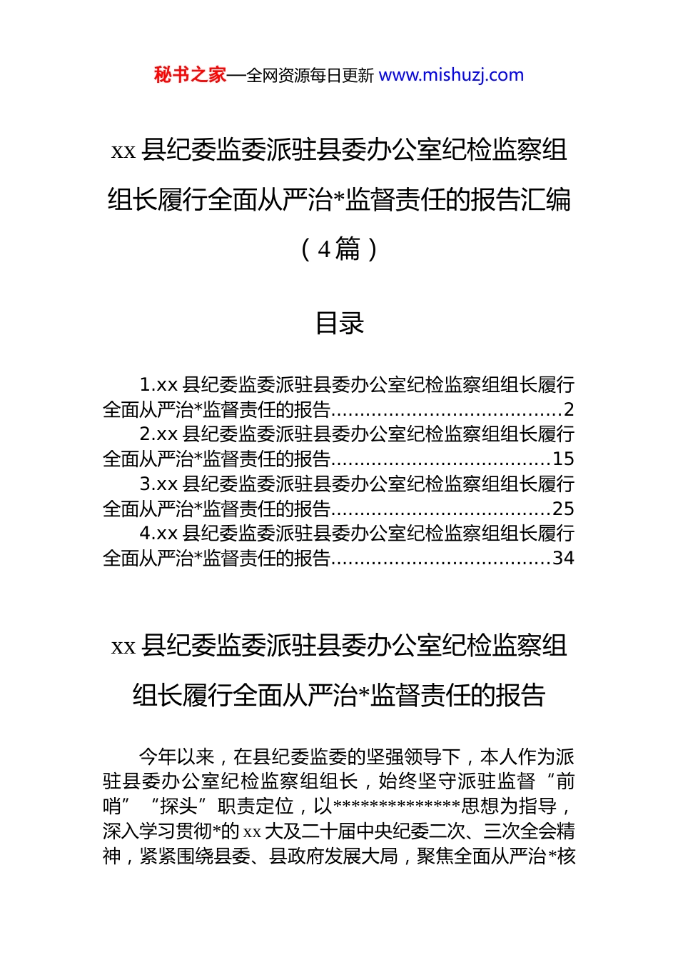 秘书之家—全网资源每日更新 www.mishuzj.comxx 县纪委监委派驻县委办公室纪检监察组组长履行全面从严治*监督责任的报告汇编(4 篇)目录1.xx 县纪委监委派驻县委办公室纪检监察组组长履行全面从严治*监督责任的报告........................................22.xx 县纪委监委派驻县委办公室纪检监察组组长履行全面从严治*监督责任的报告......................................153.xx 县纪委监委派驻县委办公室纪检监察组组长履行全面从严治*监督责任的报告......................................254.xx 县纪委监委派驻县委办公室纪检监察组组长履行全面从严治*监督责任的报告......................................34xx 县纪委监委派驻县委办公室纪检监察组组长履行全面从严治*监督责任的报告今年以来,在县纪委监委的坚强领导下,本人作为派驻县委办公室纪检监察组组长,始终坚守派驻监督“前哨”“探头”职责定位,以**************思想为指导,深入学习贯彻*的 xx 大及二十届中央纪委二次、三次全会精神,紧紧围绕县委、县政府发展大局,聚焦全面从严治*核秘书之家—全网资源每日更新 www.mishuzj.com心任务,精准发力、持续用力,推动监督联系单位全面从严治*各项工作落地见效,为全县营造风清气正劲足的政治生态提供了坚强纪律保障。现将本人履行全面从严治*监督责任情况报告如下:一、提高政治站位,筑牢监督思想根基(一)深化理论武装,把握监督方向全面从严治*,监督是首要职责,政治监督是核心任务。本人始终把强化理论学习作为履行监督责任的前提和基础坚持先学一步、学深一层,带头深入学习******关于全面从严治*、*风廉政建设和反腐败斗争的重要论述,关于加强*的作风建设、*的自我革命的重要思想,深刻领会“两个确立”的决定性意义,增强“四个意识”、坚定“四个自信”、做到“两个维护”。通过参加县纪委监委专题学习、组内集中研讨、个人自学等多种形式,系统学习《中国共产*章程》《中国共产 dj 律处分条例》《*委(*组)落实全面从严治*主体责任规定》等*内法规制度,准确把握新时代纪检监察工作的政治方向、职责使命和实践要求,不断提高政治判断力、政治领悟力、政治执行力,确保监督工作始终沿着正确政治方向前进。同时,督促监督联系单位同步深化理论学习,把******相关重要论述纳入“第一议题”必学内容,推动理论学习与实际工作深度融合,切实把学习成果转化为落实全面从严治*主体责任的思想自觉和行动自觉。(二)强化政治担当,明确监督定位派驻监督本质上是政治监督,必须聚焦“国之大者”,紧扣中心工作。本人始终坚持把监督工作放到全县发展大局中去谋划、去推进,紧紧围绕县委、县政府重点工作部署,找准监督切入点和着力点,做到县委决策部署到哪里监督检查就跟进到哪里。通过定期召开组内工作会议,分析研判监督联系单位全面从严治*形势,明确阶段性监督重点任务,细化监督措施,确保监督不偏向、不走样。同时秘书之家—全网资源每日更新 www.mishuzj.com主动加强与县纪委监委相关科室的沟通对接,及时汇报监督工作进展,争取工作指导和支持,形成上下联动、同向发力的监督格局。针对监督联系单位作为县委中枢机构的特殊地位,突出对贯彻落实*中央重大决策部署、执行*的政治纪律和政治规矩等情况的监督,督促其在政治立场、政治方向、政治原则、政治道路上同*中央保持高度一致,切实发挥“坚强前哨”和“巩固后院”作用。二、聚焦核心任务,精准发力做实政治监督(一)压实主体责任,推动责任落地生根全面从严治*,主体责任是关键。本人始终把督促监督联系单位落实全面从严治*主体责任作为监督工作的重中之重,通过层层传导压力、细化责任清单、强化考核问责,推动主体责任与监督责任同频共振、同向发力。强化学习传导。督促监督联系单位第一时间传达学习******关于全面从严治*、*的作风建设的重要论述,严格执行“第一议题”制度,今年以来,共督促监督联系单位召开“第一议题”学习会 20 余次,确保*中央决策部署和上级纪委工作要求及时传达贯彻。组织监督联系单位深入开展《*委(*组)落实全面从严治*主体责任规定》学习...