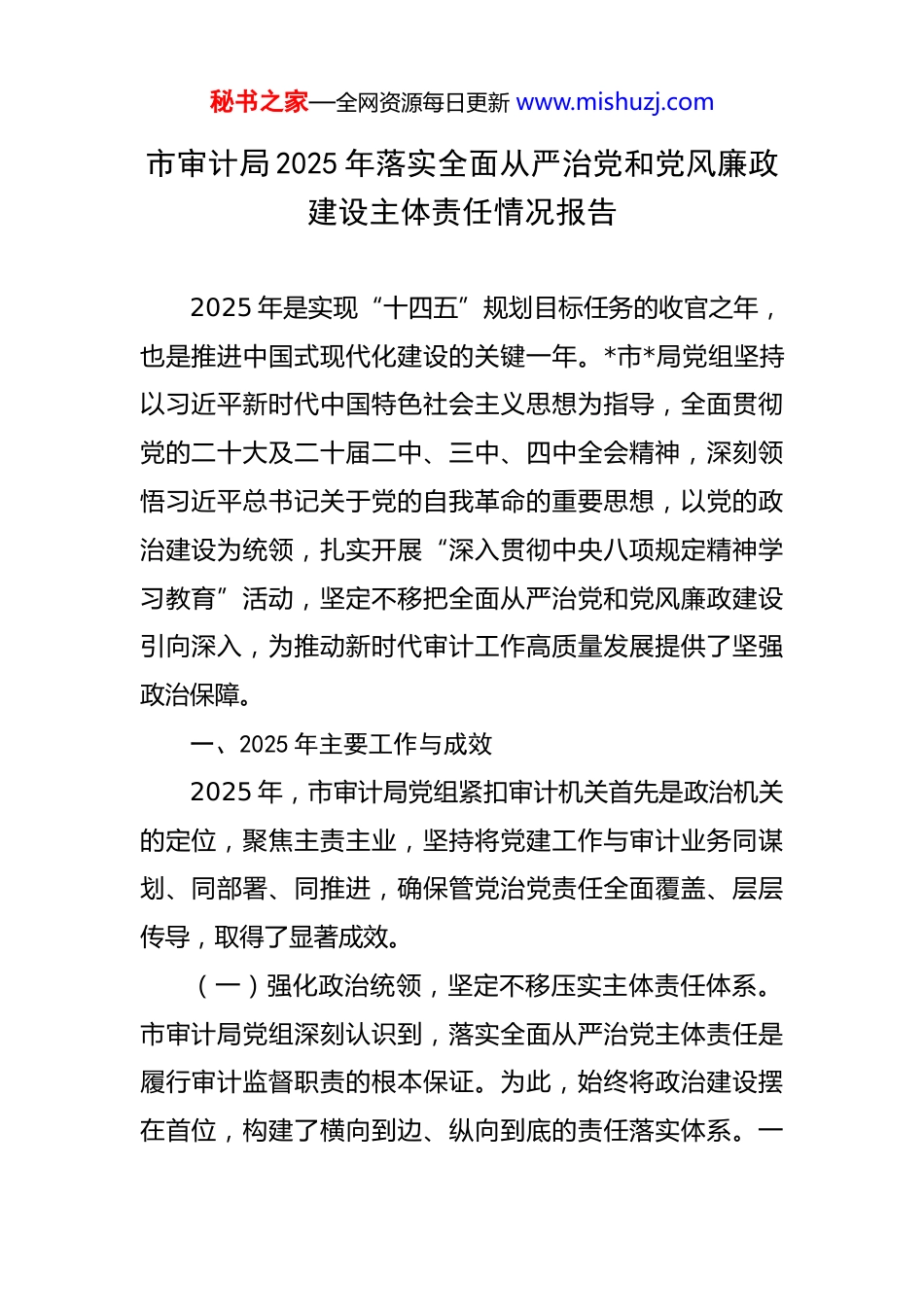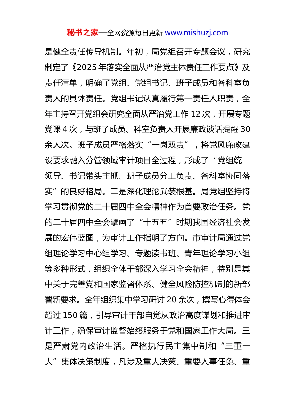 秘书之家—全网资源每日更新 www.mishuzj.com市审计局 2025 年落实全面从严治党和党风廉政建设主体责任情况报告 2025 年是实现“十四五”规划目标任务的收官之年,也是推进中国式现代化建设的关键一年。*市*局党组坚持以习近平新时代中国特色社会主义思想为指导,全面贯彻党的二十大及二十届二中、三中、四中全会精神,深刻领悟习近平总书记关于党的自我革命的重要思想,以党的政治建设为统领,扎实开展“深入贯彻中央八项规定精神学习教育”活动,坚定不移把全面从严治党和党风廉政建设引向深入,为推动新时代审计工作高质量发展提供了坚强政治保障。一、2025 年主要工作与成效2025 年,市审计局党组紧扣审计机关首先是政治机关的定位,聚焦主责主业,坚持将党建工作与审计业务同谋划、同部署、同推进,确保管党治党责任全面覆盖、层层传导,取得了显著成效。(一)强化政治统领,坚定不移压实主体责任体系。市审计局党组深刻认识到,落实全面从严治党主体责任是履行审计监督职责的根本保证。为此,始终将政治建设摆在首位,构建了横向到边、纵向到底的责任落实体系。一秘书之家—全网资源每日更新 www.mishuzj.com是健全责任传导机制。年初,局党组召开专题会议,研究制定了《2025 年落实全面从严治党主体责任工作要点》及责任清单,明确了党组、党组书记、班子成员和各科室负责人的具体责任。党组书记认真履行第一责任人职责,全年主持召开党组会研究全面从严治党工作 12 次,开展专题党课 4 次,与班子成员、科室负责人开展廉政谈话提醒 30余人次。班子成员严格落实“一岗双责”,将党风廉政建设要求融入分管领域审计项目全过程,形成了“党组统一领导、书记带头主抓、班子成员分工负责、各科室协同落实”的良好格局。二是深化理论武装根基。局党组坚持将学习贯彻党的二十届四中全会精神作为首要政治任务。党的二十届四中全会擘画了“十五五”时期我国经济社会发展的宏伟蓝图,为审计工作指明了方向。市审计局通过党组理论学习中心组学习、专题读书班、青年理论学习小组等多种形式,组织全体干部深入学习全会精神,特别是其中关于完善党和国家监督体系、健全风险防控机制的新部署新要求。全年组织集中学习研讨 20 余次,撰写心得体会超过 150 篇,引导审计干部自觉从政治高度谋划和推进审计工作,确保审计监督始终服务于党和国家工作大局。三是严肃党内政治生活。严格执行民主集中制和“三重一大”集体决策制度,凡涉及重大决策、重要人事任免、重秘书之家—全网资源每日更新 www.mishuzj.com大项目安排和大额资金使用等事项,均由党组集体研究决定,确保决策的科学化、民主化。高质量召开年度民主生活会和组织生活会,班子成员及党员干部深入开展批评与自我批评,查摆问题 28 个,制定整改措施 35 条,切实增强了党内政治生活的政治性、时代性、原则性、战斗性。(二)聚焦作风建设,深入贯彻中央八项规定精神。根据党中央统一部署,市审计局将开展“深入贯彻中央八项规定精神学习教育”作为年度重点工作,常抓不懈、久久为功。一是精心组织学习教育。制定并印发了《*市*局关于开展“深入贯彻中央八项规定精神学习教育”的实施方案》,通过“三会一课”、主题党日等载体,组织全体干部重温中央八项规定及其实施细则精神,深入学习习近平总书记关于作风建设的重要论述。邀请市纪委监委专家作专题辅导报告 2 次,组织观看警示教育片 5 部,以案为鉴,用身边事教育身边人,引导干部职工知敬畏、存戒惧、守底线。据统计,全局干部参与学习教育率达到100%,专题测试平均成绩达 95 分以上。二是深化“四风”问题整治。紧盯形式主义、官僚主义新动向新表现,持续精简会议文件,2025 年全局性会议数量同比减少15%,发文数量减少 18%。在审计实践中,坚决反对“走过场”“搞花架子”等问题,要求审计报告和审计取证材秘书之家—全网资源每日更新 www.mishuzj.com料必须实事求是、客观公正。同时,针对违规吃喝、违规收送礼品礼金等顽瘴痼疾,开展常态化监督检查,在节假日前后发送廉洁提醒短信 500 余条次,确保作风建设抓在日常、严在经常。三是构...