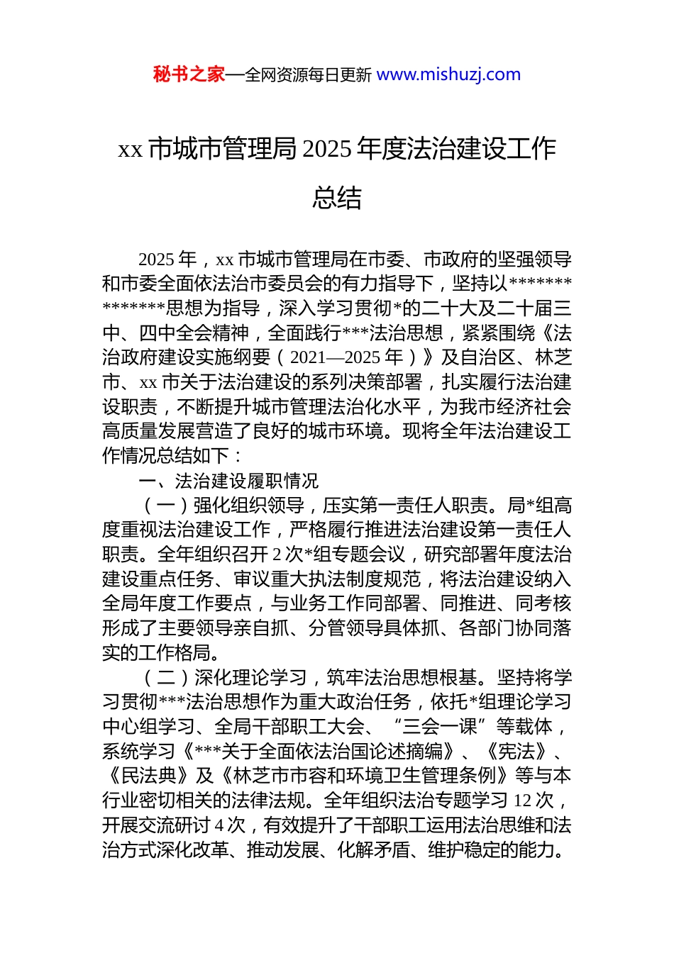 秘书之家—全网资源每日更新 www.mishuzj.comxx 市城市管理局 2025 年度法治建设工作总结2025 年,xx 市城市管理局在市委、市政府的坚强领导和市委全面依法治市委员会的有力指导下,坚持以**************思想为指导,深入学习贯彻*的二十大及二十届三中、四中全会精神,全面践行***法治思想,紧紧围绕《法治政府建设实施纲要(2021—2025 年)》及自治区、林芝市、xx 市关于法治建设的系列决策部署,扎实履行法治建设职责,不断提升城市管理法治化水平,为我市经济社会高质量发展营造了良好的城市环境。现将全年法治建设工作情况总结如下:一、法治建设履职情况(一)强化组织领导,压实第一责任人职责。局*组高度重视法治建设工作,严格履行推进法治建设第一责任人职责。全年组织召开 2 次*组专题会议,研究部署年度法治建设重点任务、审议重大执法制度规范,将法治建设纳入全局年度工作要点,与业务工作同部署、同推进、同考核形成了主要领导亲自抓、分管领导具体抓、各部门协同落实的工作格局。(二)深化理论学习,筑牢法治思想根基。坚持将学习贯彻***法治思想作为重大政治任务,依托*组理论学习中心组学习、全局干部职工大会、“三会一课”等载体,系统学习《***关于全面依法治国论述摘编》、《宪法》、《民法典》及《林芝市市容和环境卫生管理条例》等与本行业密切相关的法律法规。全年组织法治专题学习 12 次,开展交流研讨 4 次,有效提升了干部职工运用法治思维和法治方式深化改革、推动发展、化解矛盾、维护稳定的能力。秘书之家—全网资源每日更新 www.mishuzj.com二、依法履行职能情况(一)坚持依法行政,规范执法行为。全年执法工作秉持“以人为本、劝导为先、执法为民”理念,将柔性执法贯穿于市容管理、环境卫生、市政设施监管等各环节。通过教育、劝导、提醒等非强制性方式,纠正各类轻微违法行为,实现了全年行政处罚案件“零发生”,体现了执法温度,促进了社会和谐。全面推行行政执法公示、执法全过程记录、重大执法决定法制审核“三项制度”,确保执法活动公开透明、规范有序。(二)优化营商环境,提升服务效能。依托机构改革成效,深入推进“放管服”改革。严格落实《xx 市城市管理局轻微不罚、首违不罚清单》,对首次、轻微且未造成危害后果的违法行为,以劝导规范为主,切实为市场主体减负松绑。全年适用“免罚清单”处理案件 59 起,有效激发了市场活力,得到了社会主体的普遍认可。三、法治宣传教育工作严格落实“谁执法谁普法”普法责任制,紧密结合“八五”普法规划,深入开展法律“进社区、进商铺、进工地”等活动。利用“国家宪法日”、“民法典宣传月”等重要节点,通过设置宣传点、发放资料、现场讲解等方式,面向管理服务对象和社会公众广泛宣传城市管理领域法律法规。全年开展各类普法宣传活动 4 场次,覆盖群众约5000 人次,市民法治意识和文明素养得到进一步提升。四、制度建设与执行情况(一)健全内部制度体系。围绕权力运行关键环节,修订完善了《行政执法事项清单》等内部管理制度,进一步明晰职责权限,规范工作流程,扎紧制度笼子。(二)严格规范性文件与决策管理。严格执行规范性文件制定程序和备案审查制度。坚持重大行政决策集体讨论决定,确保所有重大决策均经过合法性审查,严格履行公众参与、专家论证、风险评估等法定程序,保障决策的秘书之家—全网资源每日更新 www.mishuzj.com科学性、民主性与合法性。五、存在的问题与不足(一)队伍法治素养有待提升。部分执法人员长期侧重于劝导沟通,在复杂案件的法律适用、证据固定、调查取证程序规范化等方面存在短板,运用法治思维解决疑难问题的能力需进一步加强。聘请法律顾问,提升法治相关工作专业性。(二)行政处罚实战能力需加强。“全年零处罚”在体现执法柔性的同时,也反映出在必要情况下,依法、规范实施行政处罚的实战经验有所欠缺,对“免罚”与“必罚”的界限把握需更精准,行政处罚作为法律保障手段的作用有待进一步落实。(三)执法监督效能有待深化。内部执法监督的精准性和实效性有待提高,对执法全过程的质量管控和跟踪问效机制需进一步...