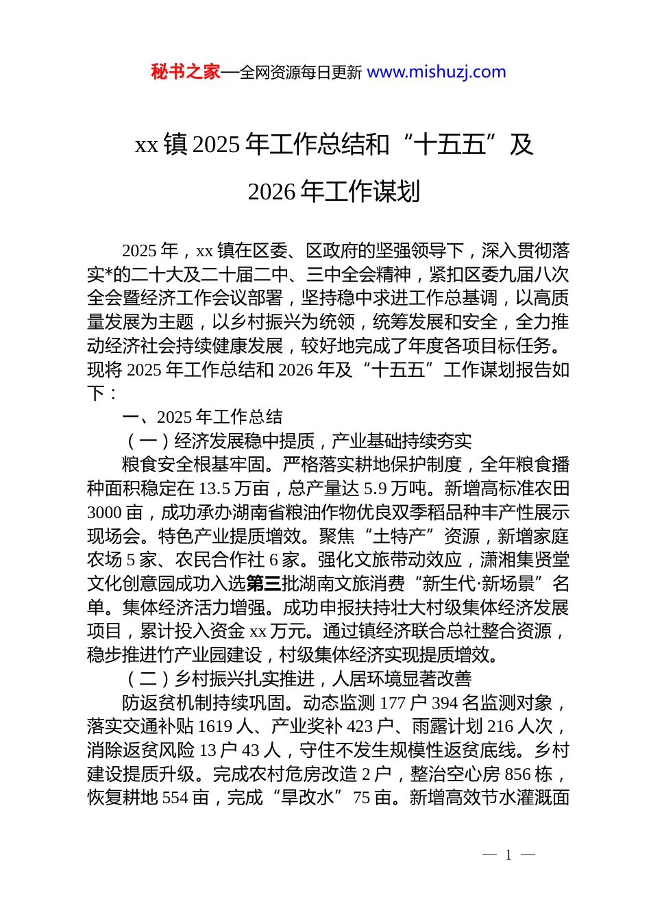 秘书之家—全网资源每日更新 www.mishuzj.comxx 镇 2025 年工作总结和“十五五”及2026 年工作谋划2025 年,xx 镇在区委、区政府的坚强领导下,深入贯彻落实*的二十大及二十届二中、三中全会精神,紧扣区委九届八次全会暨经济工作会议部署,坚持稳中求进工作总基调,以高质量发展为主题,以乡村振兴为统领,统筹发展和安全,全力推动经济社会持续健康发展,较好地完成了年度各项目标任务。现将 2025 年工作总结和 2026 年及“十五五”工作谋划报告如下:一、2025 年工作总结(一)经济发展稳中提质,产业基础持续夯实粮食安全根基牢固。严格落实耕地保护制度,全年粮食播种面积稳定在 13.5 万亩,总产量达 5.9 万吨。新增高标准农田3000 亩,成功承办湖南省粮油作物优良双季稻品种丰产性展示现场会。特色产业提质增效。聚焦“土特产”资源,新增家庭农场 5 家、农民合作社 6 家。强化文旅带动效应,潇湘集贤堂文化创意园成功入选第三批湖南文旅消费“新生代·新场景”名单。集体经济活力增强。成功申报扶持壮大村级集体经济发展项目,累计投入资金 xx 万元。通过镇经济联合总社整合资源,稳步推进竹产业园建设,村级集体经济实现提质增效。(二)乡村振兴扎实推进,人居环境显著改善防返贫机制持续巩固。动态监测 177 户 394 名监测对象,落实交通补贴 1619 人、产业奖补 423 户、雨露计划 216 人次,消除返贫风险 13 户 43 人,守住不发生规模性返贫底线。乡村建设提质升级。完成农村危房改造 2 户,整治空心房 856 栋,恢复耕地 554 亩,完成“旱改水”75 亩。新增高效节水灌溉面— 1 —秘书之家—全网资源每日更新 www.mishuzj.com积 6780 亩,新修机耕道 64.62 千米。治理效能持续提升。推广“屋场会”“乡村合议庭”等基层治理模式,全年调处矛盾纠纷 70 余件。成功创建“无毒村(社区)”12 个。(三)民生福祉持续增进,社会大局和谐稳定社会保障兜牢底线。发放农村及城市低保、残疾人两项补贴、特困人员供养、临时救助等保障金共计 xx 万元。。公共服务优化升级。完成易地扶贫搬迁安置点道路拓宽与饮用水改造工程,惠及 140 余户群众。成立老年互助社结对帮扶近 400 名高龄老人。创新“1+1+1+n”家庭医生签约模式,开展健康体检公益行动,惠及 4500 余人。安全底线筑牢筑实。开展安全生产、消防等各类检查整治行动 117 次,排查整改安全隐患点 91处。劝返核减滞留境外涉诈重点人员 5 名。“利剑护蕾”专项行动实现留守儿童、单亲家庭女童等重点群体包保全覆盖。(四)*的建设全面加强,引领作用充分发挥理论武装持续深化。领导班子带头学,严格落实“第一议题”制度,开展*委理论学习中心组学习 14 次。支部组织深入学,推动理论学习走深走实,*员轮训覆盖千余名*员。队伍建设提质增效。提前谋划村“两委”换届工作,通过举办人才选拔考试,储备村级后备干部 72 名。发展*员 25 名,设立*员先锋岗 39 个。*风建设纵深推进。开展 dj 警示教育 6 次,主动排查并解决问题 28 个,领办民生实事 15 件。收到并查处问题线索 19 条,运用“多种形态”处理 14 人。二、2026 年及“十五五”工作谋划根据省“三高四新”战略,市“三区两城”构思,区“四区两城”工作部署,结合我镇实际,制定“三域一镇”的工作思路。(一)精心建设高质量 dj 引领社会治理示范区域以高站位和政治觉悟,抓好 dj,以*员管理“137”模式,“五帮五带”、“组团联村”、“五联系五到位”等为抓手,— 2 —秘书之家—全网资源每日更新 www.mishuzj.com以人居环境整治和社会矛盾纠纷化解为突破口,以农业产业升级和村集体经济发展为带动引擎,构建以**************思想为指引的乡村社会治理新架构,让“枫桥经验”落地,社会安定和谐。(二)打造 20 分钟城市圈后花园区域全力推动黄太线(s339)提质改造项目尽快实施,将上大线纳入项目建设笼子,两大交通大动脉打通,迅速融入服务“一核两轴三圈”区域经济发展区大局,利用特色农业优势和区域纵深发展多种经济形式,最大化聚集区域吸引力,成为三地群...