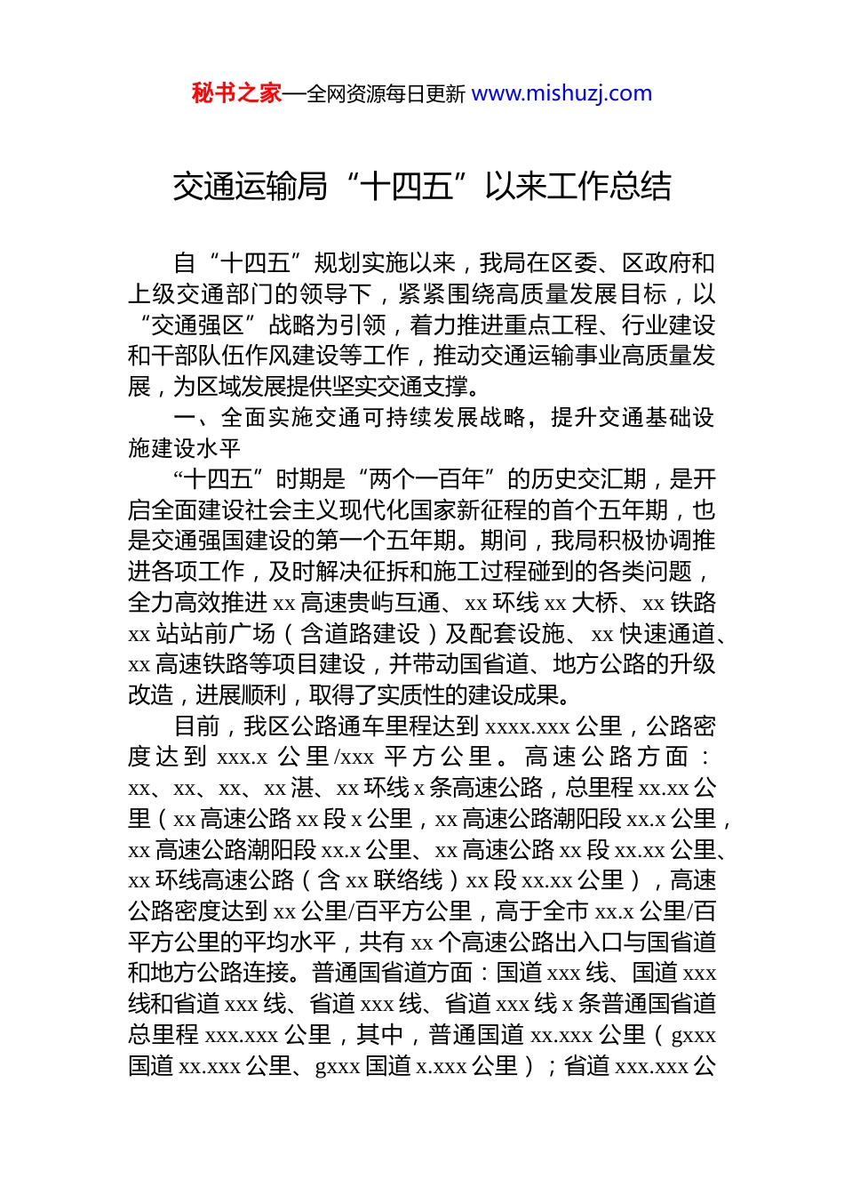 秘书之家—全网资源每日更新 www.mishuzj.com交通运输局“十四五”以来工作总结自“十四五”规划实施以来,我局在区委、区政府和上级交通部门的领导下,紧紧围绕高质量发展目标,以“交通强区”战略为引领,着力推进重点工程、行业建设和干部队伍作风建设等工作,推动交通运输事业高质量发展,为区域发展提供坚实交通支撑。一、全面实施交通可持续发展战略,提升交通基础设施建设水平 “十四五”时期是“两个一百年”的历史交汇期,是开启全面建设社会主义现代化国家新征程的首个五年期,也是交通强国建设的第一个五年期。期间,我局积极协调推进各项工作,及时解决征拆和施工过程碰到的各类问题,全力高效推进 xx 高速贵屿互通、xx 环线 xx 大桥、xx 铁路xx 站站前广场(含道路建设)及配套设施、xx 快速通道、xx 高速铁路等项目建设,并带动国省道、地方公路的升级改造,进展顺利,取得了实质性的建设成果。目前,我区公路通车里程达到 xxxx.xxx 公里,公路密度 达 到 xxx.x 公 里 /xxx 平 方 公 里 。 高 速 公 路 方 面 :xx、xx、xx、xx 湛、xx 环线 x 条高速公路,总里程 xx.xx 公里(xx 高速公路 xx 段 x 公里,xx 高速公路潮阳段 xx.x 公里,xx 高速公路潮阳段 xx.x 公里、xx 高速公路 xx 段 xx.xx 公里、xx 环线高速公路(含 xx 联络线)xx 段 xx.xx 公里),高速公路密度达到 xx 公里/百平方公里,高于全市 xx.x 公里/百平方公里的平均水平,共有 xx 个高速公路出入口与国省道和地方公路连接。普通国省道方面:国道 xxx 线、国道 xxx线和省道 xxx 线、省道 xxx 线、省道 xxx 线 x 条普通国省道总里程 xxx.xxx 公里,其中,普通国道 xx.xxx 公里(gxxx国道 xx.xxx 公里、gxxx 国道 x.xxx 公里);省道 xxx.xxx 公秘书之家—全网资源每日更新 www.mishuzj.com里(sxxx 省道 xx.xxx 公里、sxxx 省道 xx.xxx 公里、sxxx 省道 xx.xx 公里)。地方公路方面:地方公路总里程 xxxx.xxx公里,其中,县道 xxx.xxx 公里;乡道 xxx.xxx 公里;村道xxx.xxx 公里。铁路方面:共有 xx 铁路、xx 铁路 x 条高铁,总里程约 xx 公里,其中,xx 高铁 xx 境内约 xx 公里,并在xx 镇设有 xx 铁路 xx 站;xx 铁路 xx 境内约 x 公里。二、加大道路管养力度,优化道路交通环境一如以往认真做好潮阳区国省道公路管理、养护工作,进一步提高公路养护管理水平,全力保障公路路面的通畅和美观,建设安全干净、通畅美观的行车环境。期间,累计清理垃圾杂草废土约 xxxxx 吨,修补破损路面 xxxxx 平方米,修剪国省道乔木约 xxxx 株,清理枯树 xxx 株,修剪中央绿化带约 xxx 万平方米,清除中央绿化带杂草约 xxx 万平方米,清除国道 xxx 线、省道 sxxx 线及 xxx 线路肩杂草约xxx 万平方米,出色的完成了上级交付的各项任务。同时加强公路路政巡查,及时发现并落实清理和整治各类违规占用道路、污染公路等行为,依法维护好辖区公路产权。期间巡查公路累计约 xxxxxx 公里,出动人员约 xxxxx 人次,车辆 xxxx 车次,清理国省道摆摊设点累计 xxx 宗次,路面受污染要求业主们清扫、冲洗路面累计 xxx 宗次、清理移动式广告牌累计 xxx 块。三、推进公共交通规划建设工作,促进交通服务均等化持续深化道路运输行业日常监管,推动行业发展迈向规模化、规范化新阶段。一方面,聚焦站牌站点建设,优化城乡客运运营环境。结合全区道路改造进度及客运线路走向实际,统筹推进公交、农客停车站亭牌建设与升级,持续完善城乡客运配套设施,全力打造安全、文明、舒适便捷的乘车环境。截至目前,已新设置及改造公交、农客站亭(牌)xx 个。另一方面,通过引导公交企业自主投入,加快新能源公交车更新迭代与陈旧破损车辆淘汰进度;同秘书之家—全网资源每日更新 www.mishuzj.com时,持续优化公交线路布局,进一步提升公交网络覆盖率与线网运行效率,成功实现全区 xxx 个行政村“村村通客车”全覆盖目标。四、强化港口日常管理监督,促进港口建设有序发展...